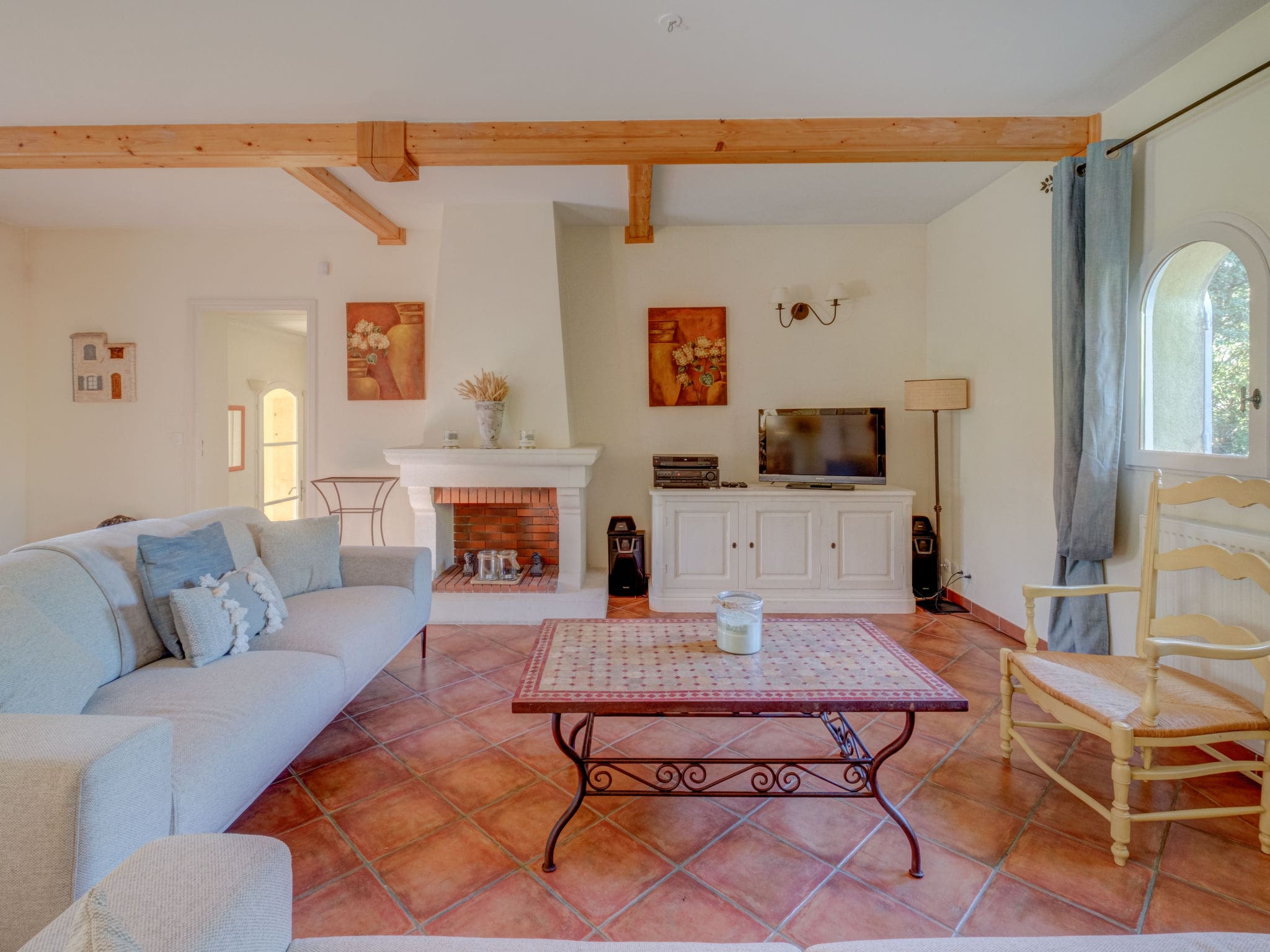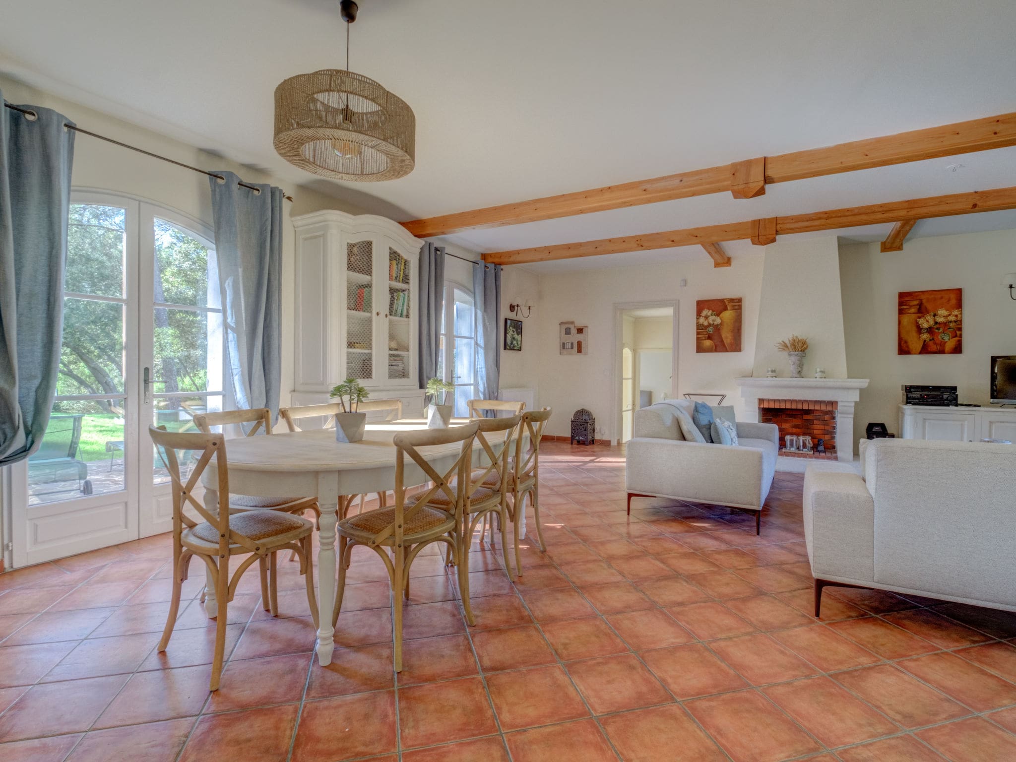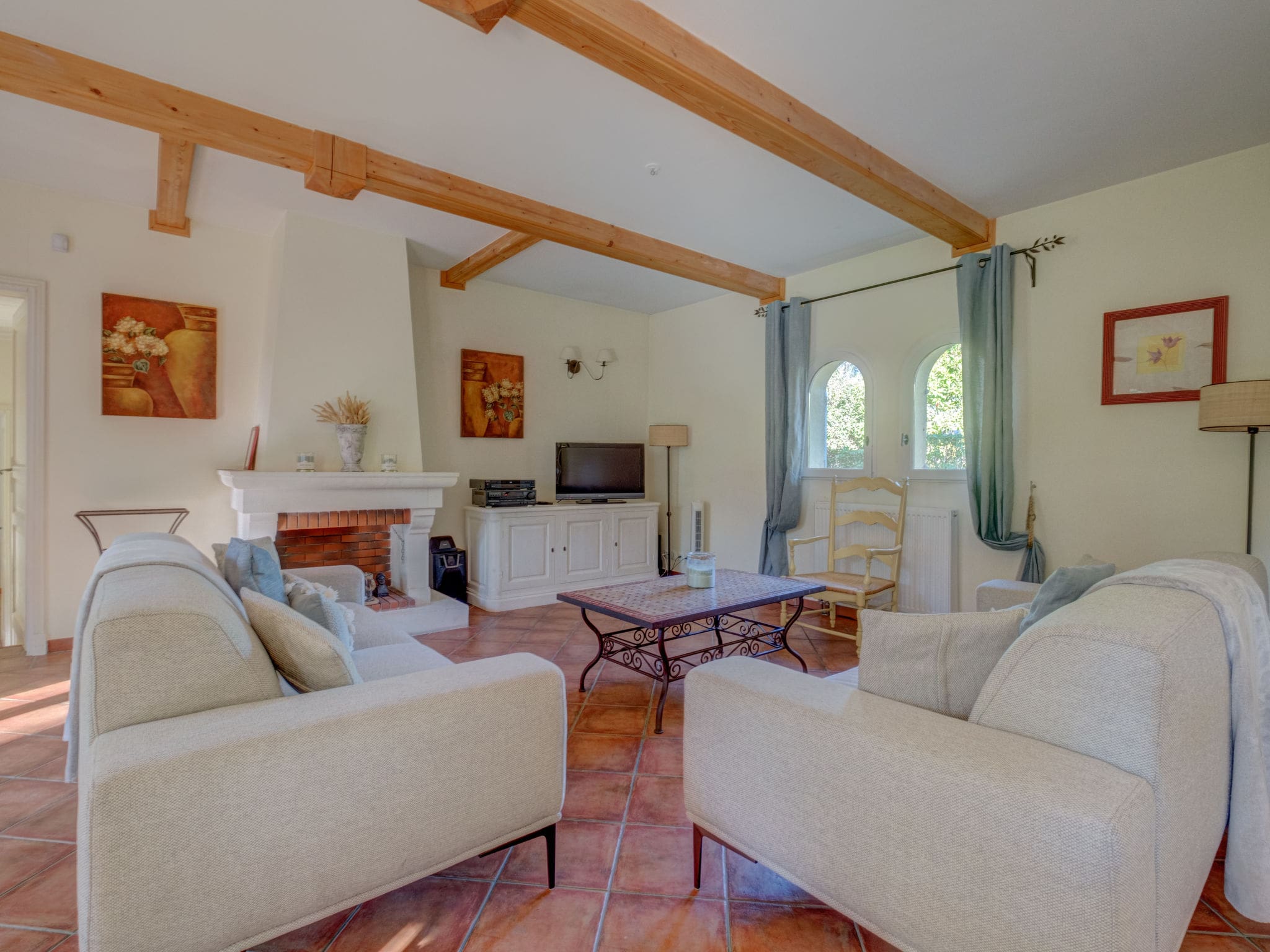 Spanning 160 square meters across two thoughtfully designed levels, this tastefully furnished villa combines traditional Provençal character with modern luxury amenities. The ground floor features an inviting living and dining area centered around an open-hearth fireplace, perfect for gathering after days spent on the golf course or exploring local vineyards. French doors lead seamlessly to the private terrace, creating an effortless indoor-outdoor flow that epitomizes Mediterranean living.