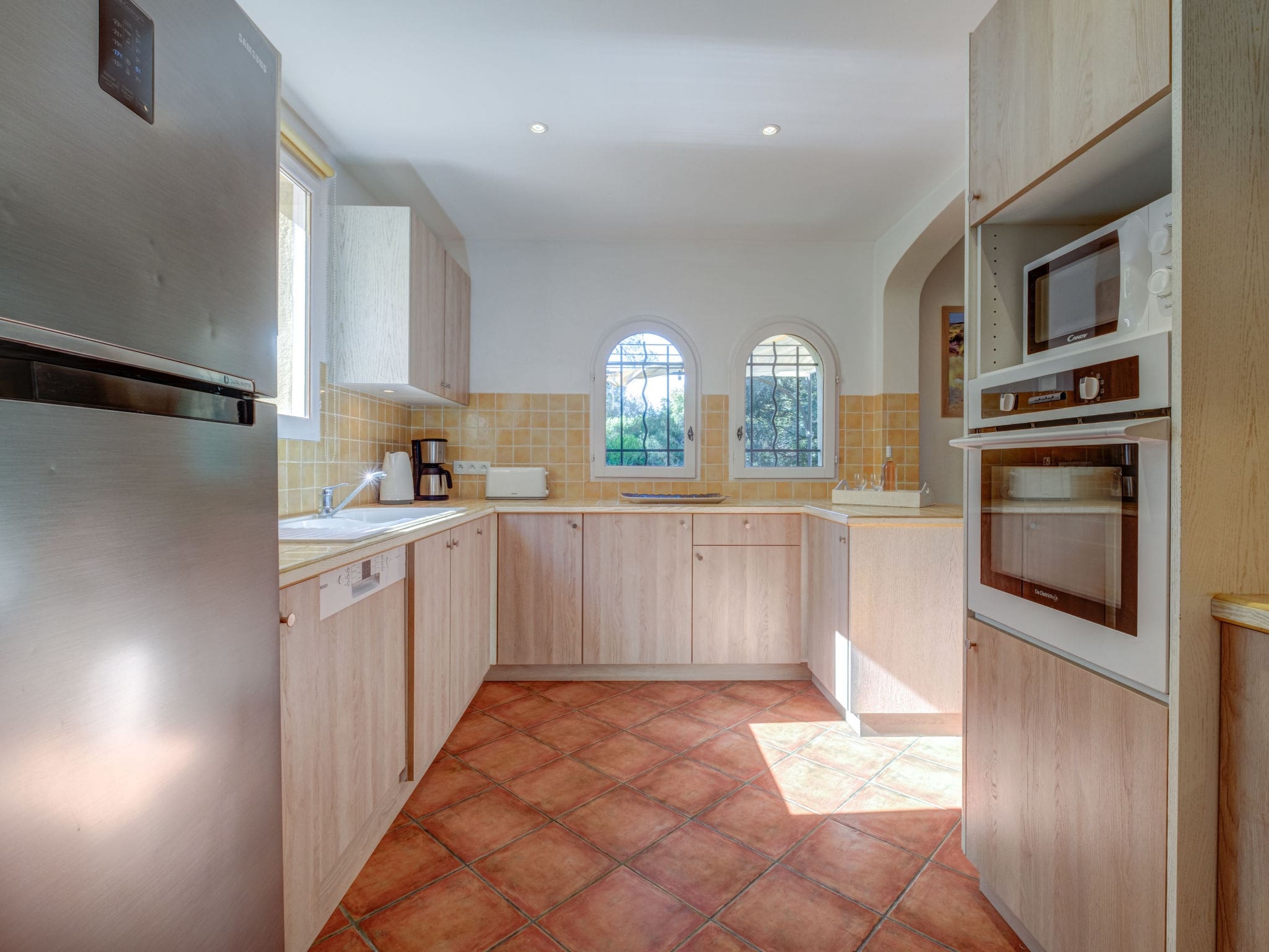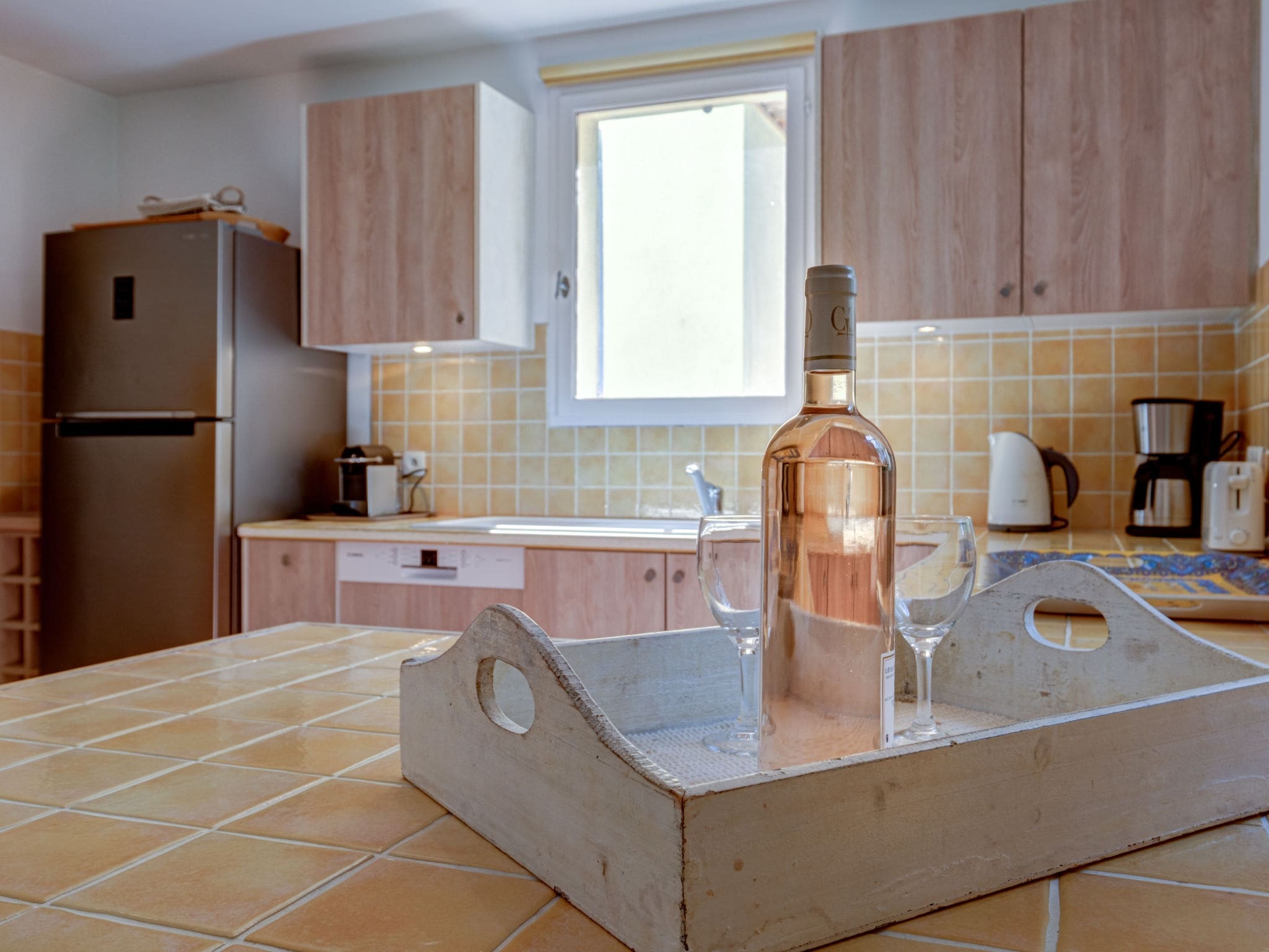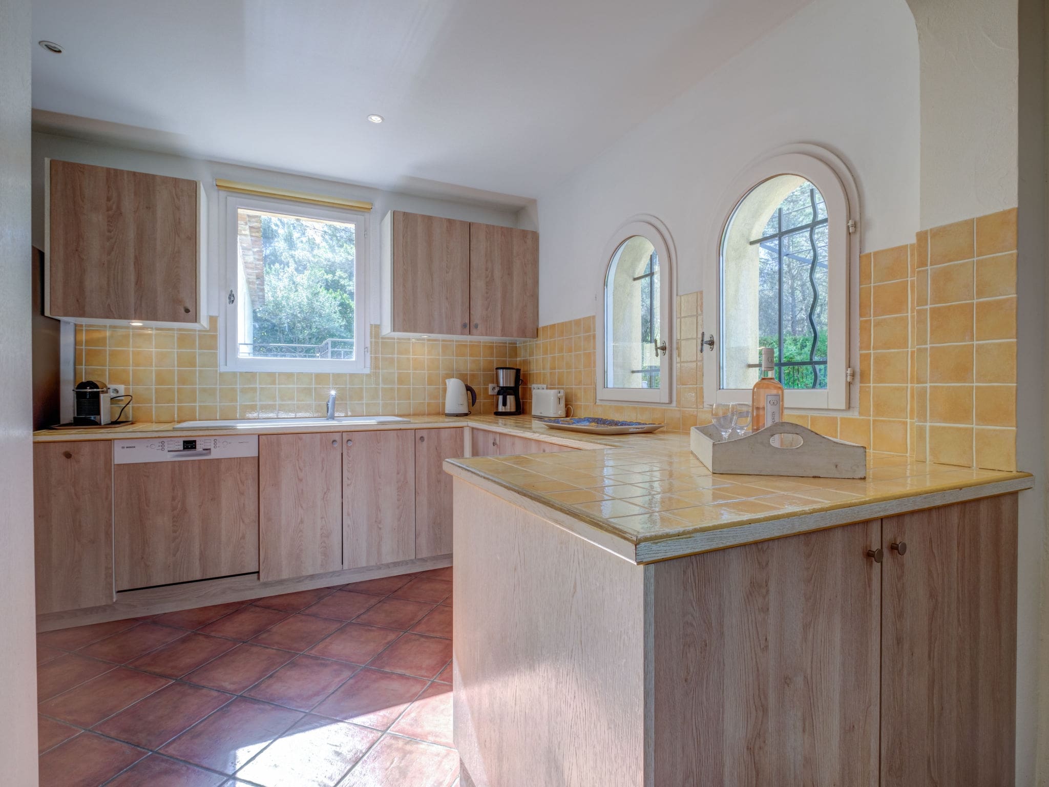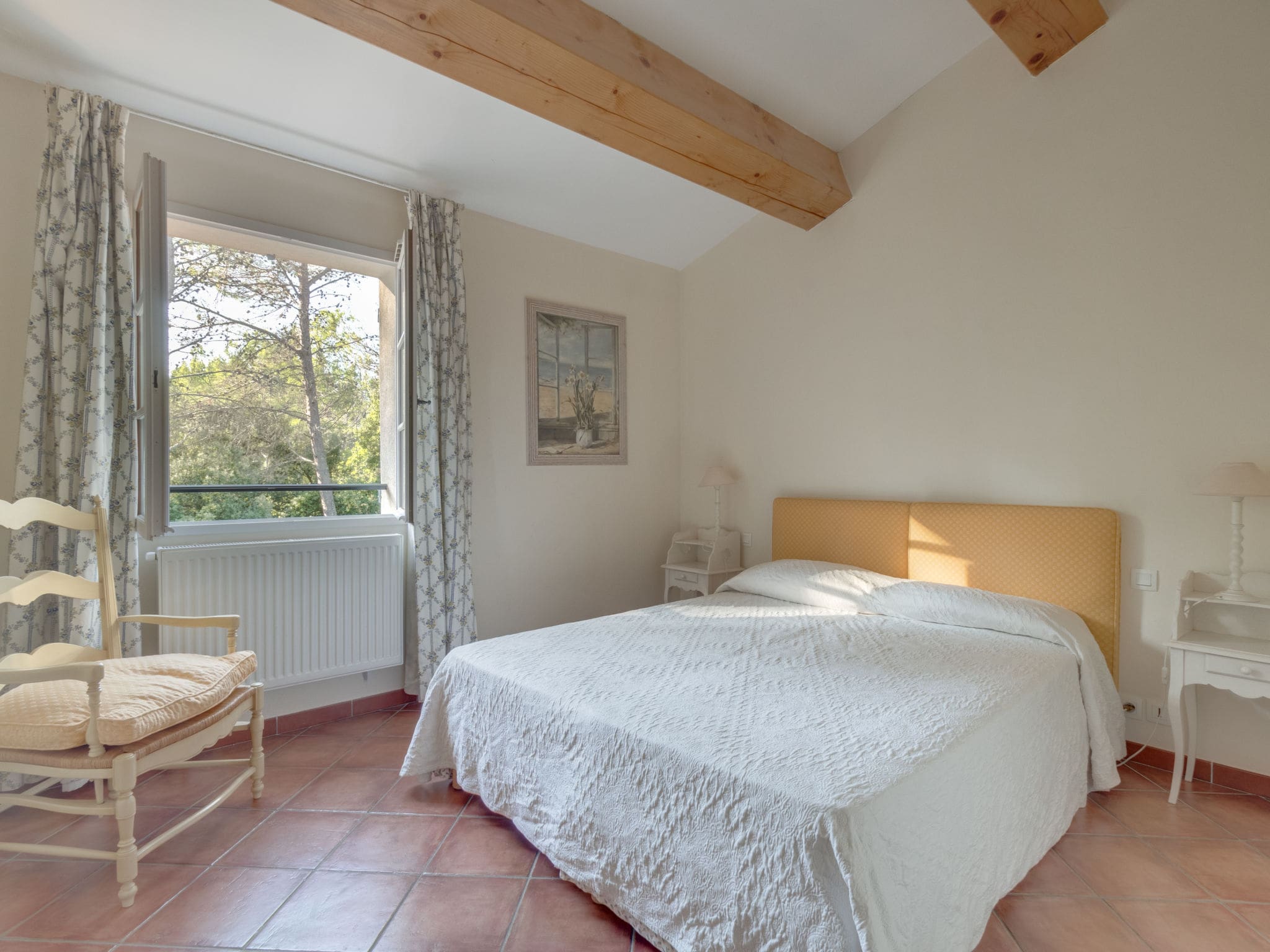 The villa accommodates up to 8 guests across four well-appointed bedrooms, each featuring air conditioning for comfort during warm Provençal summers. The master bedroom on the ground floor offers a luxurious French bed and en-suite bathroom with both bath and shower facilities. Upstairs, three additional bedrooms provide flexible sleeping arrangements, with two rooms featuring twin beds and access to a private balcony, plus another master bedroom with a French bed and full bathroom. The fully equipped kitchen includes modern appliances, dishwasher, and coffee machine, while additional conveniences include a washing machine, dryer, and safe.