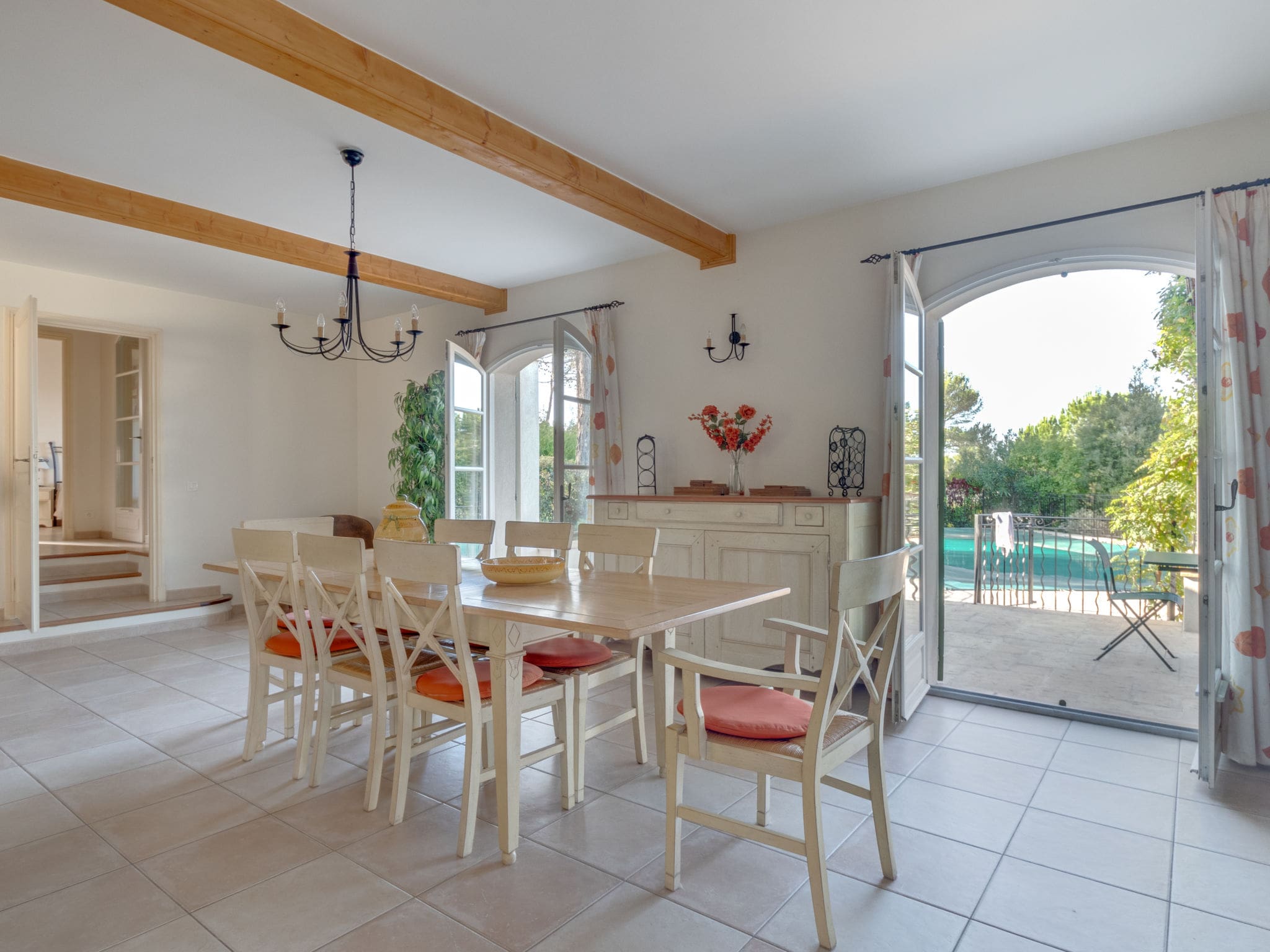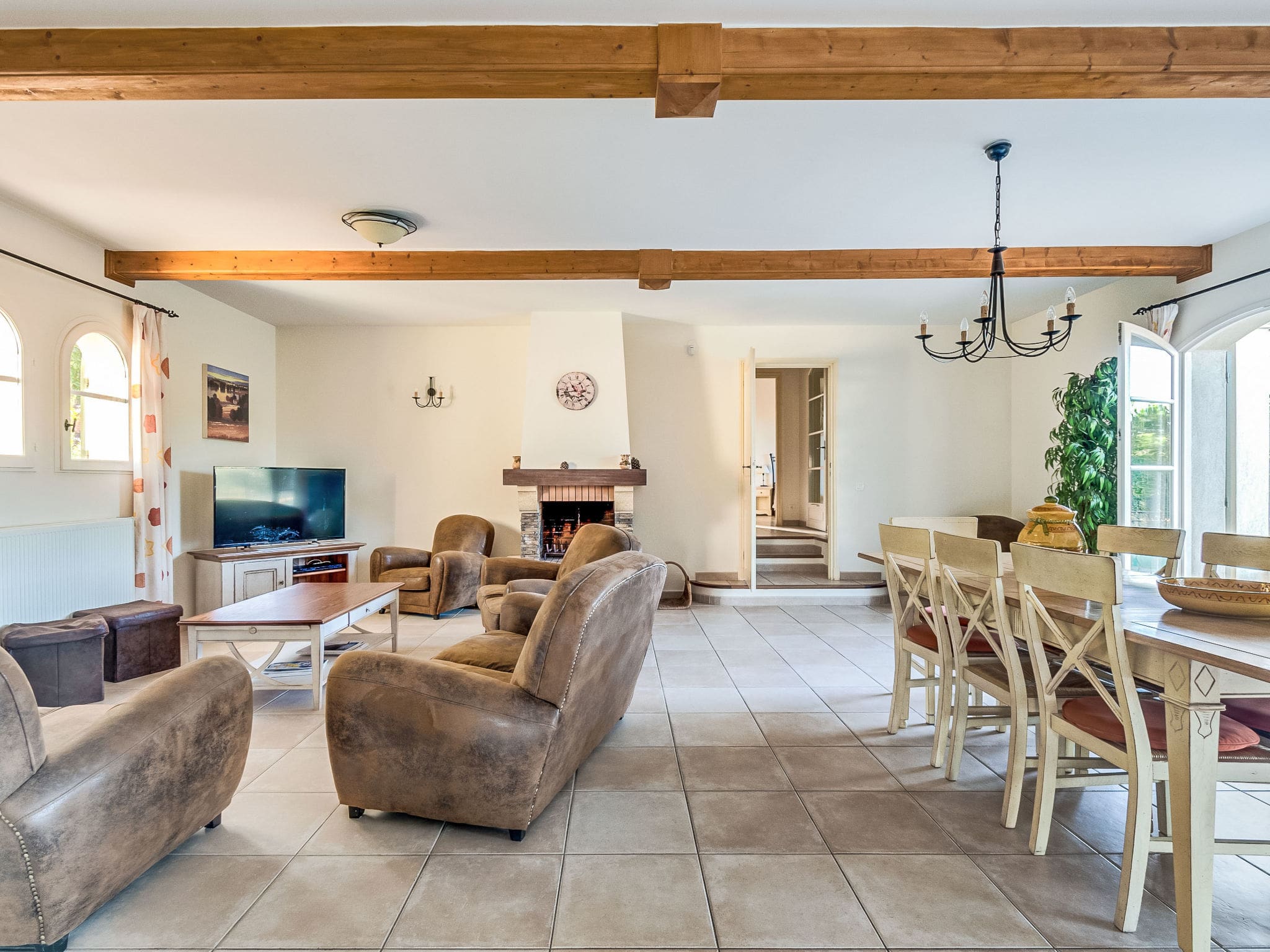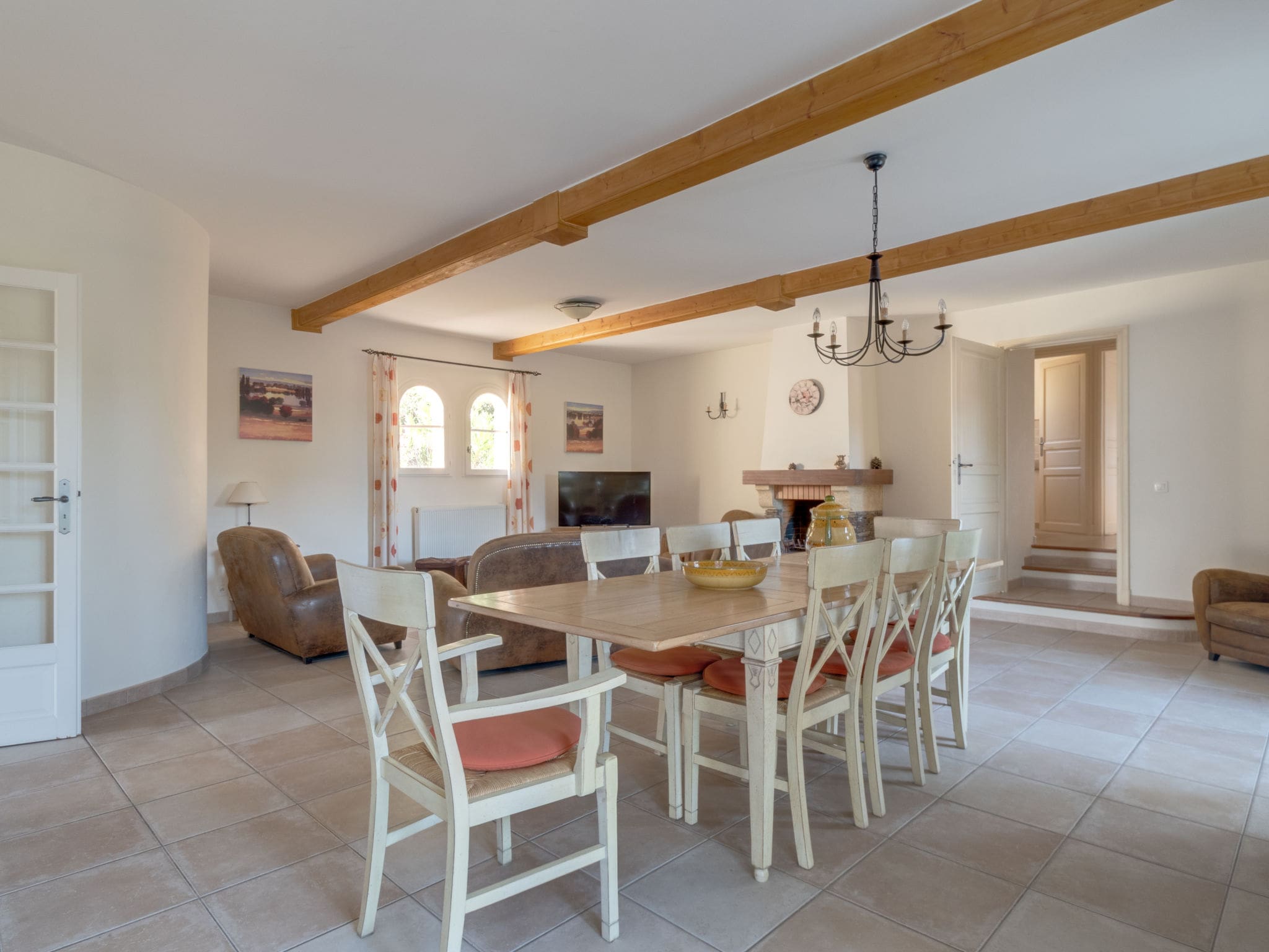 Spanning 175 square metres across two carefully designed levels, this elegant villa accommodates up to 10 guests in supreme comfort. The ground floor welcomes you with a spacious living and dining area anchored by an impressive open-hearth fireplace, perfect for cooler Provençal evenings. The room flows seamlessly onto the terrace through French doors, creating an indoor-outdoor living experience that defines Mediterranean luxury.