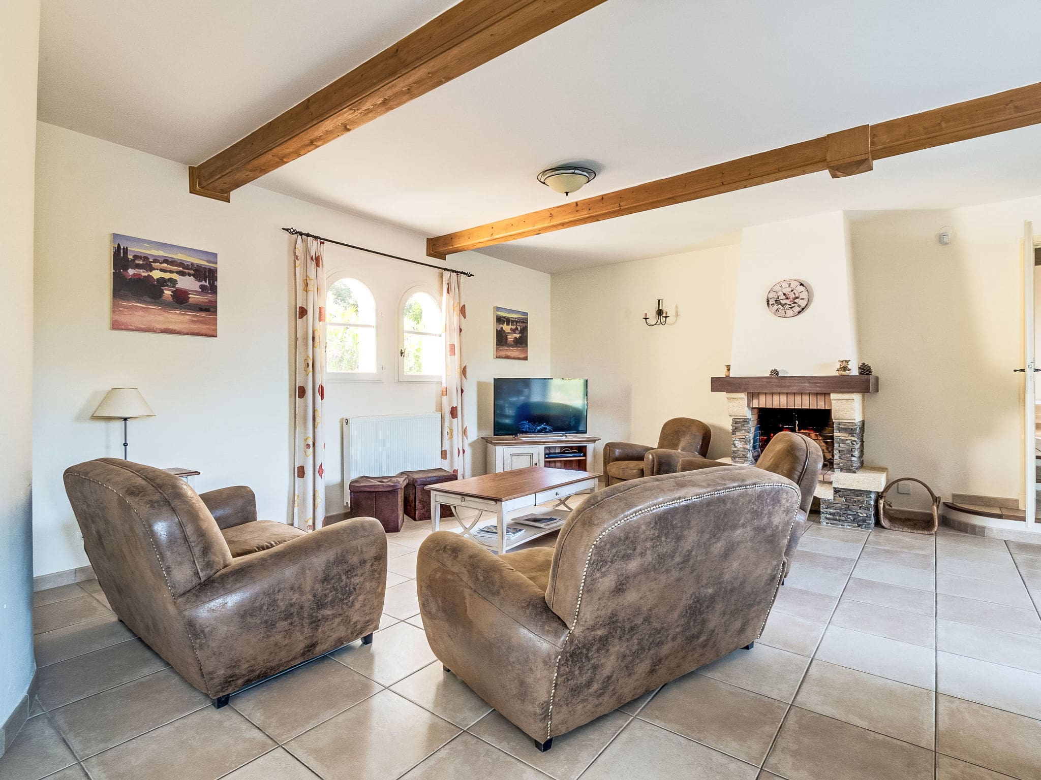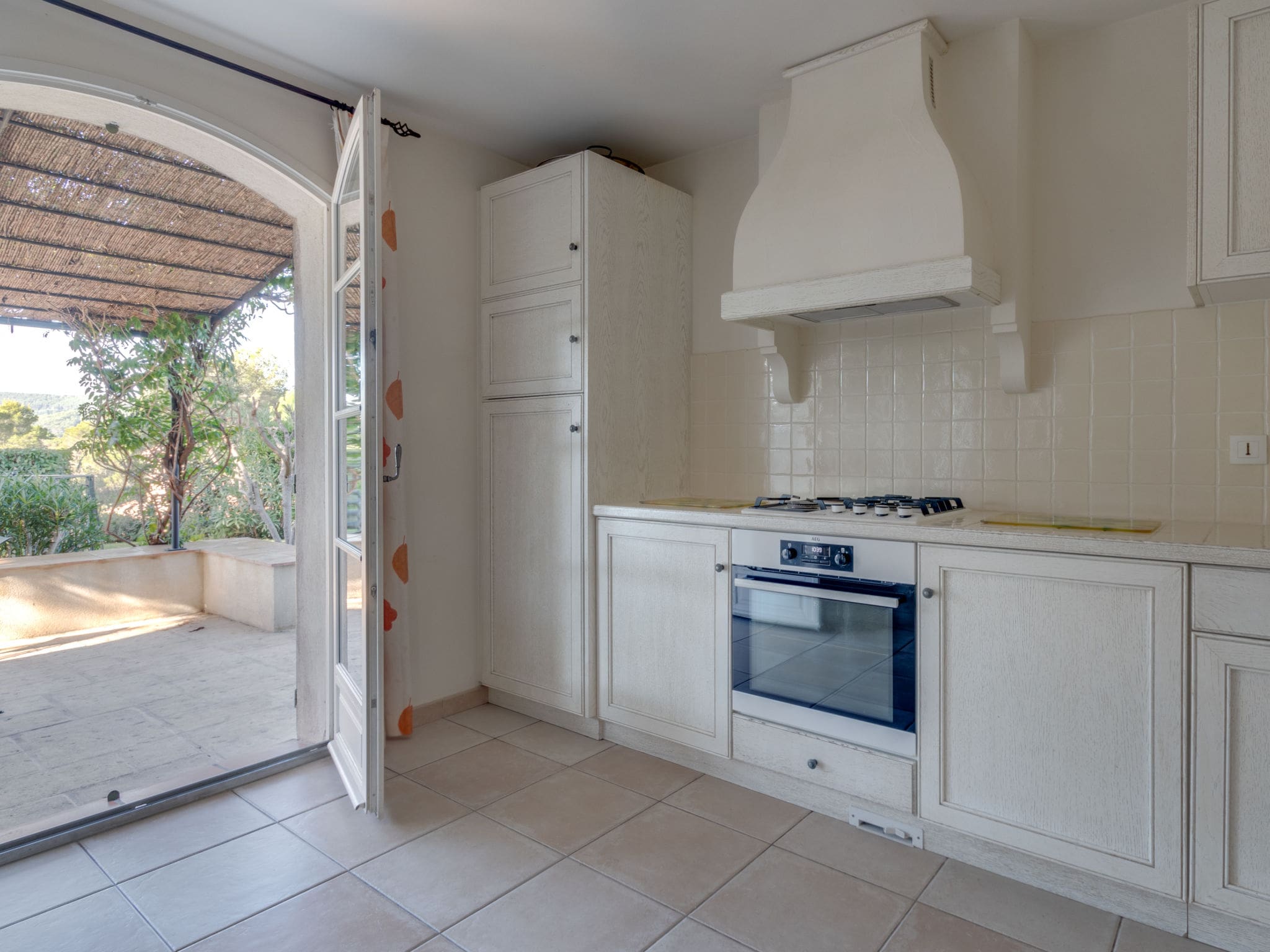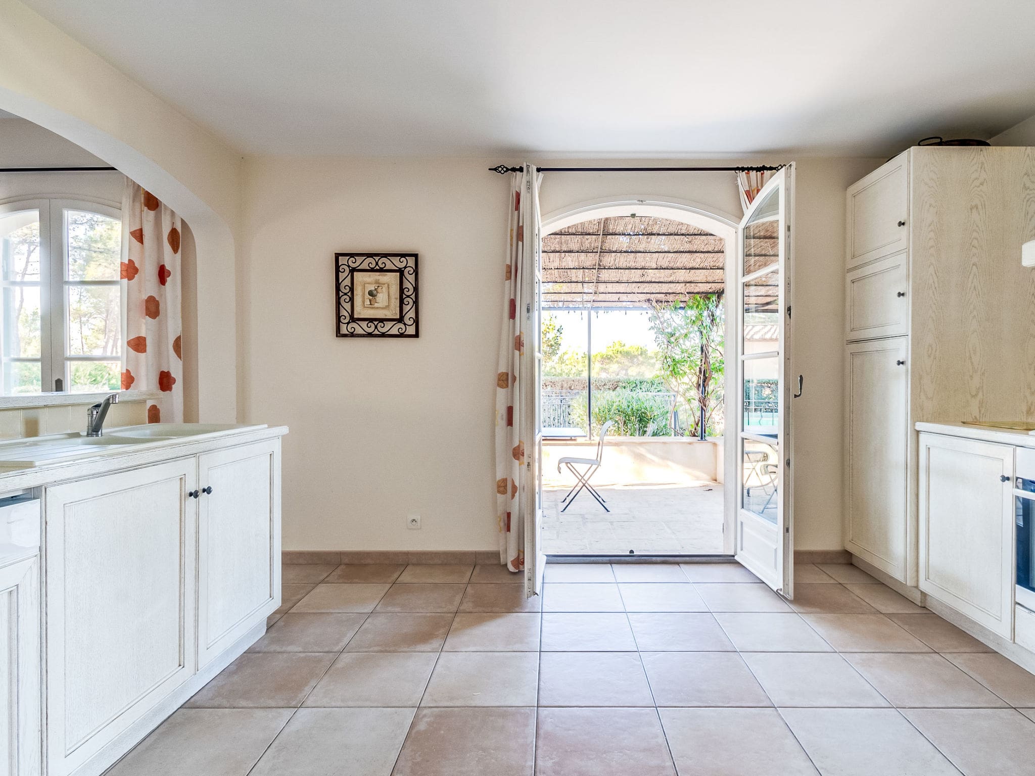 Spanning 175 square metres across two carefully designed levels, this elegant villa accommodates up to 10 guests in supreme comfort. The ground floor welcomes you with a spacious living and dining area anchored by an impressive open-hearth fireplace, perfect for cooler Provençal evenings. The room flows seamlessly onto the terrace through French doors, creating an indoor-outdoor living experience that defines Mediterranean luxury.