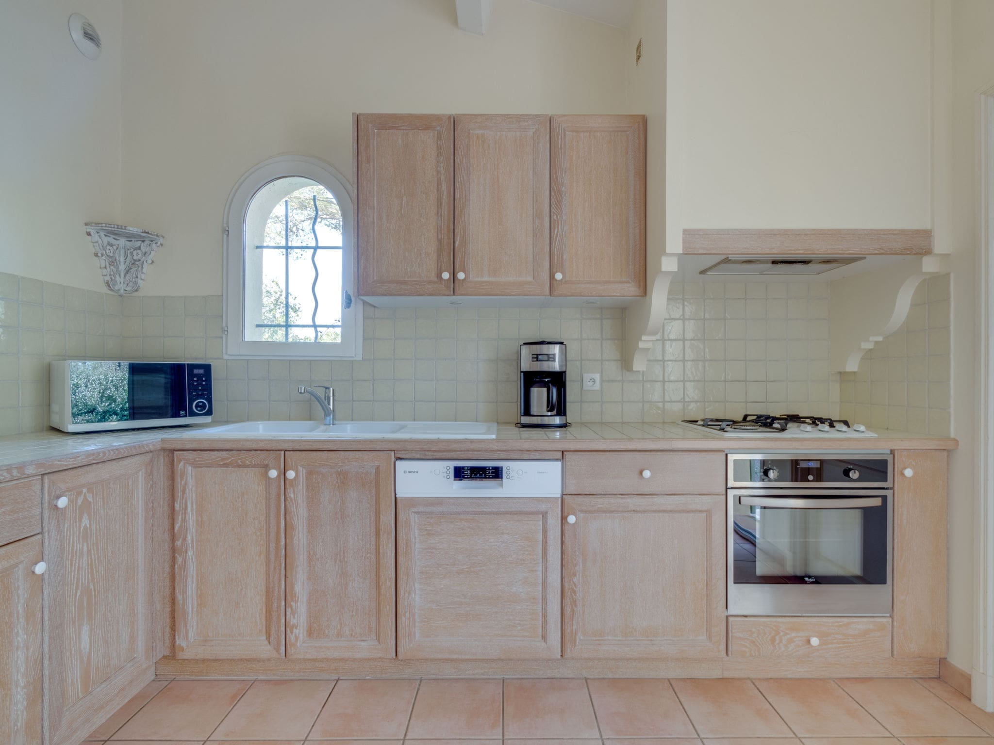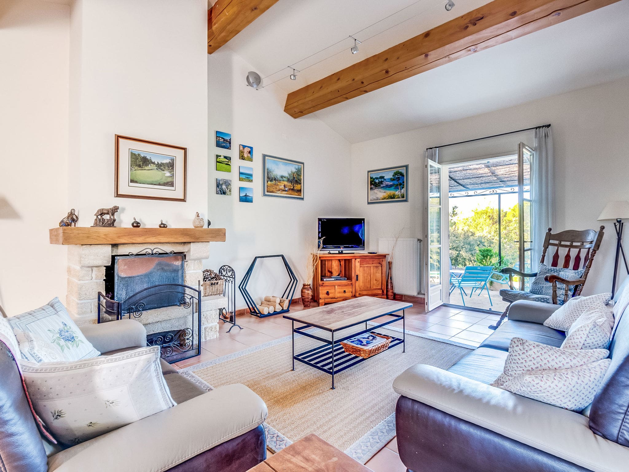 Spanning 115 square metres across two thoughtfully designed levels, this elegant villa features traditional Provençal architecture enhanced with contemporary comforts. The ground floor welcomes guests with a spacious living and dining area, complete with an open-hearth fireplace that creates a warm focal point during cooler evenings. Large windows flood the space with natural light, while satellite television and complimentary WiFi ensure modern convenience.