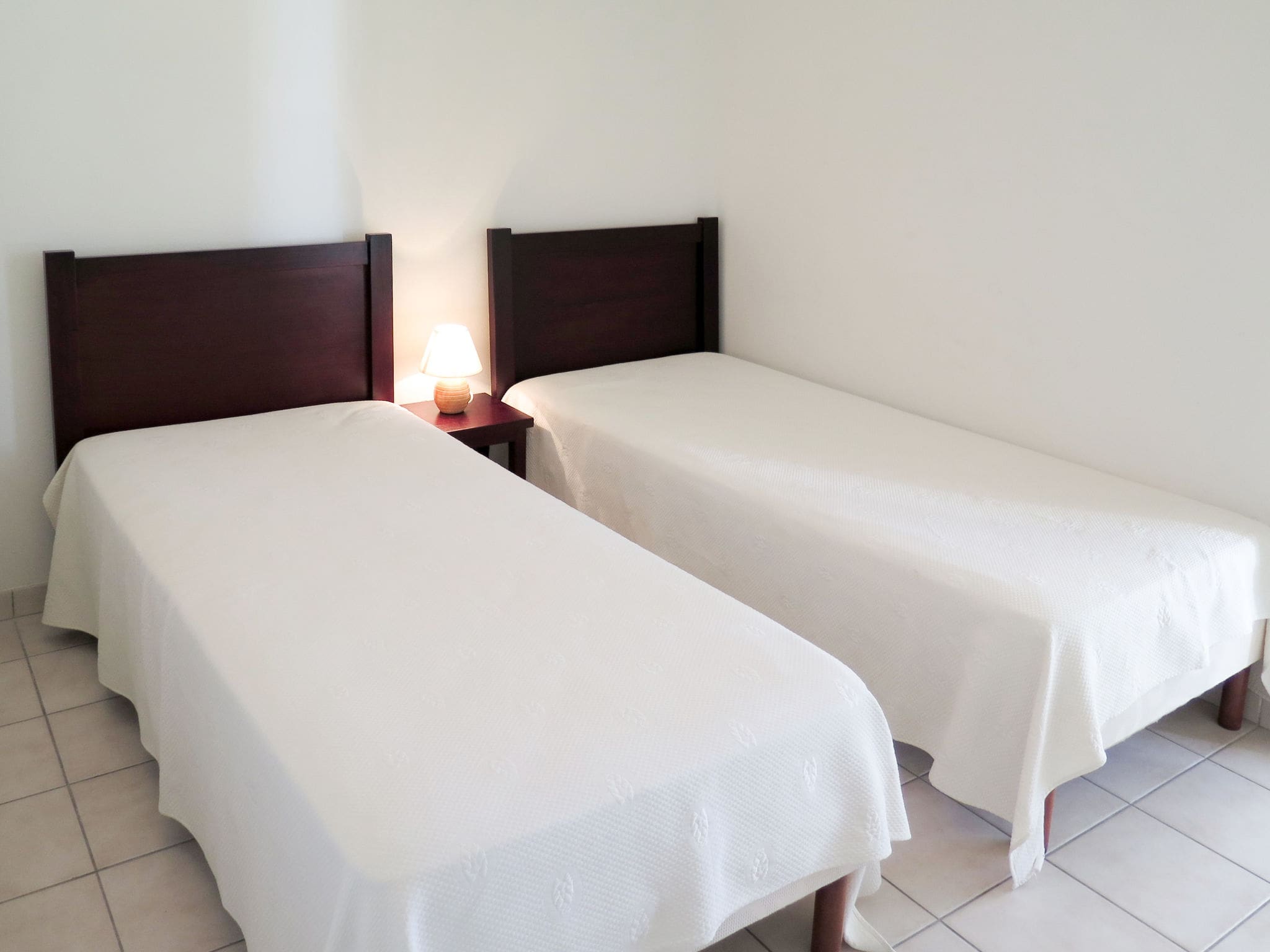 Two comfortable bedrooms provide restful accommodation, with the master bedroom featuring a generous French bed and direct terrace access. The second bedroom offers twin beds, also with its own terrace entrance. A contemporary bathroom with separate WC and double hand-basin serves both rooms, while electric heating throughout ensures year-round comfort. Practical amenities include a washing machine, dryer, and baby equipment available on request.