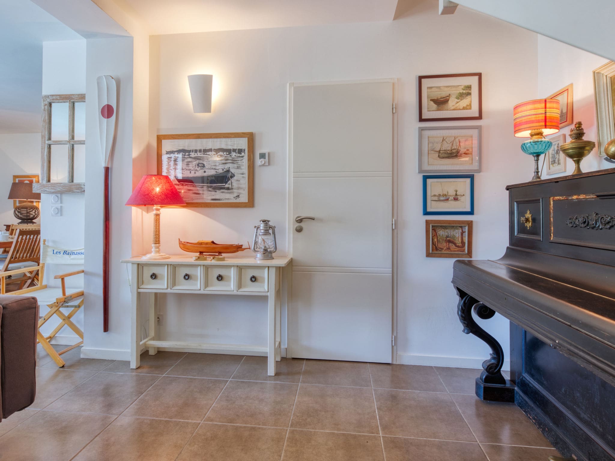 The villa’s 300-square-meter fenced garden creates a private oasis within this wildlife-friendly setting. The seasonal swimming pool (7m x 3m, available from April 25th to September 26th) features an internal staircase for easy access, while the outdoor shower provides convenient refreshment after swims. The partly covered terrace extends the living space outdoors, furnished with dining furniture, portable barbecue, and four deck chairs for ultimate relaxation. Partial lake views from the terrace remind guests of the natural beauty that surrounds this special location.