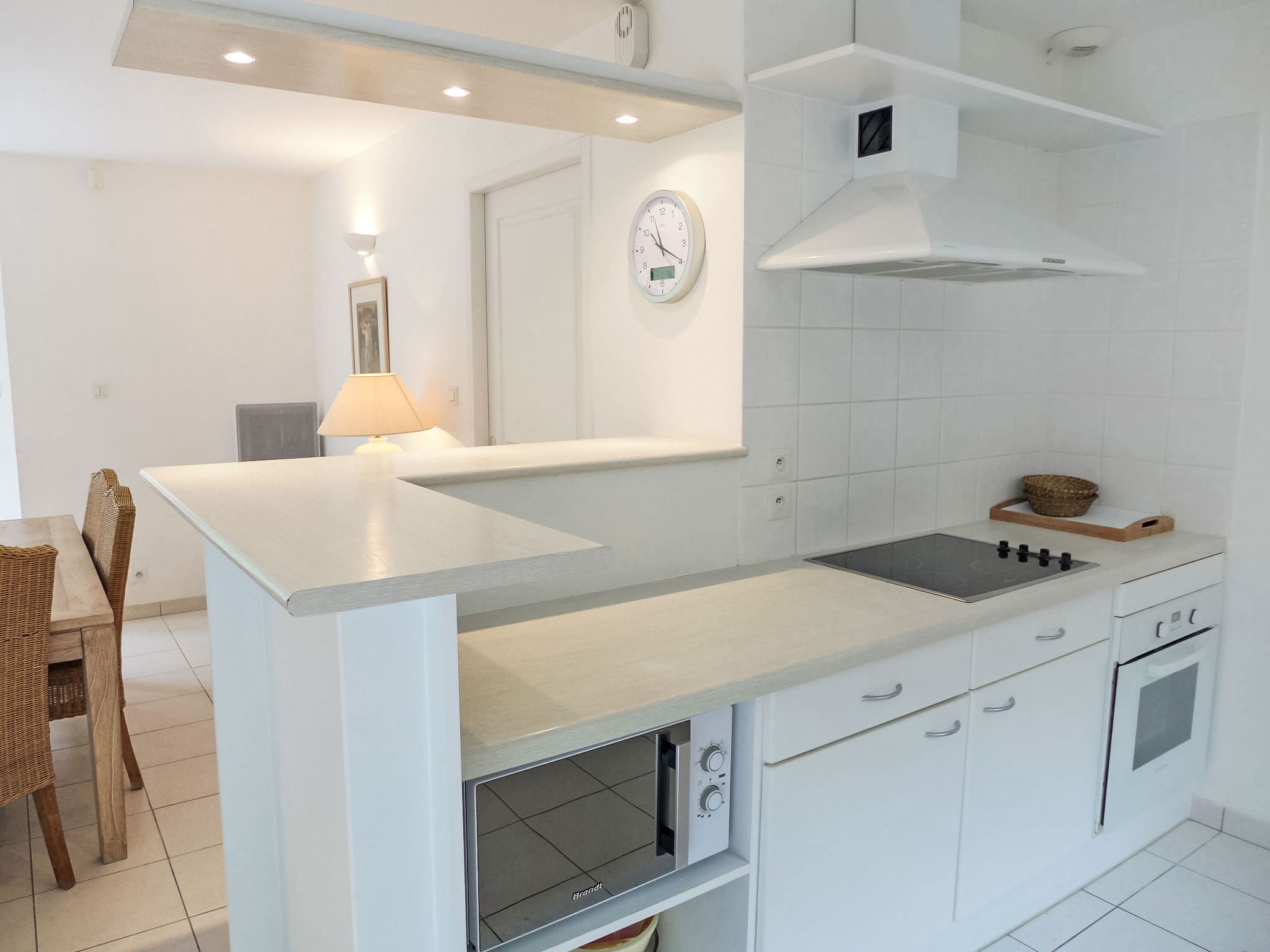 The modern kitchen, equipped with premium appliances including dishwasher, microwave and Nespresso coffee machine, features a convenient breakfast bar for casual dining. Upstairs, two additional bedrooms with comfortable twin beds each enjoy private balcony access, while a separate bathroom serves this level. Throughout the villa, double-glazed windows ensure peaceful relaxation, while electric heating provides year-round comfort.