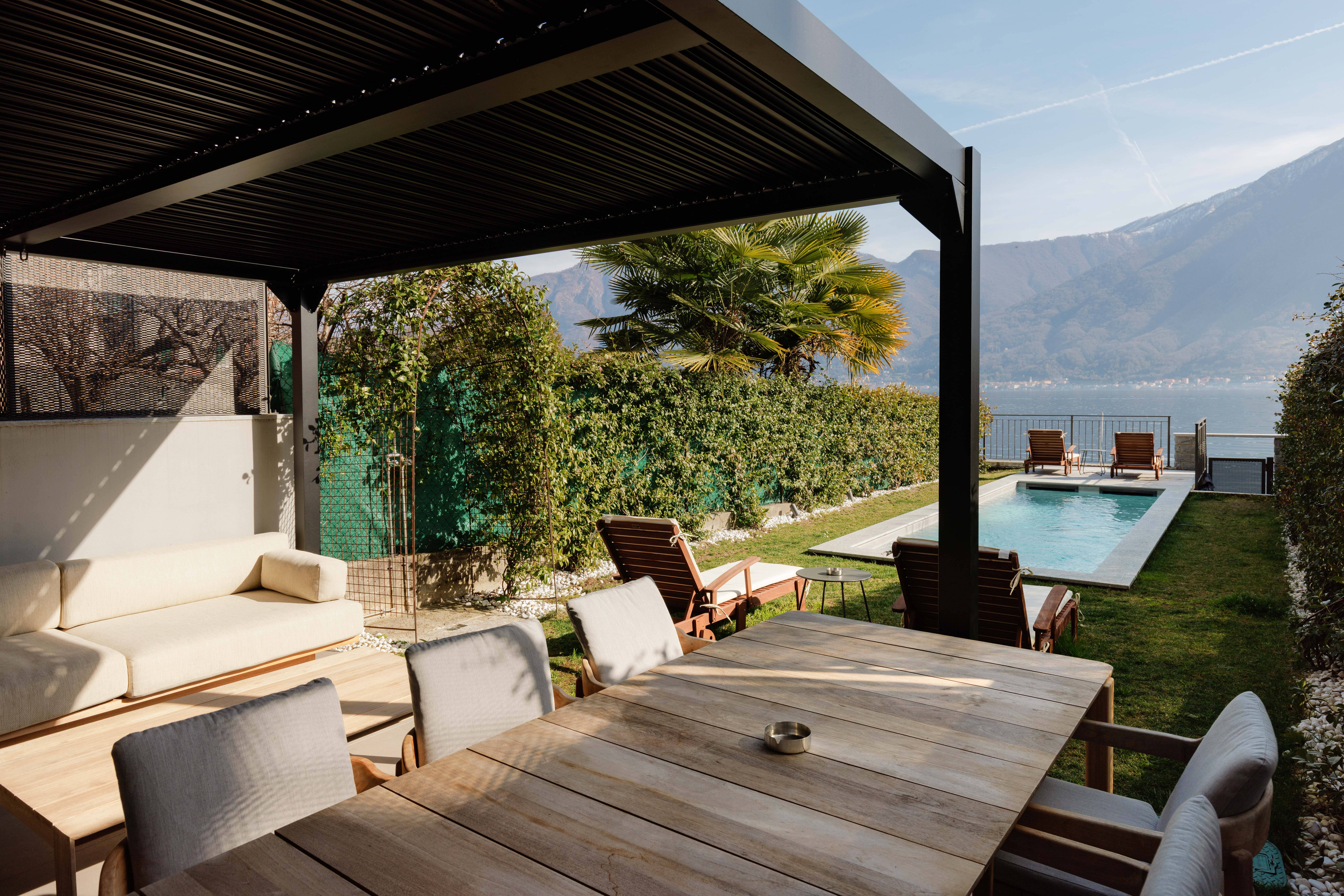Step outside to discover a world of serene beauty. The private garden leads directly to the shimmering waters of Lake Como, offering a picturesque setting for morning strolls or sunset reflections. A shaded dining area and a sparkling pool provide the perfect backdrop for alfresco dining and leisurely days spent soaking up the sun while enjoying views of Isola Comacina.