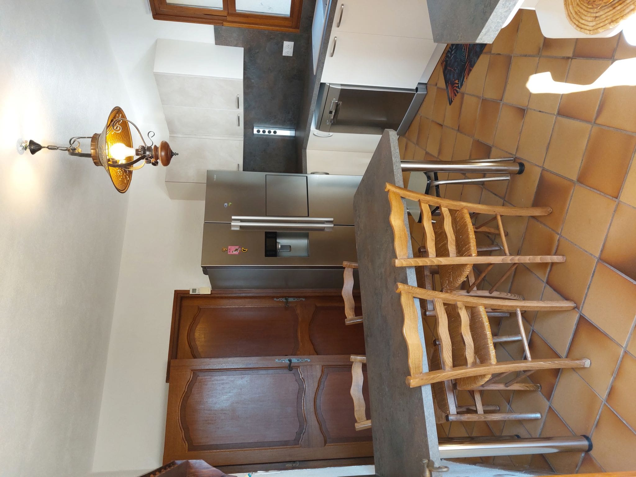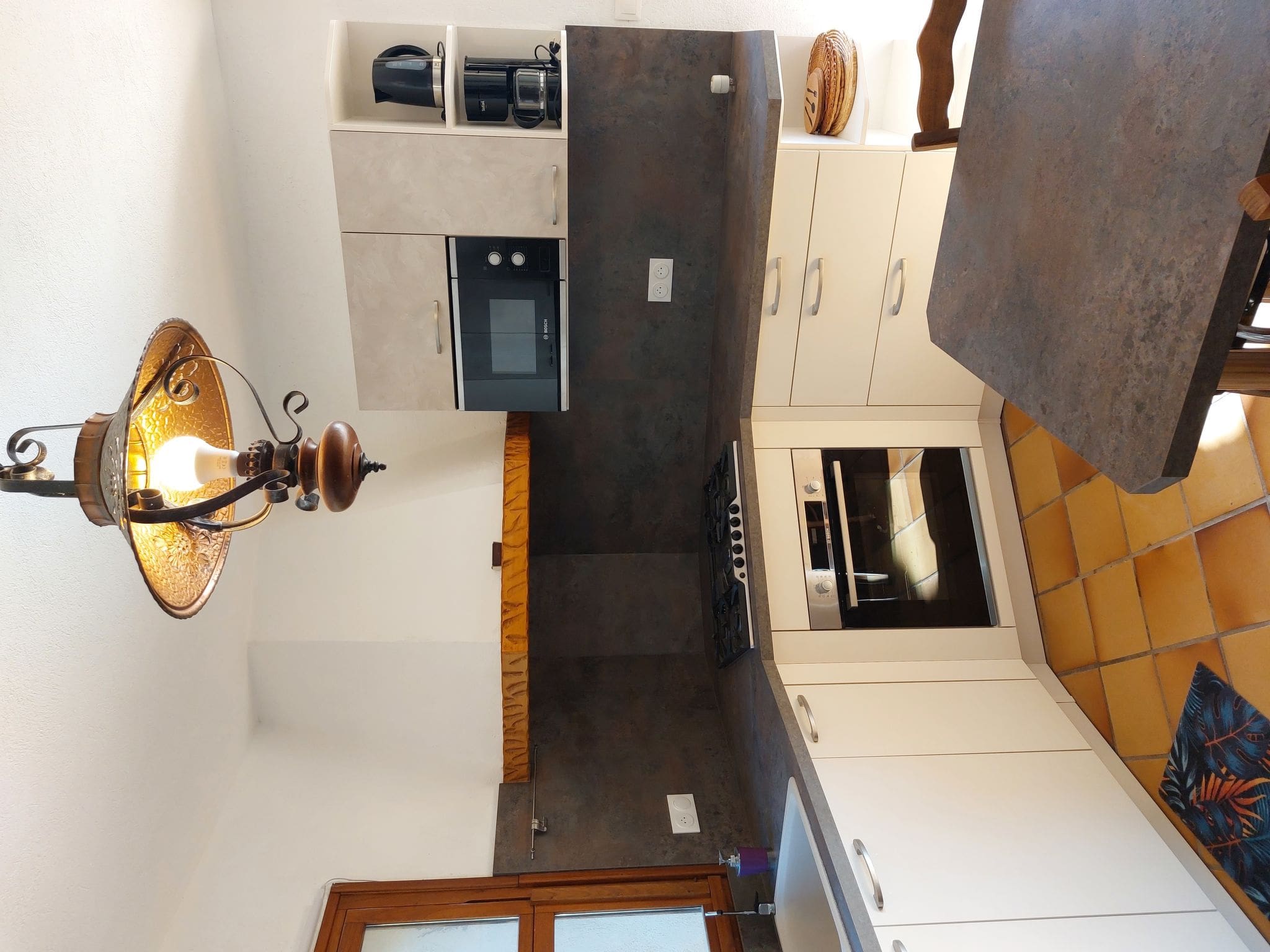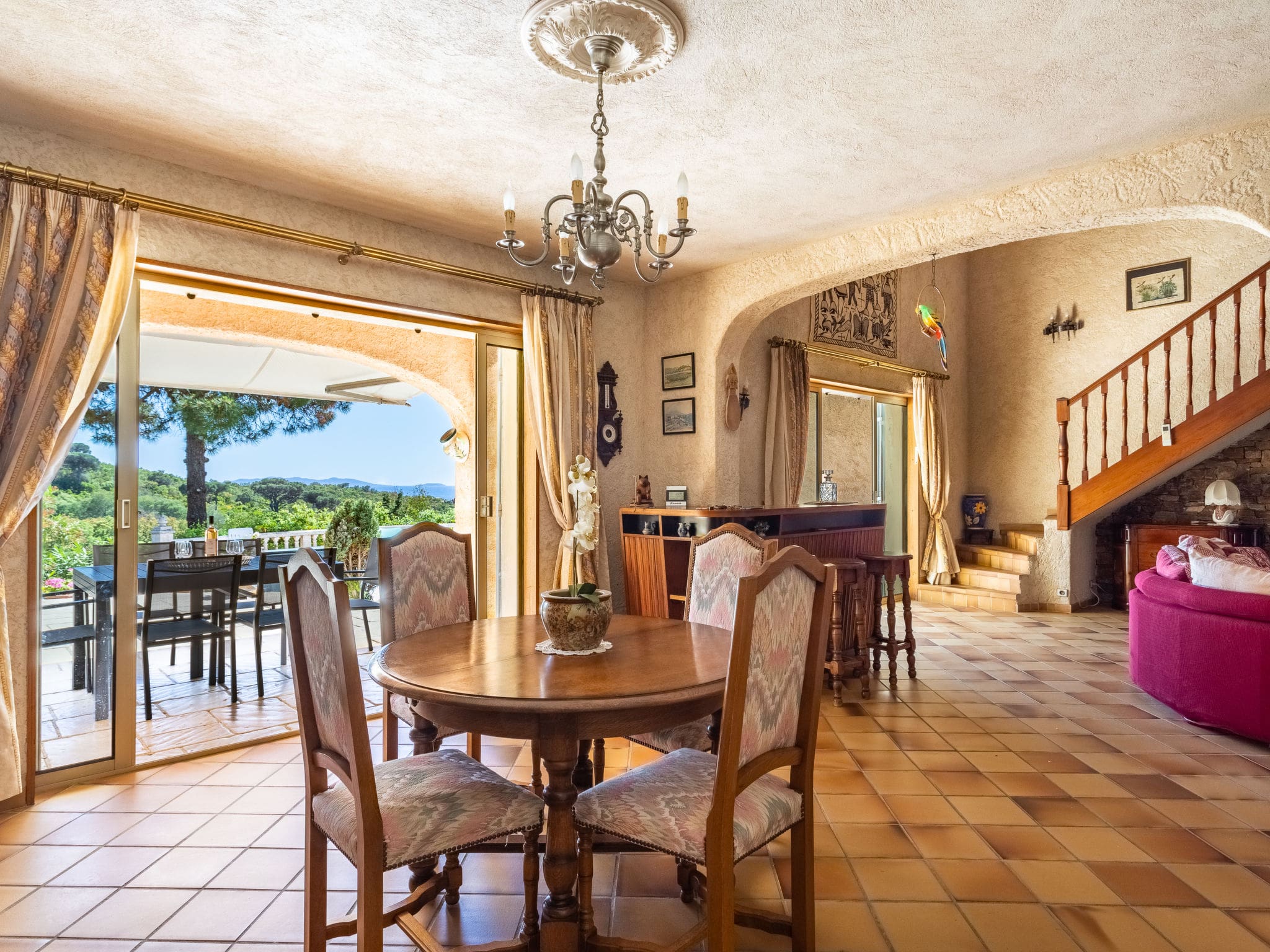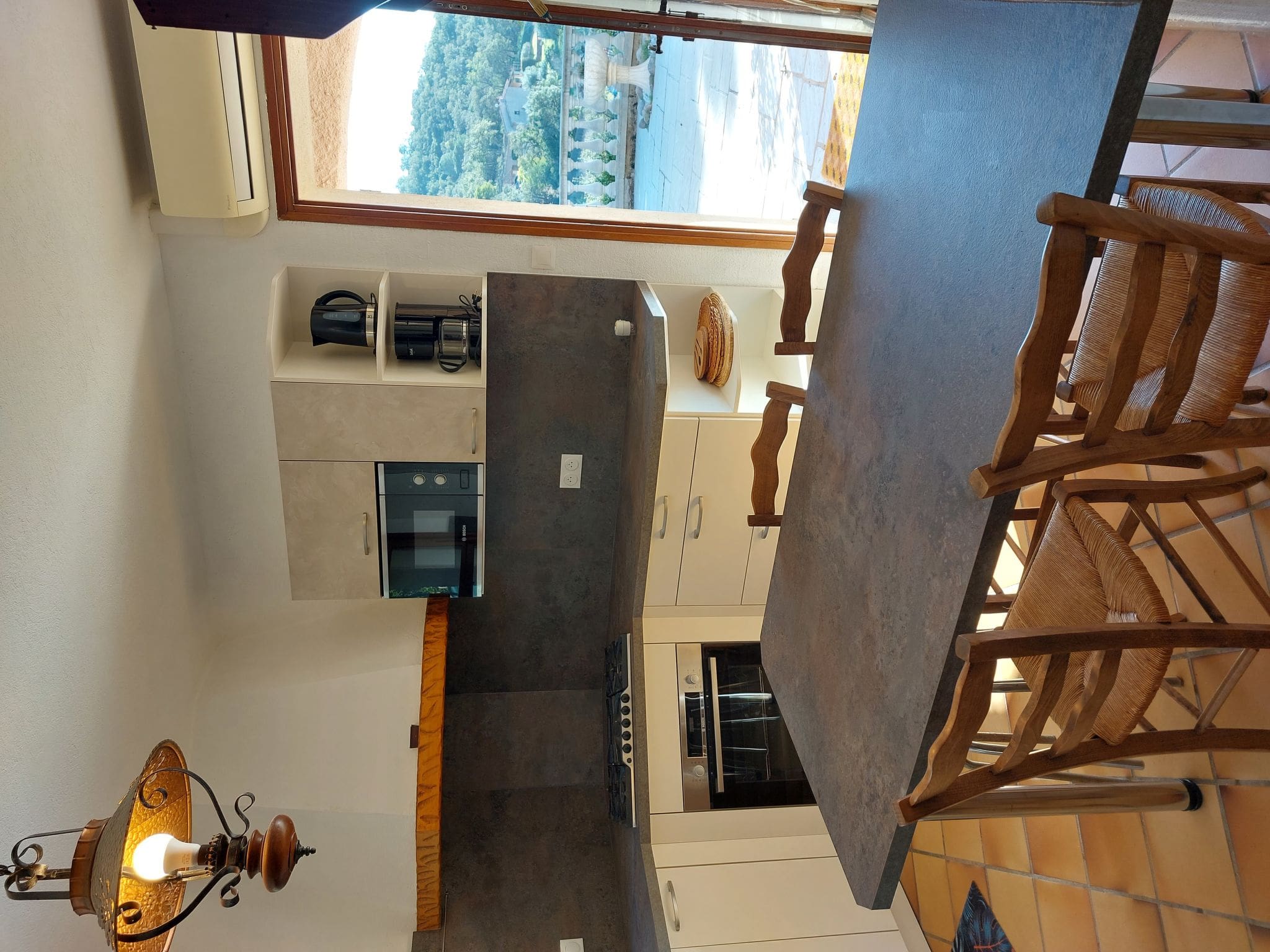 Spread across two thoughtfully designed levels, this 148-square-meter villa combines traditional French architecture with modern amenities. The main floor welcomes you with a spacious living and dining area featuring air conditioning and flat-screen television, opening seamlessly onto a south-facing terrace that captures the Mediterranean light throughout the day. The well-appointed kitchen comes fully equipped with gas stove, dishwasher, microwave, and electric coffee machine, plus its own dining table and television for casual meals.