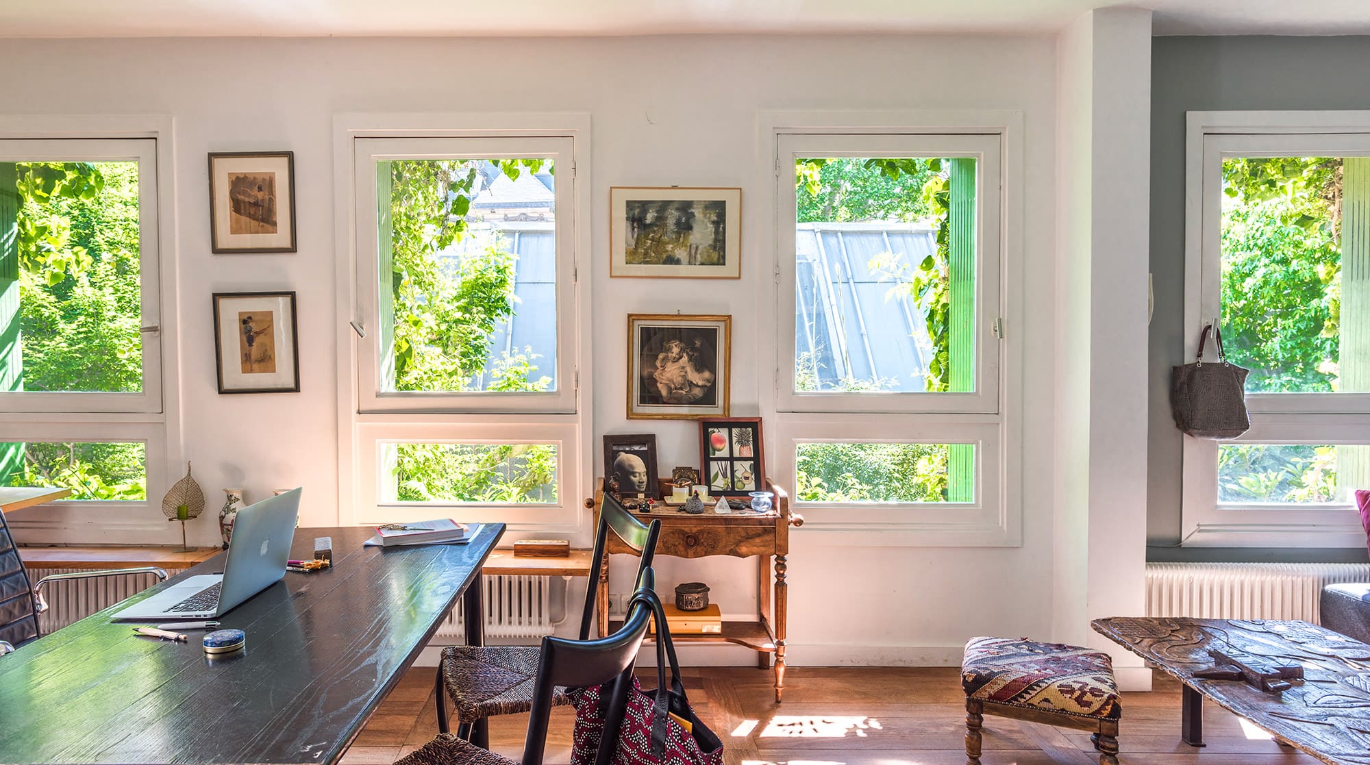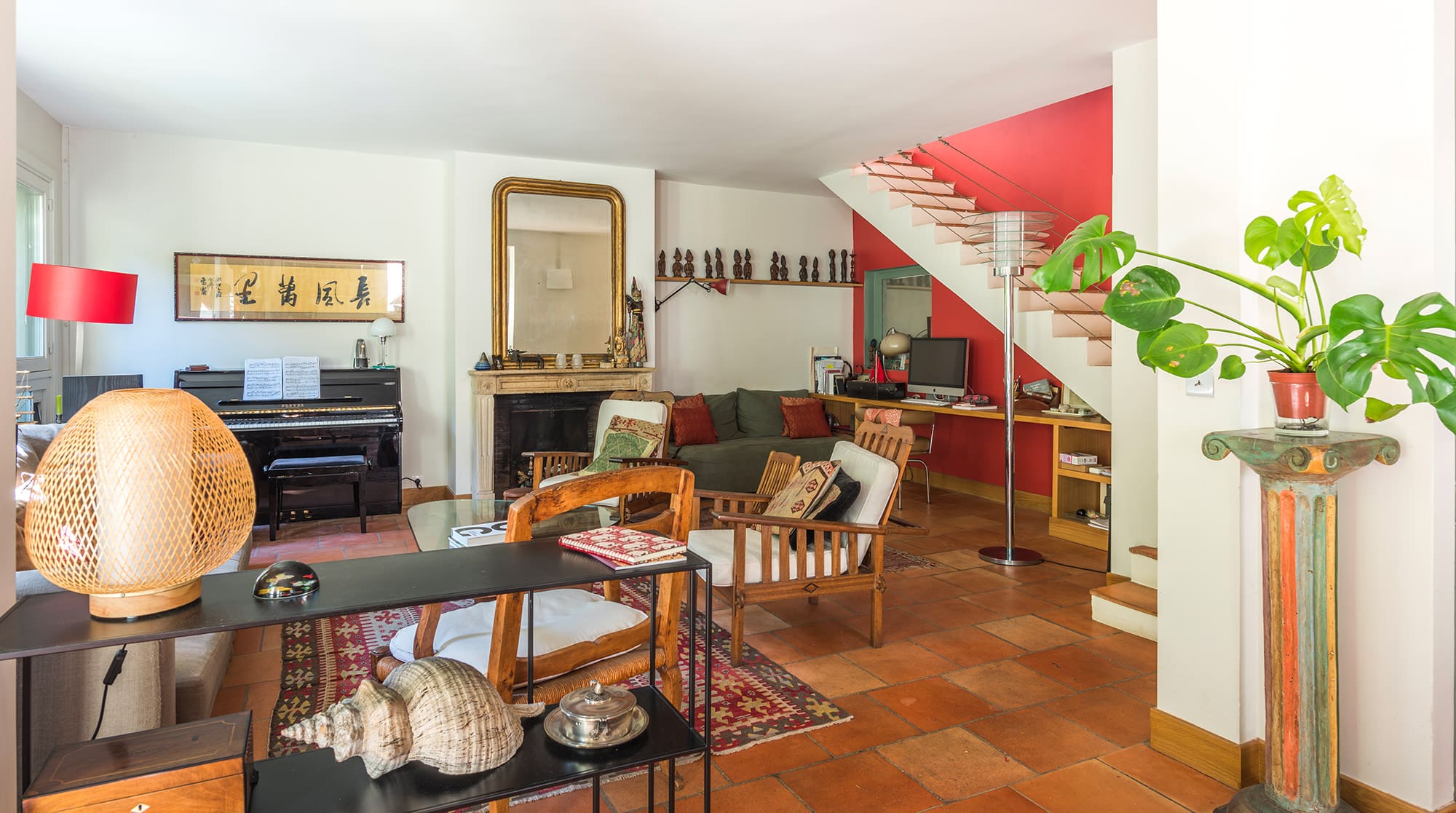 The interiors of this enchanting townhouse reflect a sophisticated fusion of rustic and artistic design, creating a warm and inviting atmosphere. With three beautifully appointed bedrooms, the property accommodates up to seven guests comfortably. Each room is thoughtfully decorated with an array of curios and Asian-themed decor, adding to the home’s unique charm. The living areas are spacious yet cozy, offering the perfect setting for relaxation after a day of exploring Paris. The kitchen is fully equipped, providing everything needed for preparing delightful meals.