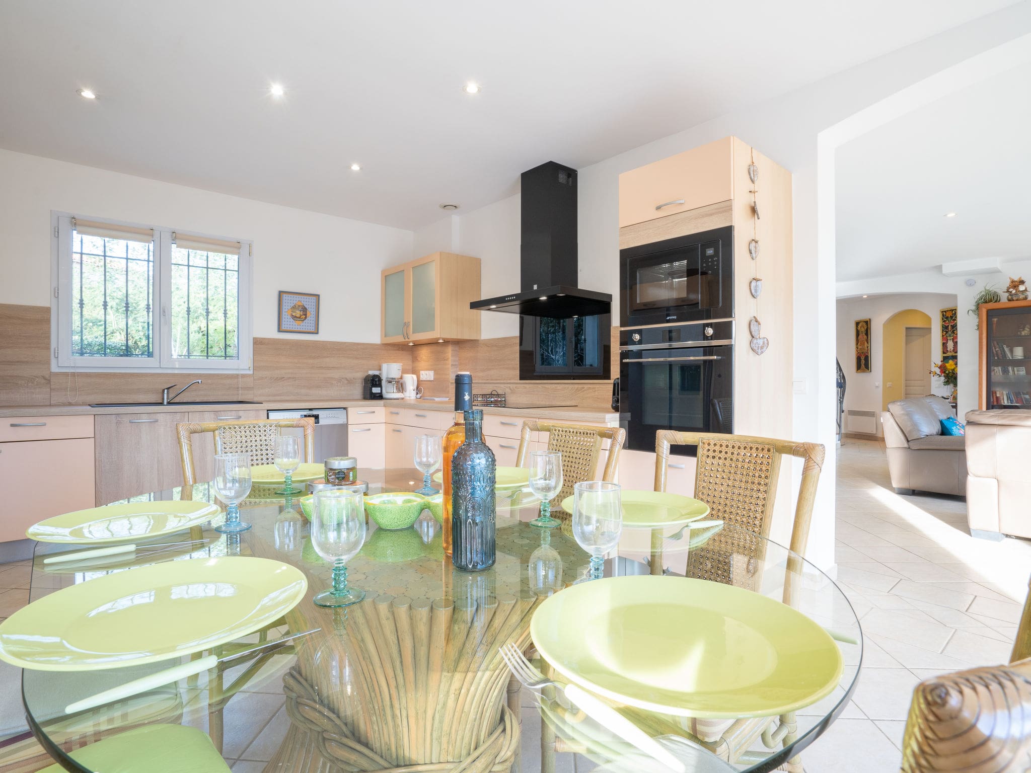 Spread across three thoughtfully designed levels, this 200-square-meter villa showcases contemporary Mediterranean architecture with sophisticated interior design. The heart of the home features an open-plan living area with sleek flat-screen television and DVD player, flowing seamlessly to the outdoor terraces and swimming pool area. The modern kitchen comes fully equipped with premium appliances including dishwasher, microwave, electric coffee machine, and oven, complemented by an elegant dining area perfect for memorable meals.