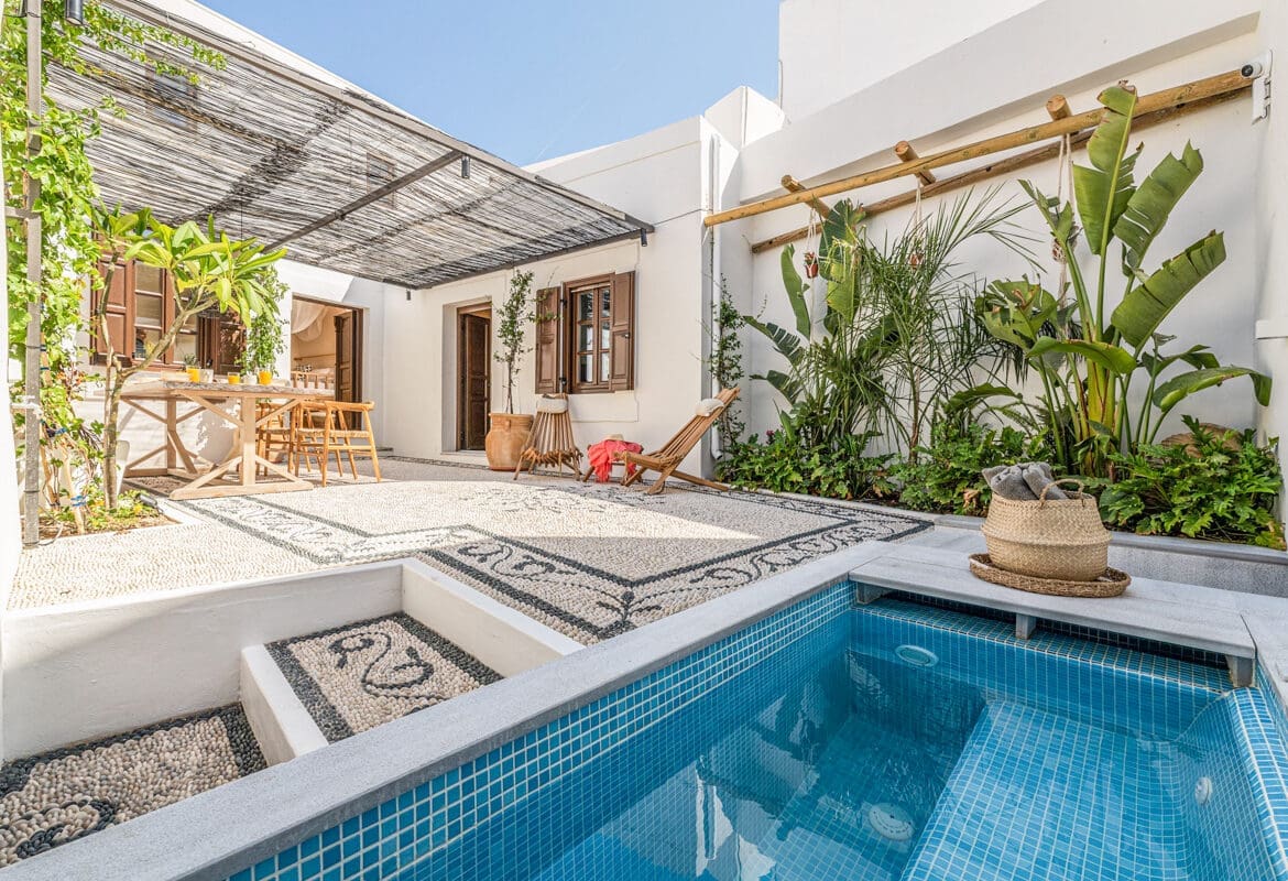 Giving you complete privacy, the enclosed outdoor area is particularly delightful. With an unheated tub and shaded seating and dining areas, it’s sure to become a favourite hangout during your stay, and even gives you a view of the mighty Lindos Acropolis above. If you prefer to dine out, you’ll find the villa is very close to local restaurants and Lindos’ main square.