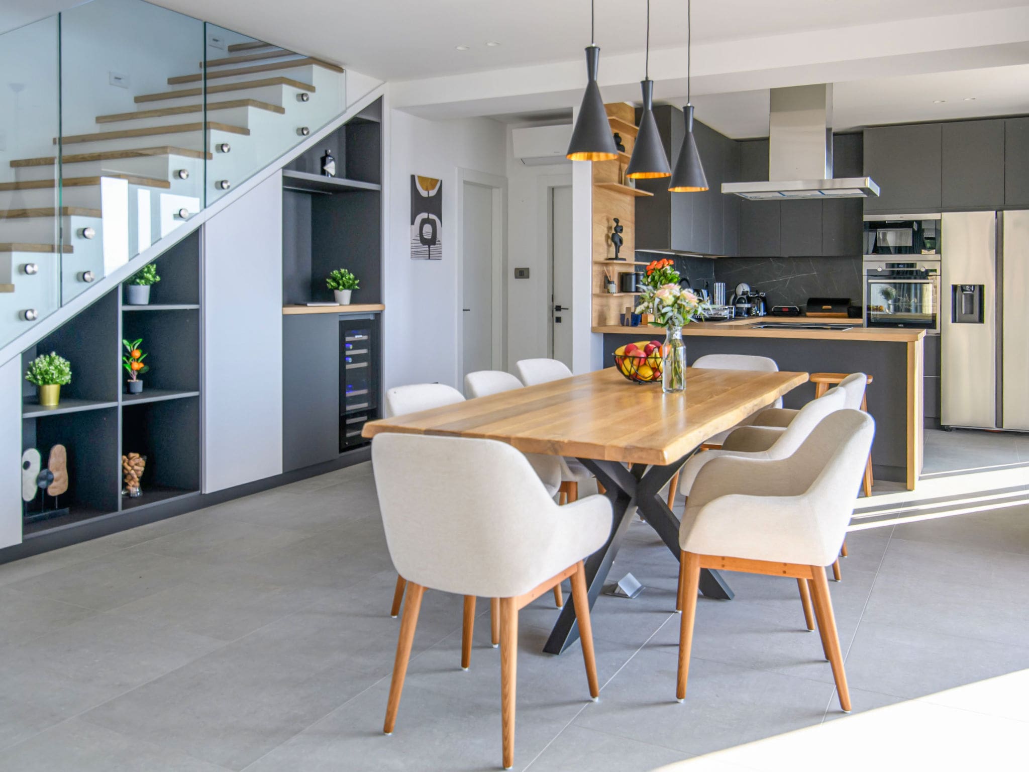 This magnificent 200m² villa unfolds across two thoughtfully designed levels, each room crafted to maximise the spectacular coastal panorama. The heart of the home features an expansive open-plan living and dining area, where floor-to-ceiling panoramic windows frame uninterrupted views of the sparkling Adriatic Sea. Modern furnishings throughout create an atmosphere of contemporary elegance, while air conditioning and floor heating ensure year-round comfort.