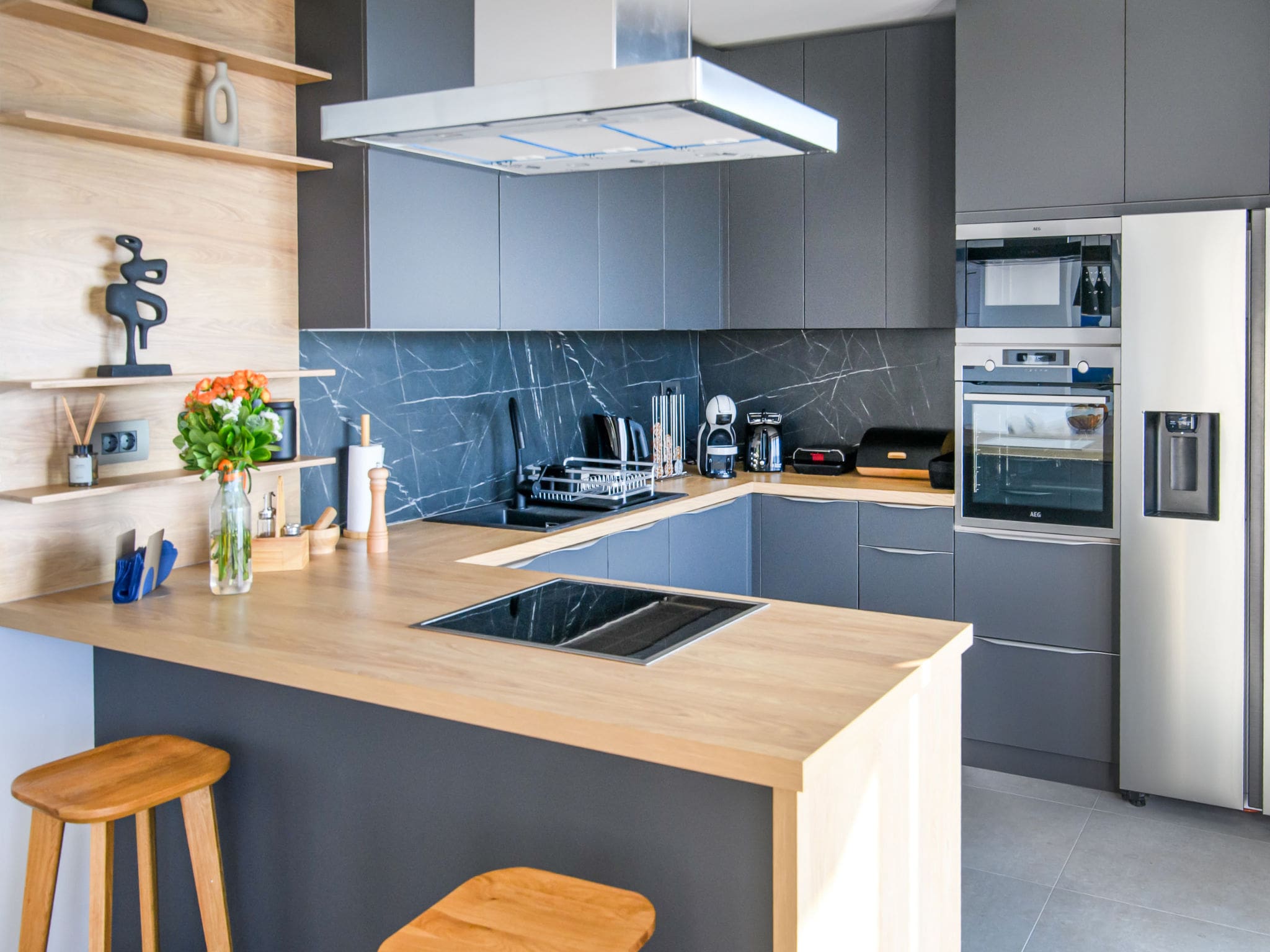 The fully equipped open kitchen features premium appliances including an induction cooktop, oven, dishwasher, and electric coffee machine, perfect for preparing meals while enjoying the stunning vistas. A convenient guest WC completes the ground floor, along with direct access to the expansive terrace and swimming pool area.