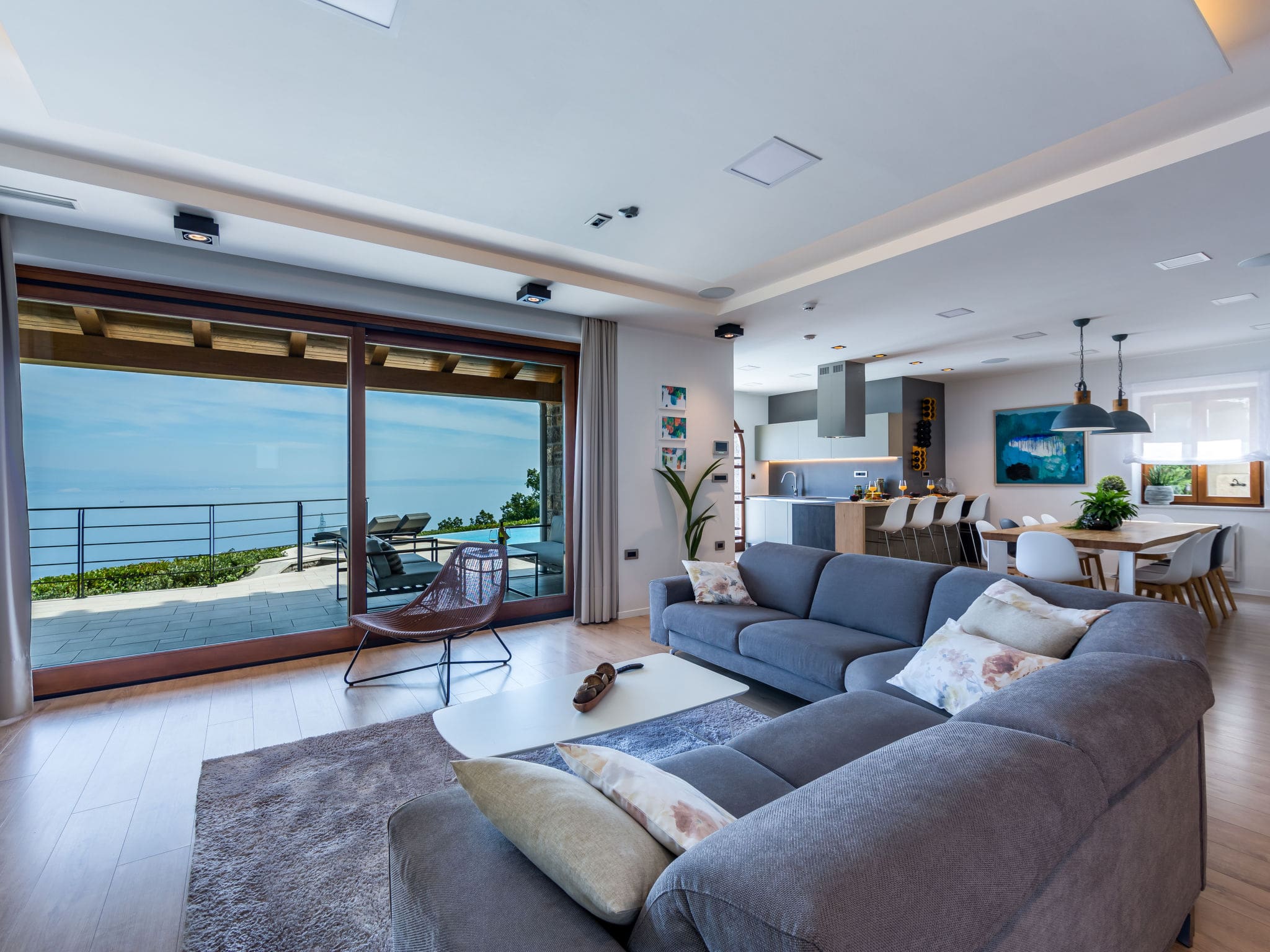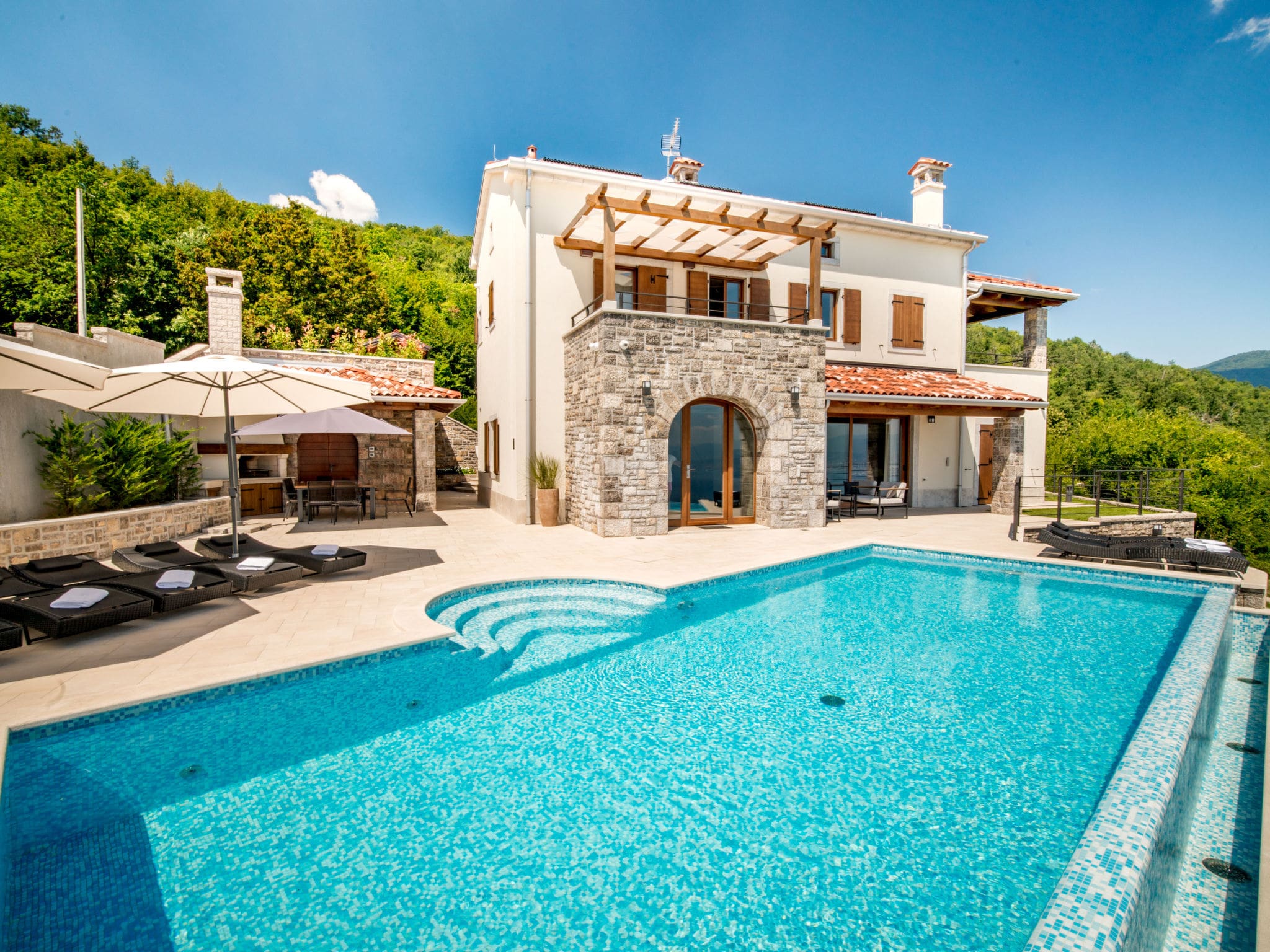 This luxury villa rental lovran experience unfolds across three elegant levels, where contemporary design meets Croatian coastal charm in the peaceful hamlet of Dobreć. Villa Dobreć perfectly balances modern sophistication with sustainable luxury, creating an exceptional retreat above the historic town of Lovran on the Istrian peninsula.