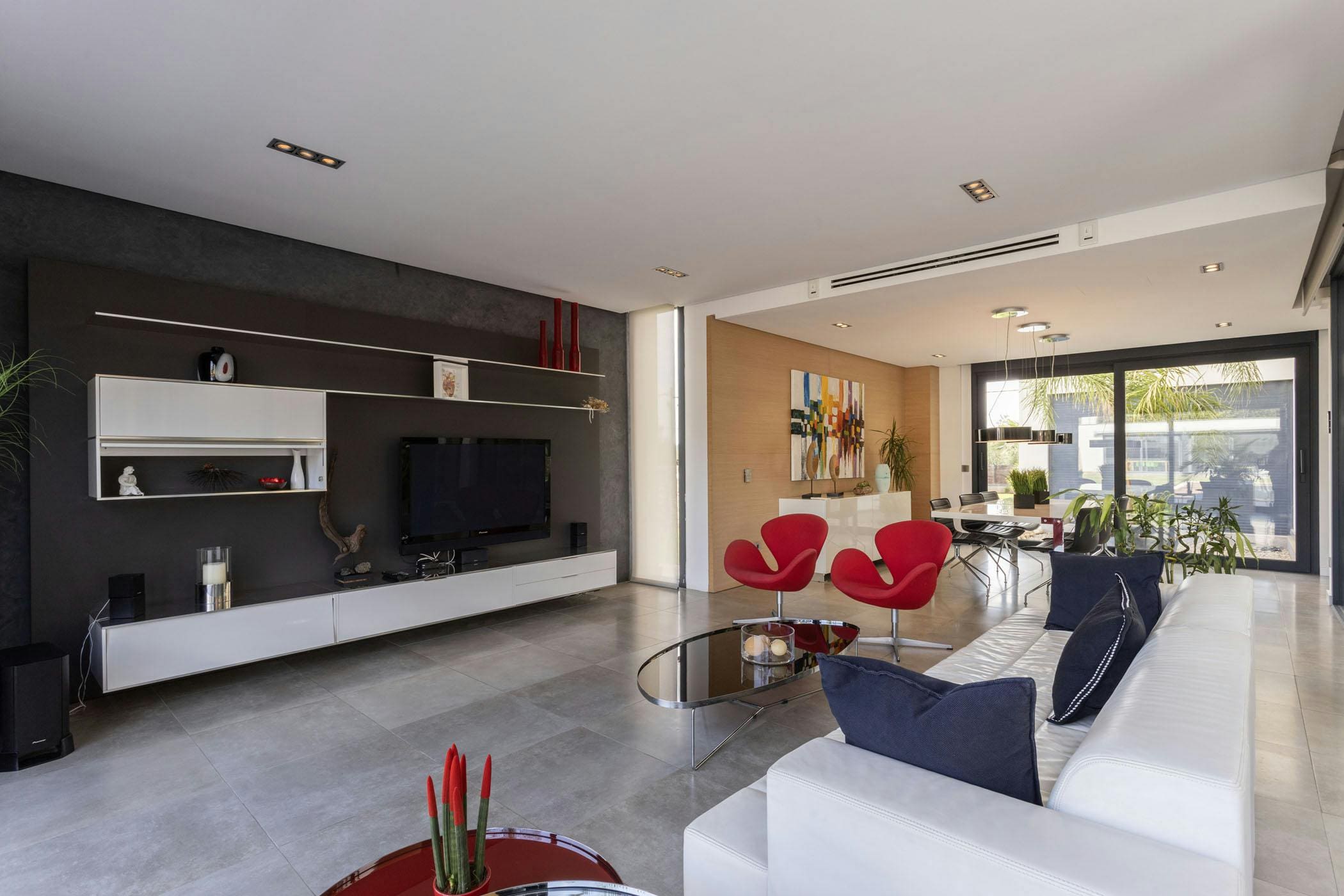The villa’s outdoor area is a true sanctuary. A sparkling swimming pool is surrounded by a large deck, ideal for sunbathing or enjoying a refreshing dip. The expansive garden includes a lush lawn and a dedicated playground for children, making it a family-friendly haven. An outdoor lounge and dining area offer the perfect setting for al fresco meals under the Mediterranean sun.