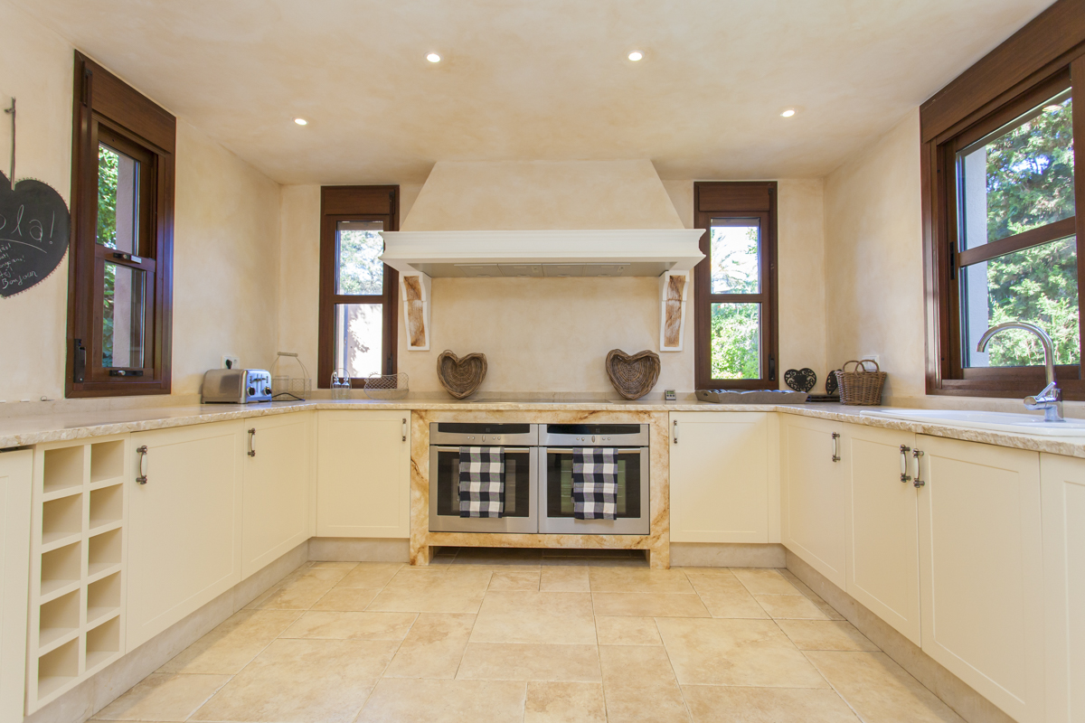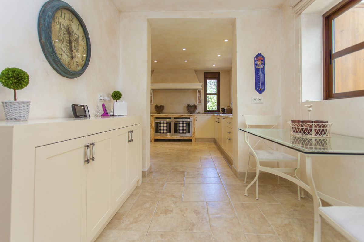 On the ground floor, you are welcomed by a spacious living area, with sumptuous seating offering views out a set of French windows onto the beautiful countryside that surrounds the property. The large well-equipped kitchen leads on to a fantastic dining area with retractable wall-to-wall windows, making the space ideal for al fresco dining, helping you make the most of those long balmy Spanish evenings.