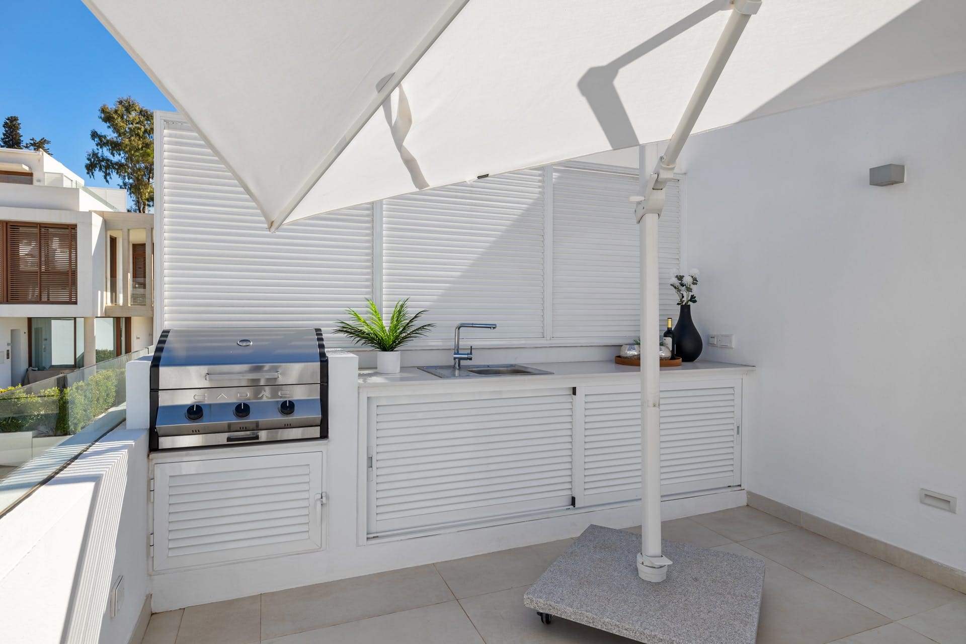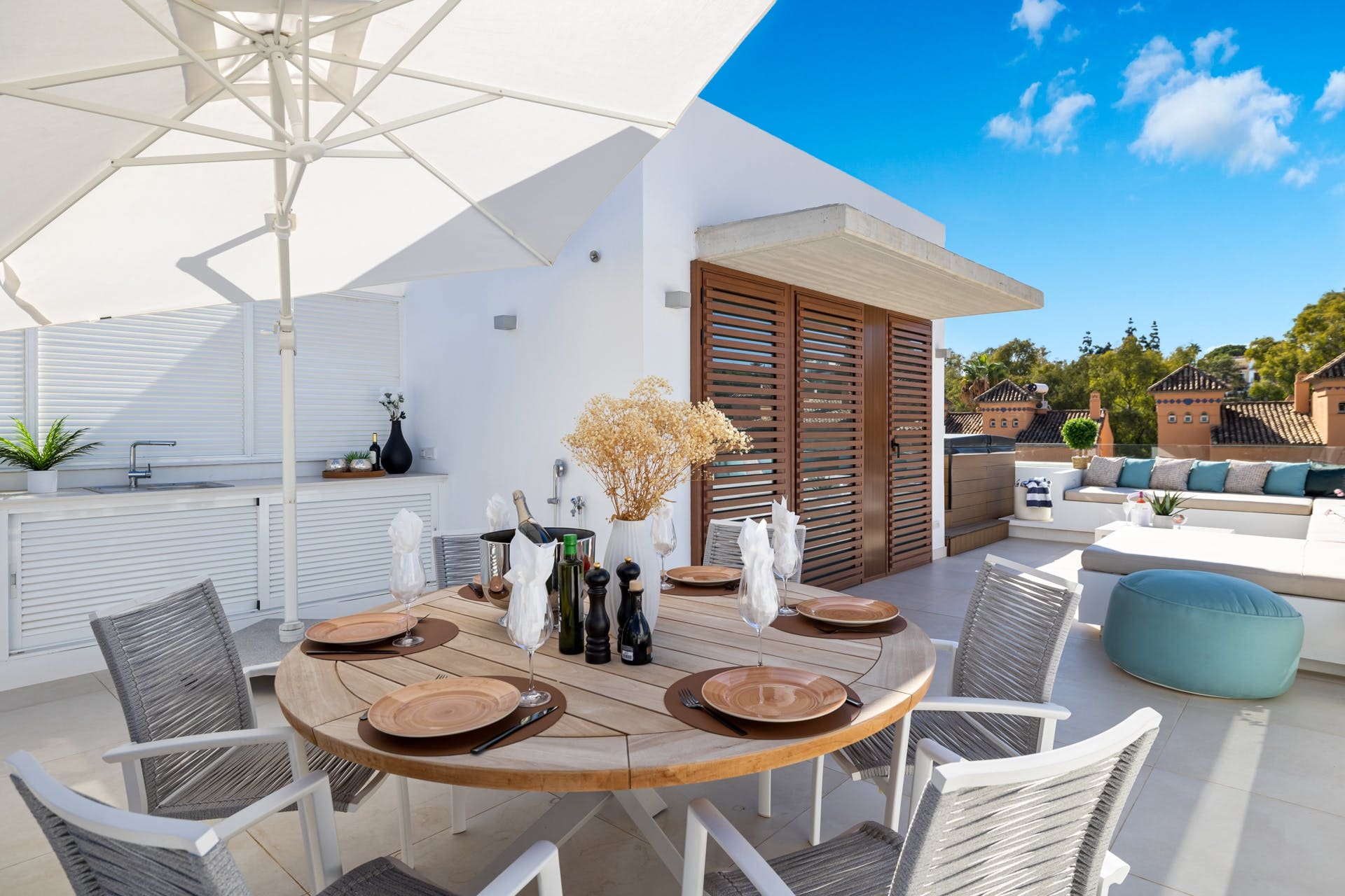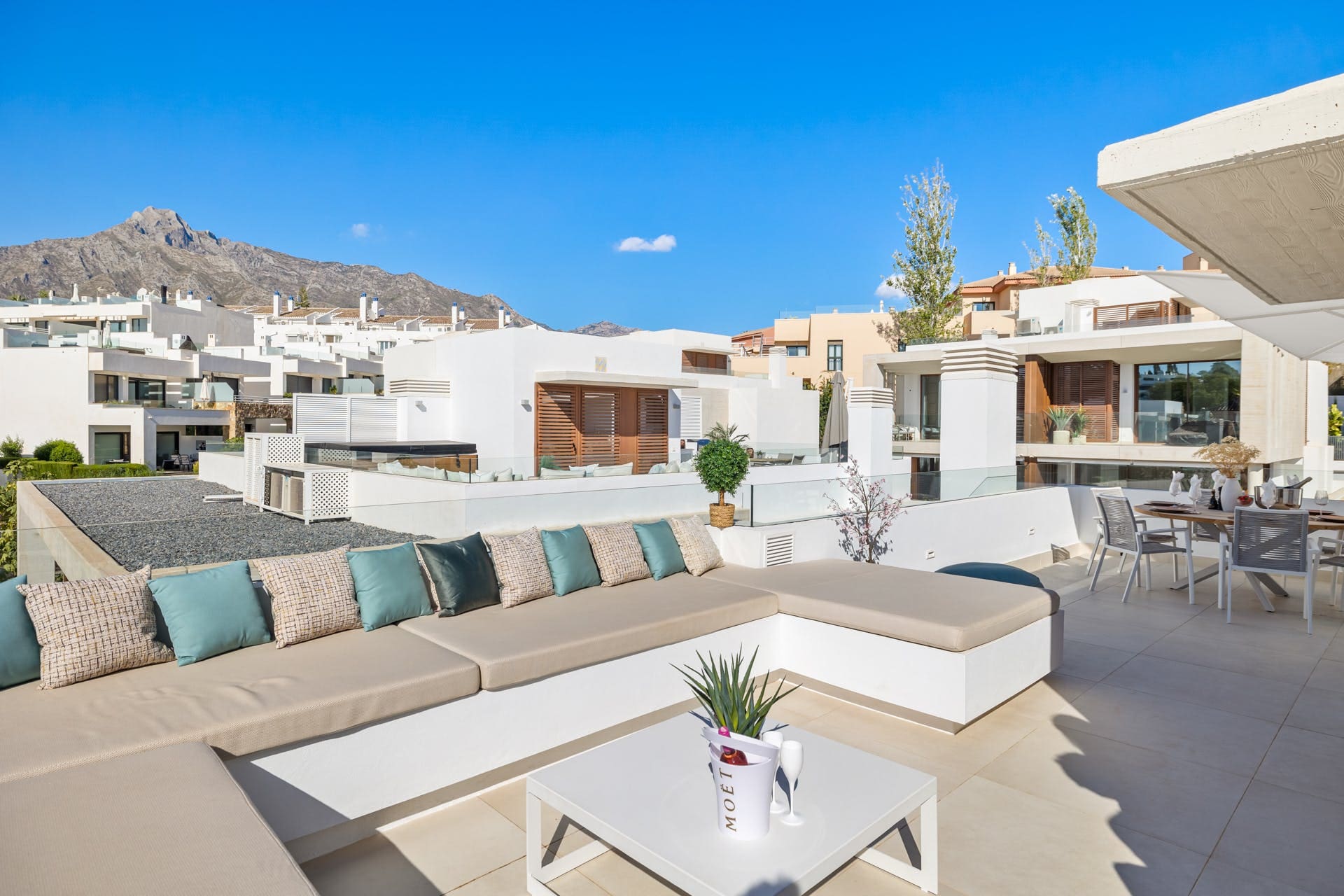 The villa’s outdoor spaces are equally impressive, with a private swimming pool and hot tub offering the perfect spots for unwinding under the Spanish sun. Enjoy alfresco dining on the terrace, surrounded by lush gardens and breathtaking sea views. Although the neighboring buildings overlook the villa, the outdoor spaces still provide a tranquil retreat.