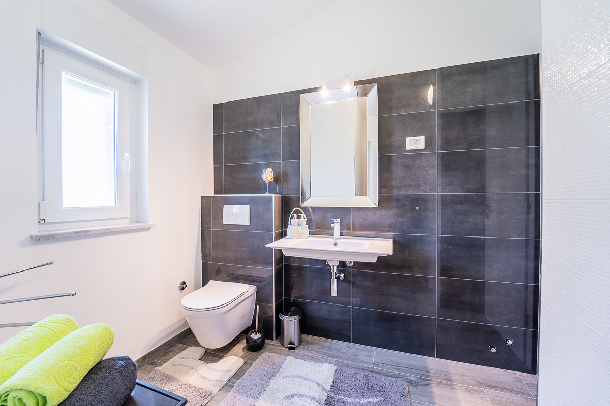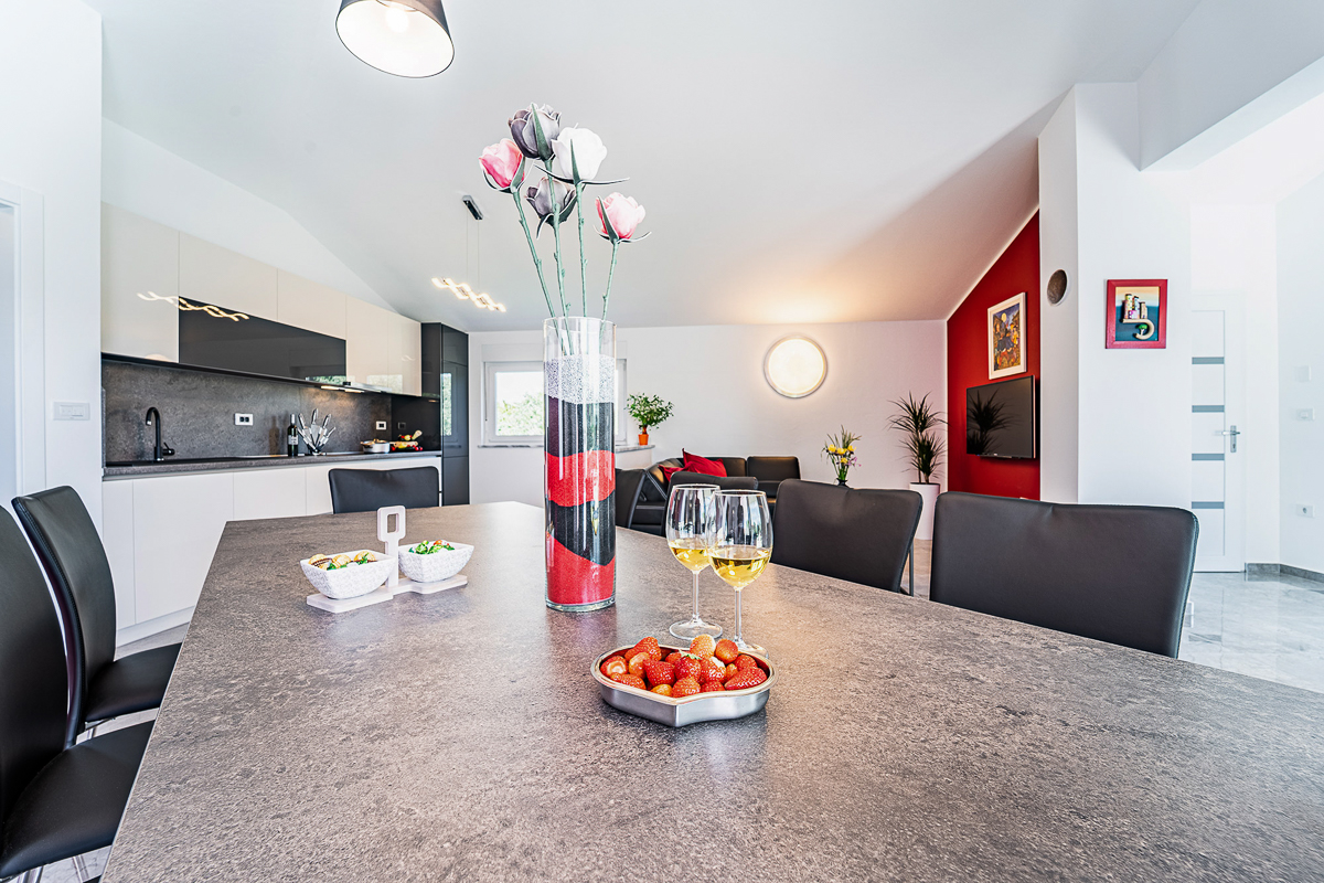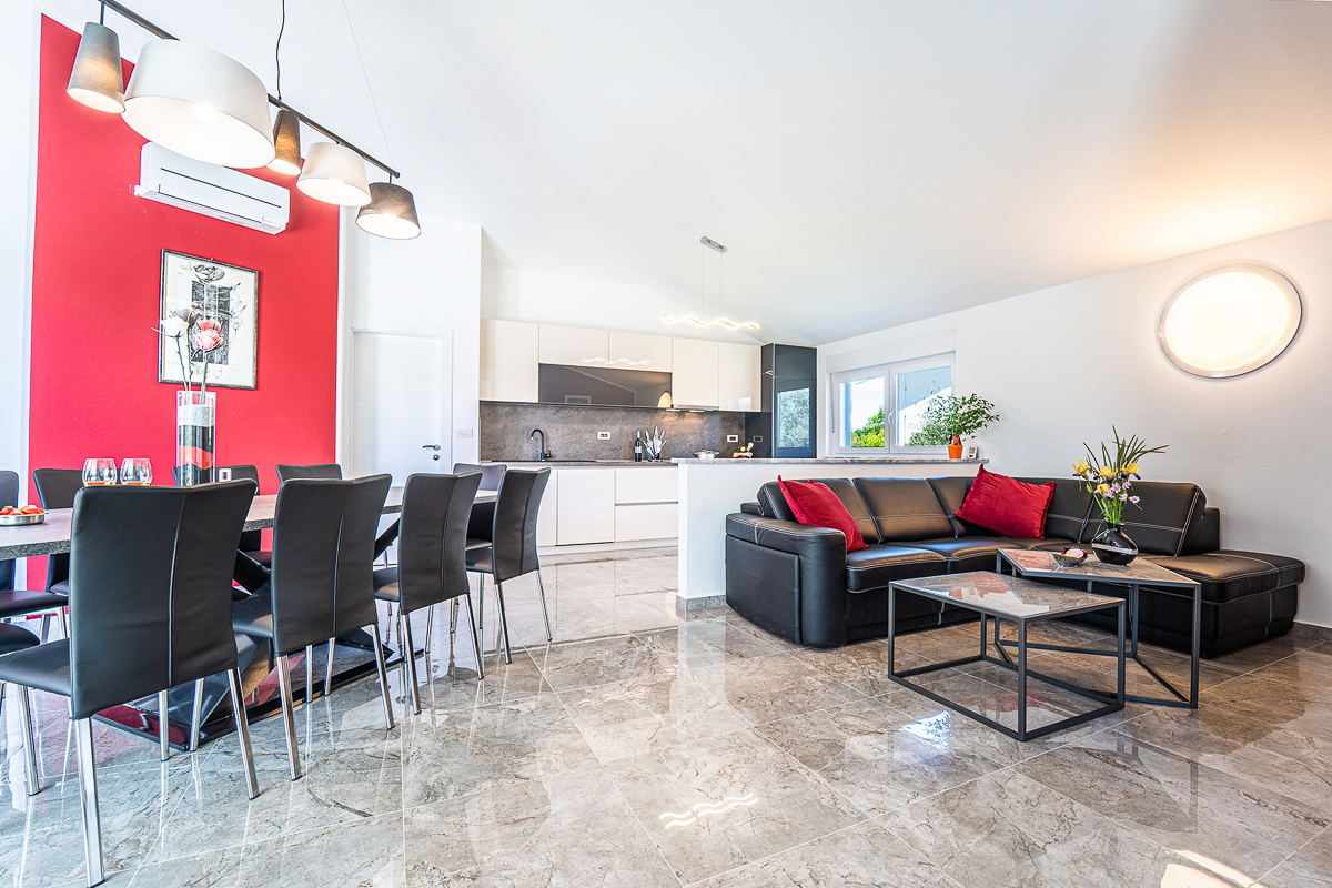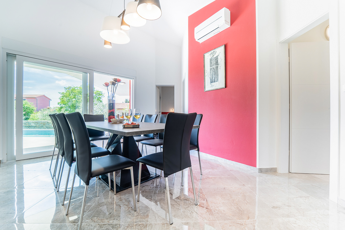 There are an impressive five bathrooms at this property, most of them conveniently ensuite. Designed in glossy grey, there are powerful showers and fresh flowers in the bathrooms. This villa is beautifully located in Krnica, close to Istria’s capital, Pula. The landscape is wild and natural, with panoramic clifftop lookouts and ridges soaring high above the glittering sea. The villa is a short drive away from the beach of Luka Krnica and close to the Glavani Park, an adventure centre with activities for the whole family. Krnica itself is home to the well-known bell tower of St. Rocco.