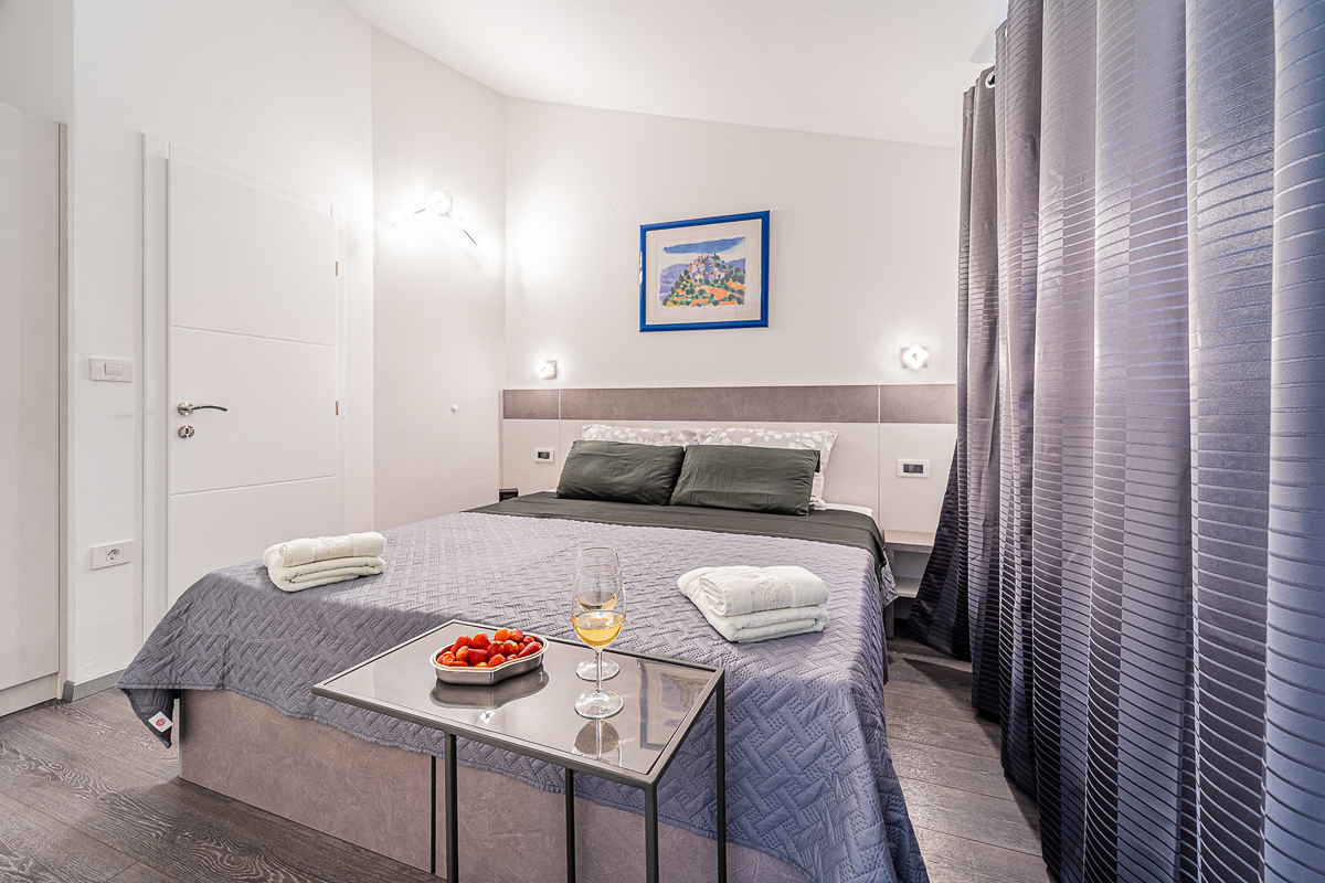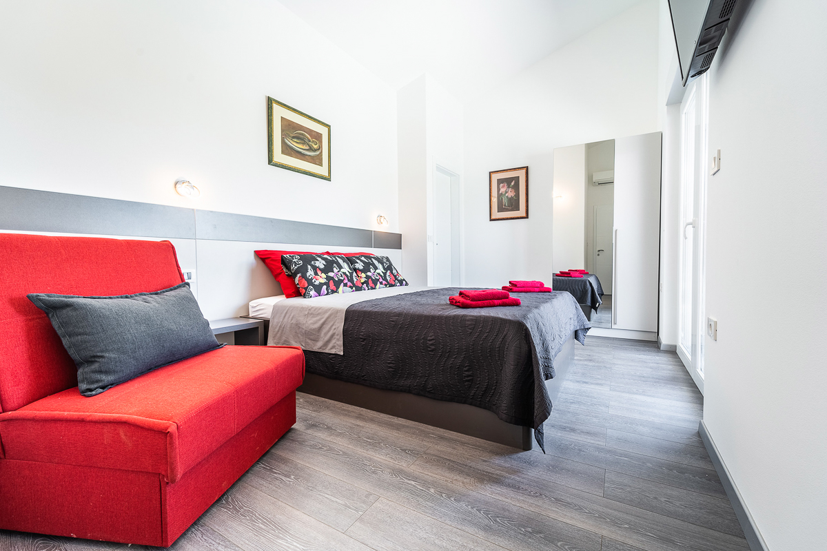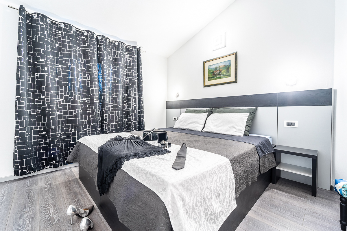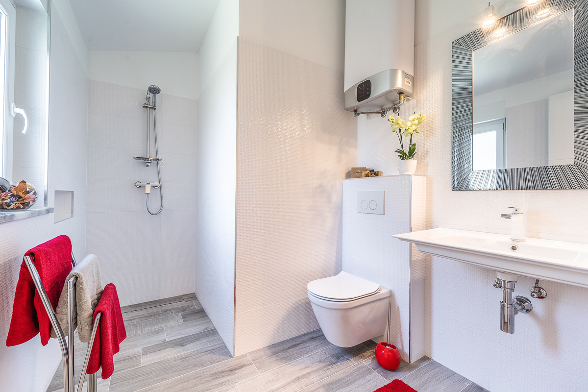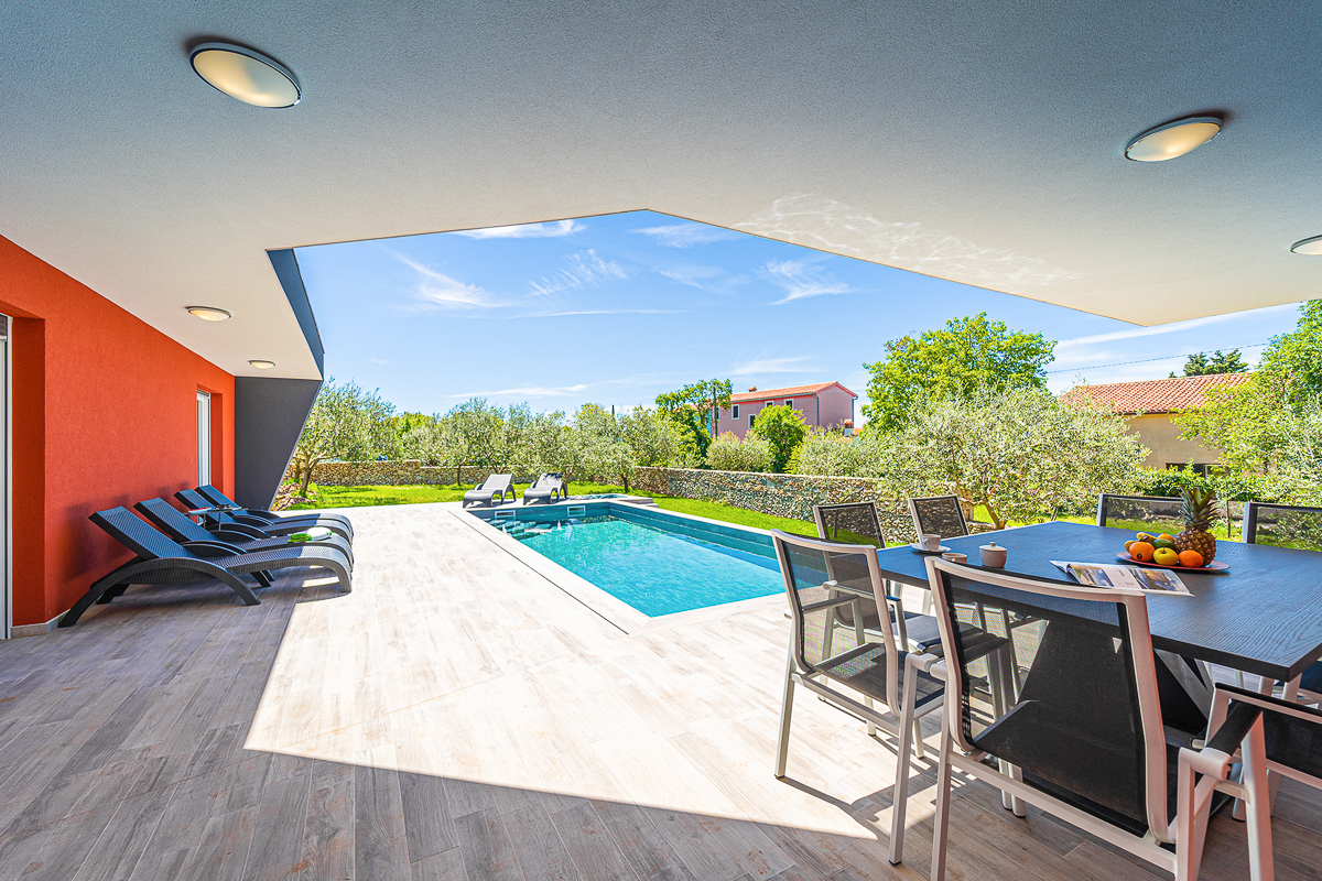 There are an impressive five bathrooms at this property, most of them conveniently ensuite. Designed in glossy grey, there are powerful showers and fresh flowers in the bathrooms. This villa is beautifully located in Krnica, close to Istria’s capital, Pula. The landscape is wild and natural, with panoramic clifftop lookouts and ridges soaring high above the glittering sea. The villa is a short drive away from the beach of Luka Krnica and close to the Glavani Park, an adventure centre with activities for the whole family. Krnica itself is home to the well-known bell tower of St. Rocco.