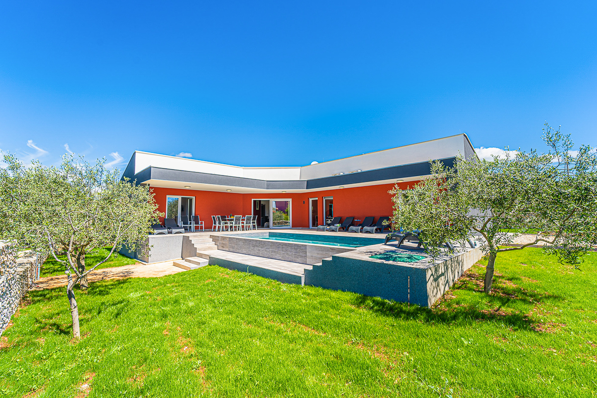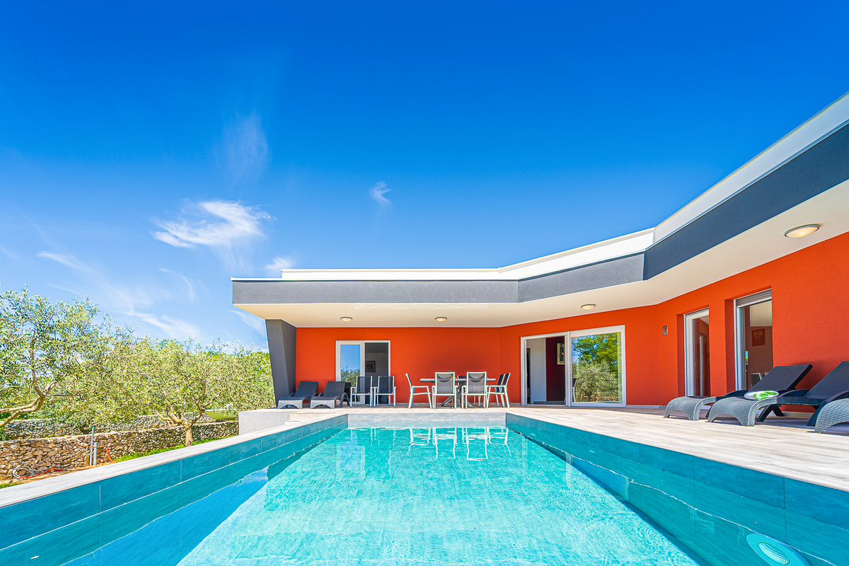 A charming villa with vibrant orange walls, an interesting shape and a lovely outdoor space, Villa Kresten is perfect for those looking for a modern holiday apartment. In front of the villa, there is a shimmering plunge pool, with the decking raised above the spacious garden that surrounds it.