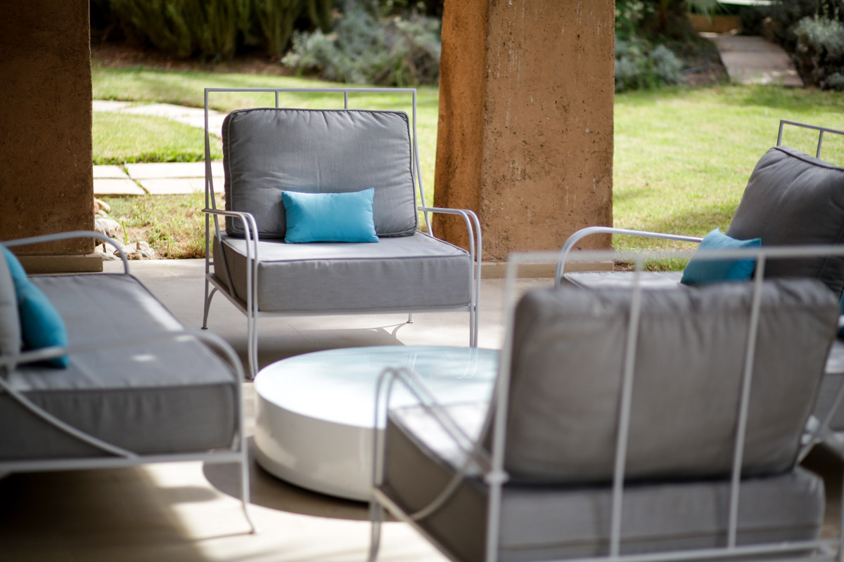 This beautiful villa is of a contemporary Moroccan style boasting a rustic exterior which has been finished in a deep sandy brown, reminiscent of those famed Saharan sands, perfectly matching the African summer heat. Continuing the exploration of this villa’s exterior, guests will come across one of the homes more stunning features as they are met by the allure of the crystal clear, cool waters of the swimming pool. This pool is nestled amongst the natural greenery of the garden, surrounded by wild trees, shrubbery and soft grass, which provides a welcome texture beneath ones feet after treading water in the pool. Also found poolside are two very cosy sun loungers which make a great place to dry off or read a book while soaking up the afternoon sun. Still outside but a few steps from the pool is a beautiful covered terrace area which provides more comfortable seating as well as the option for al fresco dining with a large dining area, with seating for up to eight friends.