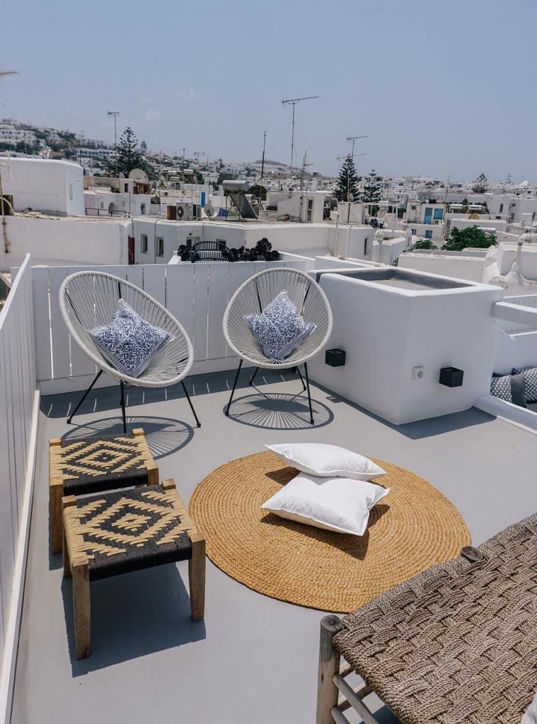 The first two words – rooftop Jacuzzi. The next two – windmill view. This dual-level rooftop terrace is breathtaking. Relax on rattan lounge furniture while you gaze out to 360-degree vistas of the city and sea. Or sip champagne in the bubbles while Greek folk music drifts up from the bustling streets below.