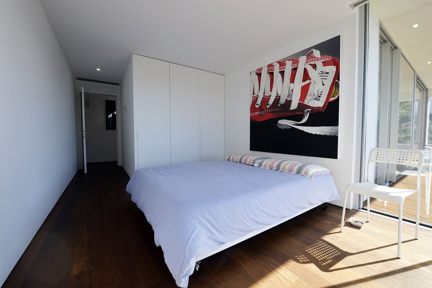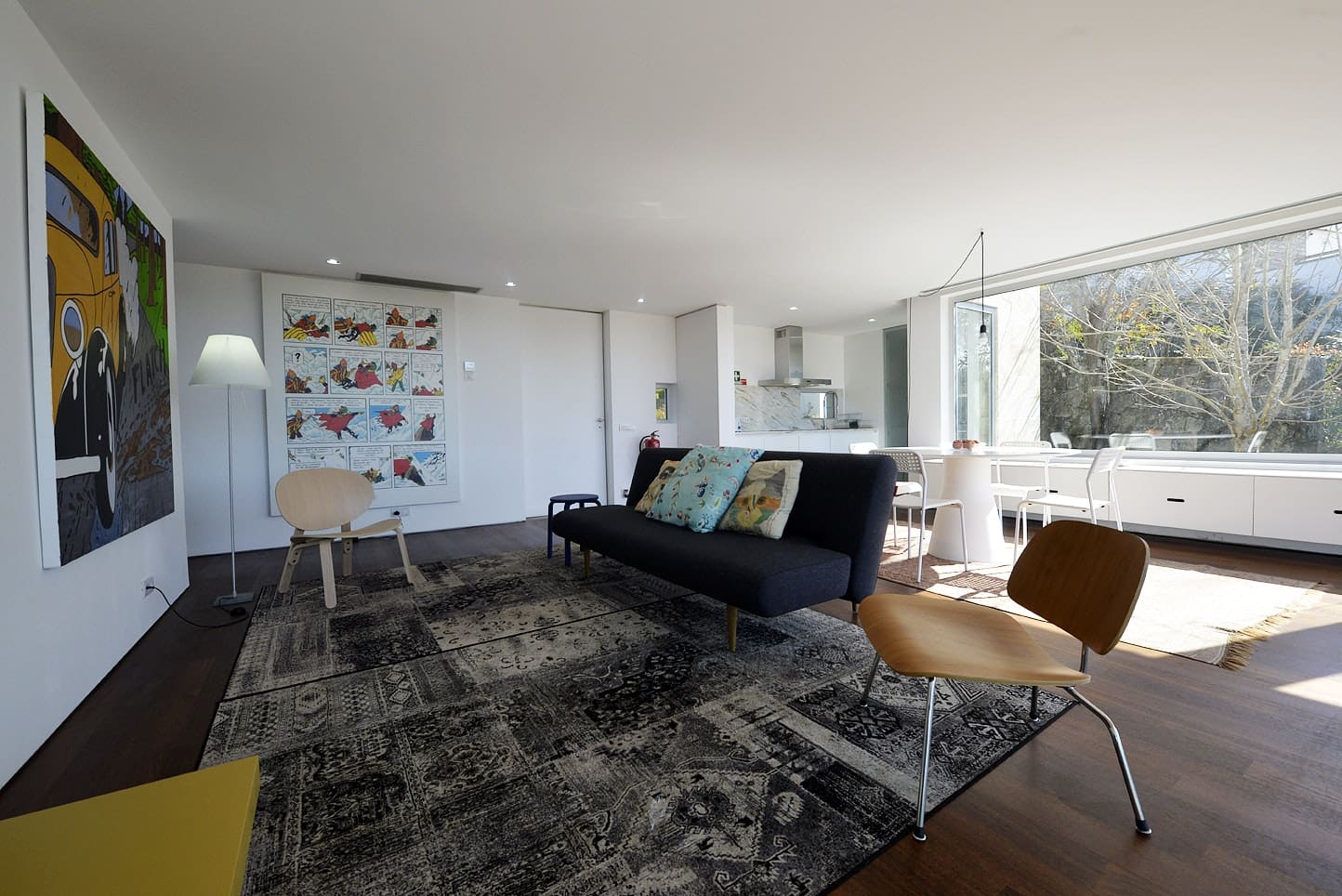 Stepping inside, you’ll immediately notice the modern touch that’s been given to the villa – from the pop art adorning the walls to the patterned rugs and string lighting. Mastering indoor-outdoor living, the interiors benefit from a vast casement window and sliding glass doors that invite sunlight into the living area and keep the picturesque views at the forefront of the home.