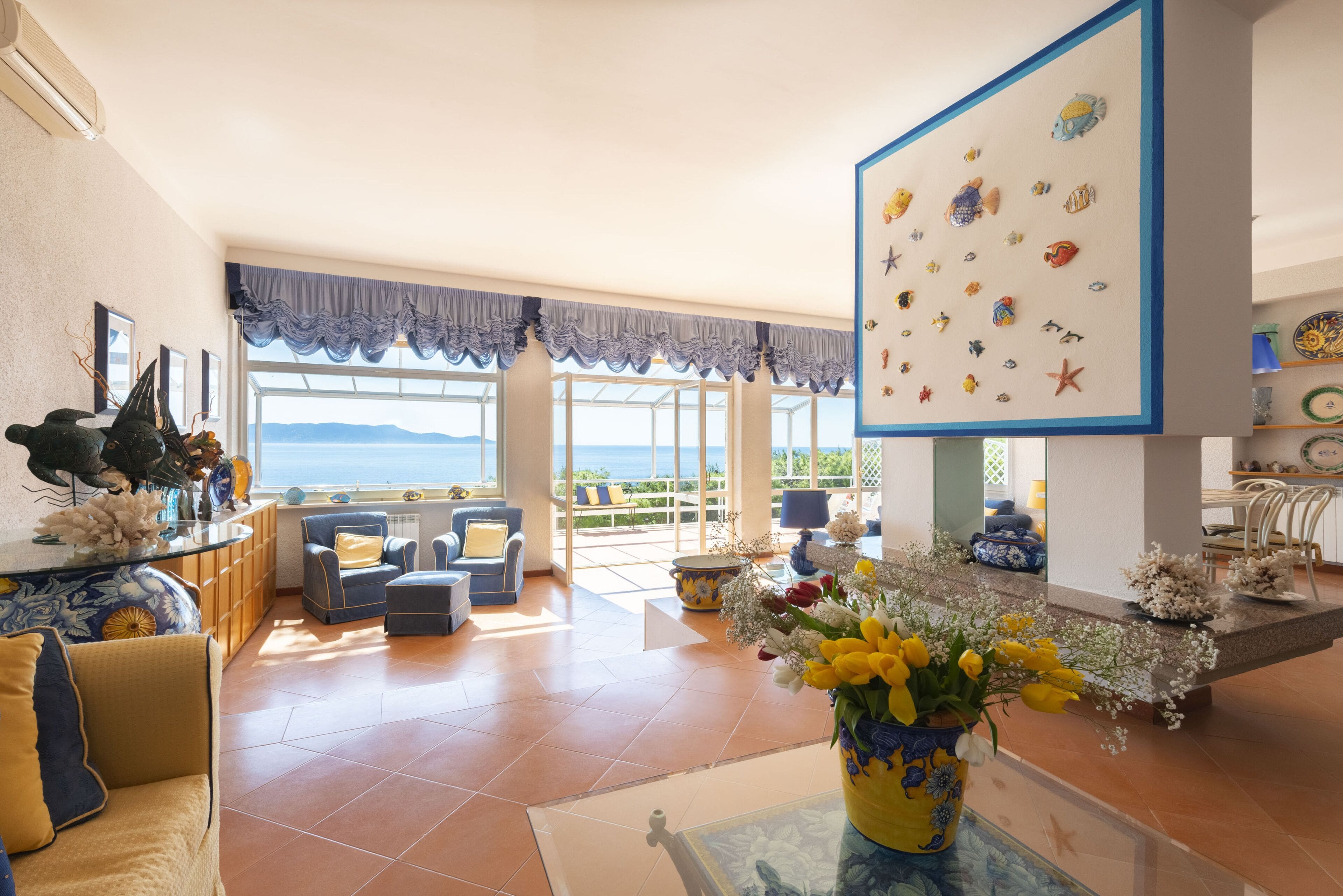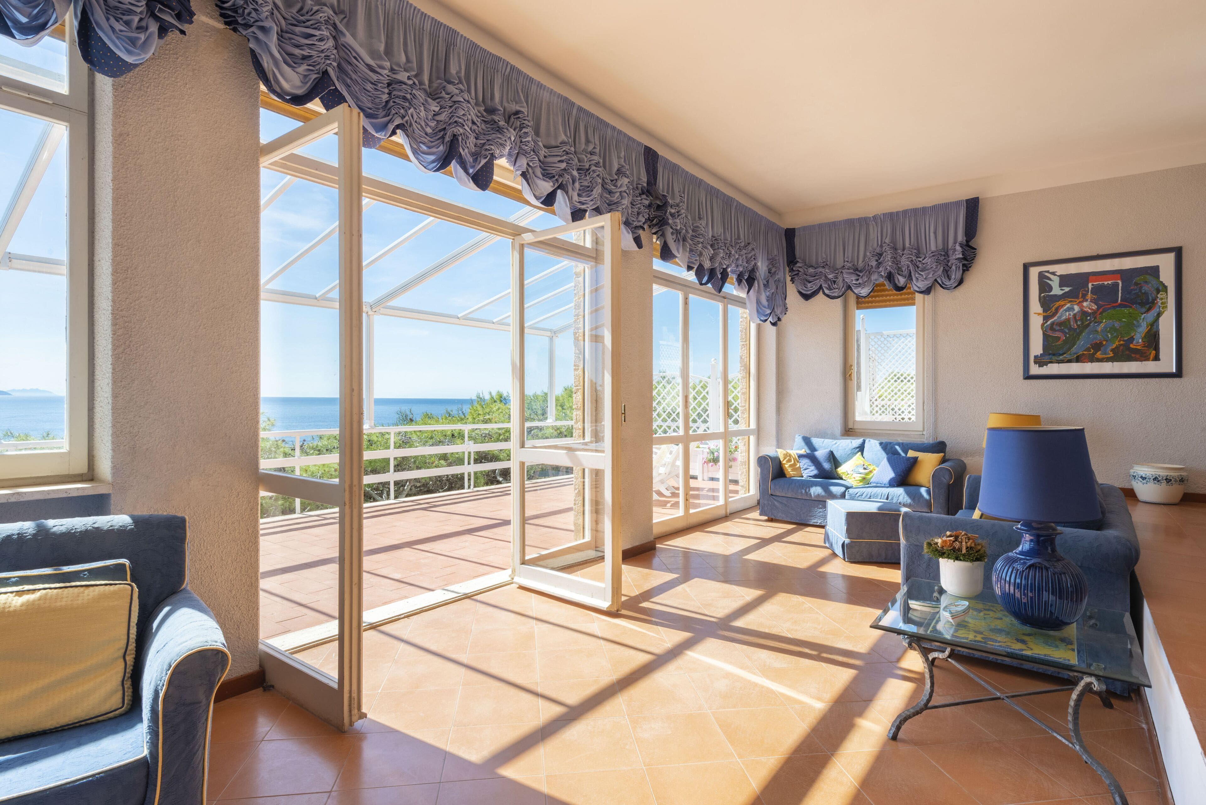 Step inside this beautifully designed villa and be greeted by spacious living areas that exude elegance and comfort. The open-plan living room, with its wall of windows, invites natural light and showcases stunning seascapes. Each of the five bedrooms is thoughtfully furnished, ensuring a restful retreat. The villa’s well-equipped kitchen is perfect for preparing authentic Italian meals, while the dining area offers a cozy setting for family gatherings.