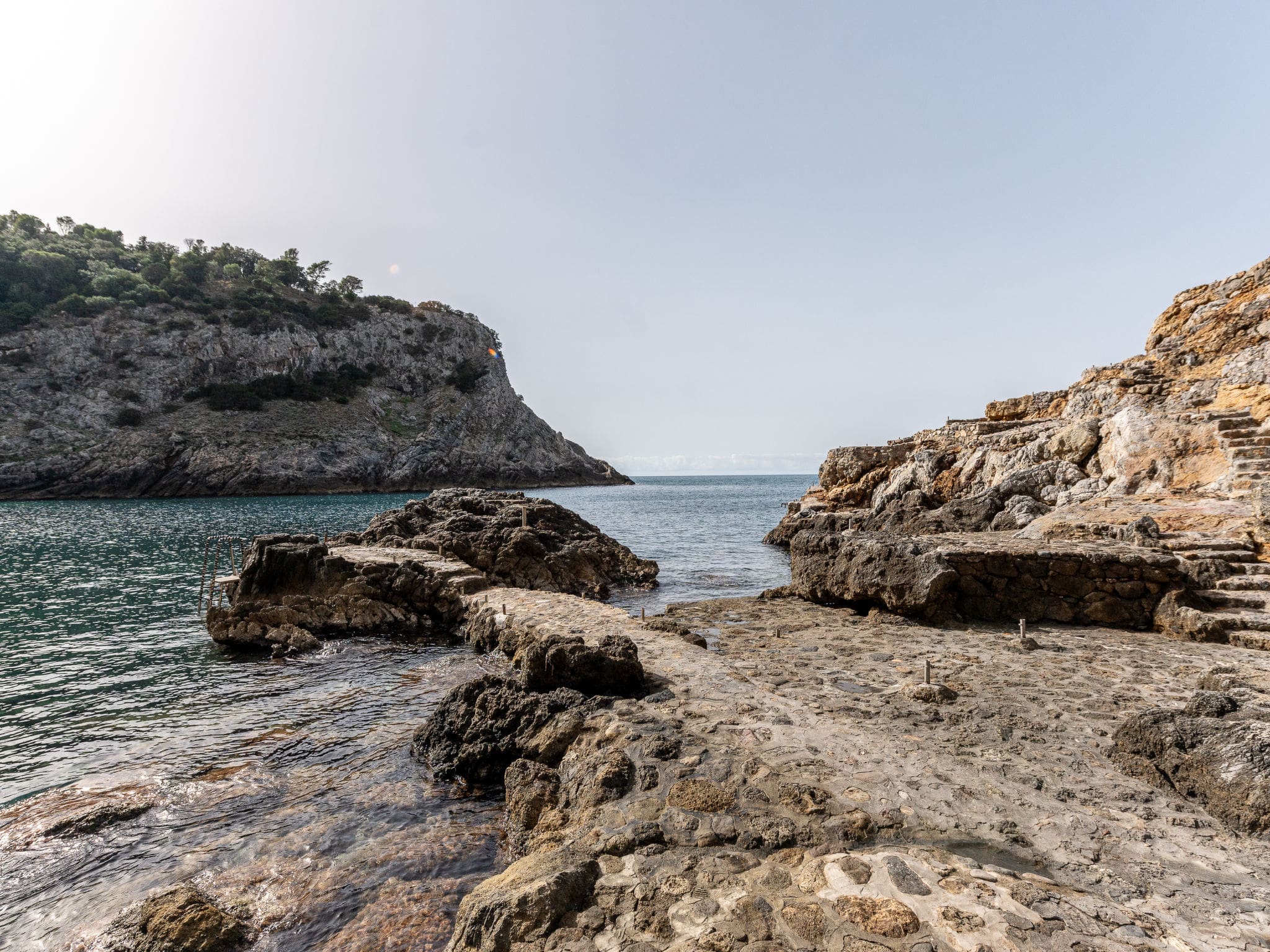 Guests enjoy exclusive access to the private bathing establishment at Cala Piccola, complete with complimentary sun umbrella and deckchairs. The facility includes a bar and snack bar, operating from June through September with convenient shuttle service. The rocky shoreline provides direct sea access, creating an intimate connection with the pristine Mediterranean waters.