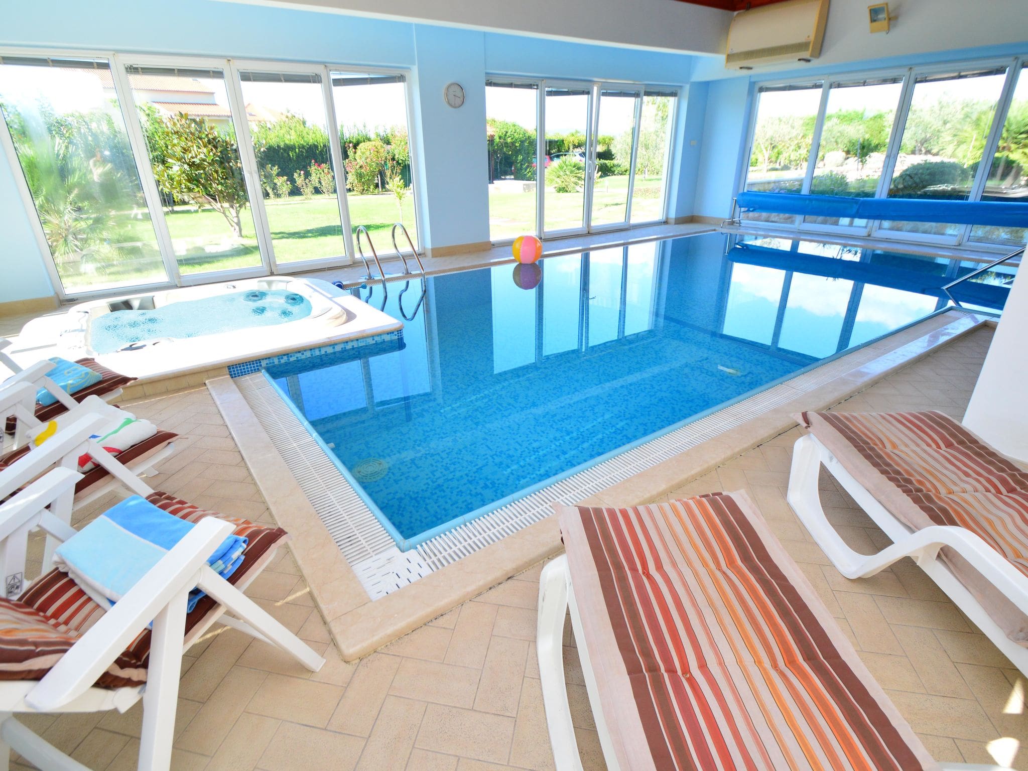 The villa’s crowning glory lies in its exceptional outdoor facilities, headlined by a magnificent heated indoor pool measuring eight by four metres with depths ranging from 160 to 180 centimetres. This angular pool features a sophisticated counterflow system for aquatic exercise, while the adjoining hot tub provides the ultimate relaxation experience. The pool area includes its own shower and WC facilities, ensuring complete convenience for extended poolside enjoyment.
