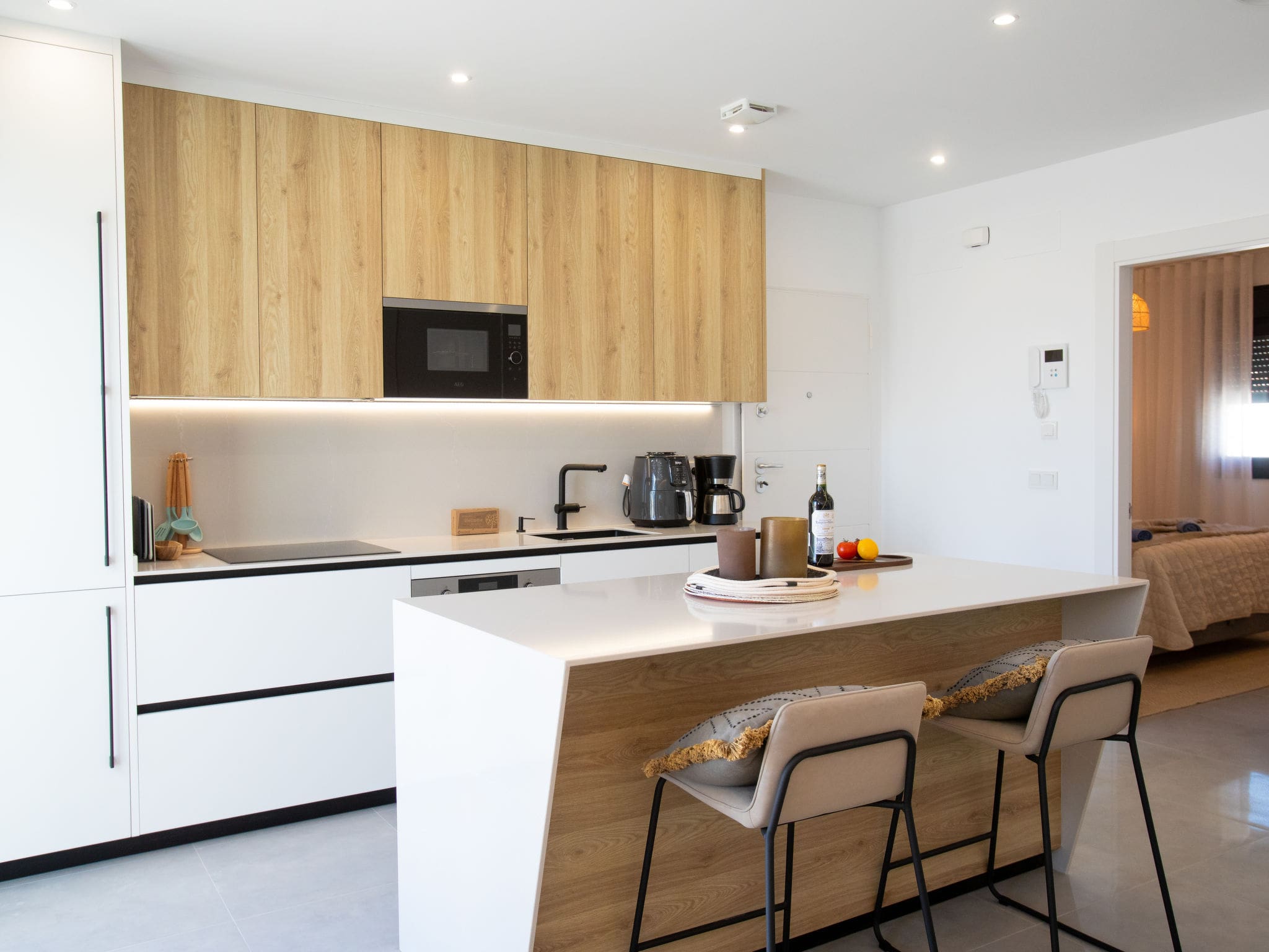 The heart of the villa lies in its spectacular upper-floor living and dining area, where floor-to-ceiling windows frame the azure Mediterranean horizon. The open-plan kitchen represents the pinnacle of modern design, featuring a sophisticated cooking island, ceramic glass hob, premium appliances including dishwasher and microwave, and an electric coffee machine for morning rituals. Three fully appointed bathrooms, including one en-suite, feature water-efficient fixtures and contemporary shower facilities.