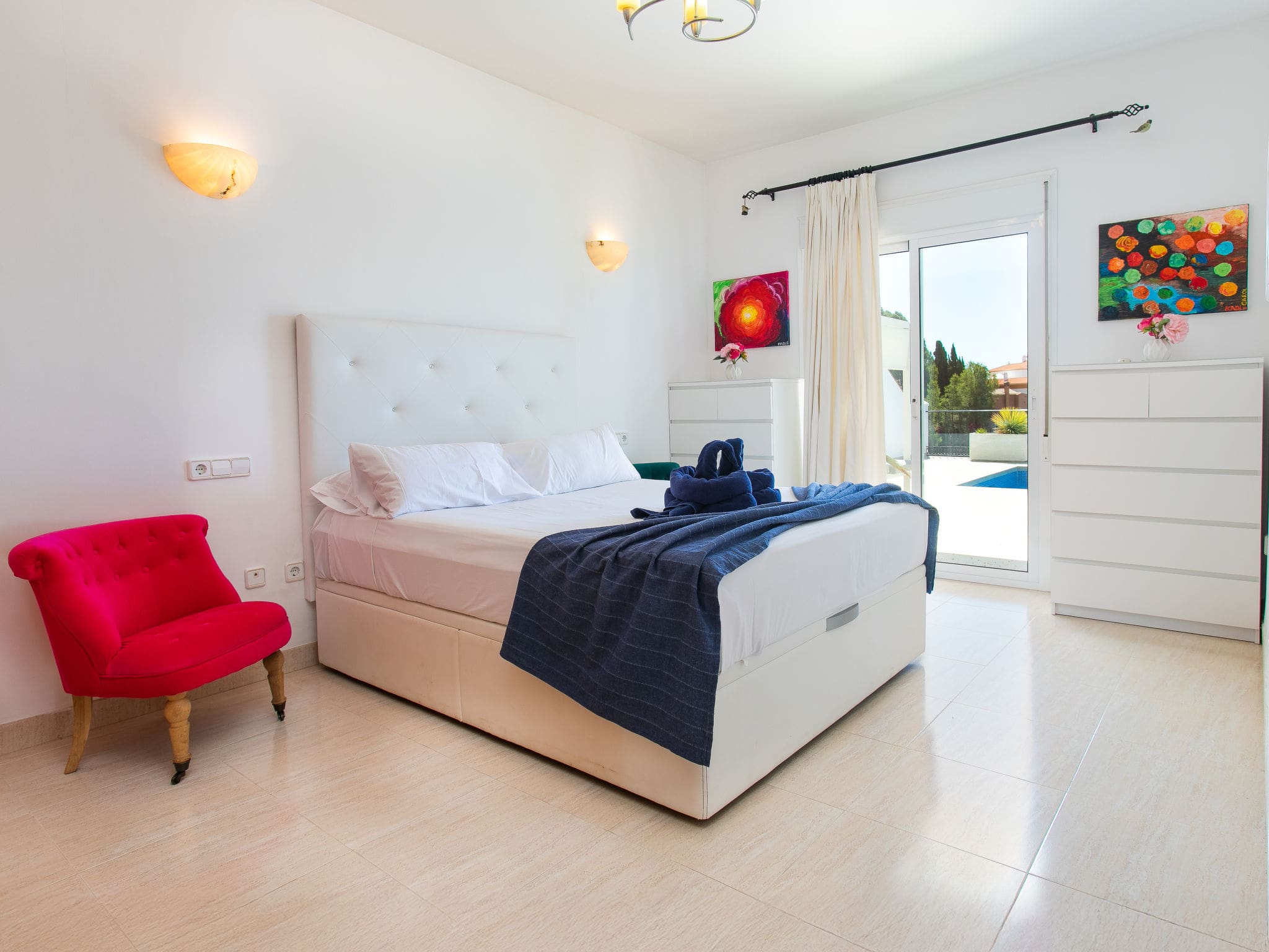 Three beautifully appointed bedrooms accommodate up to eight guests across the property’s single level and lower ground floor. The master suite features a French bed and private bathroom with both bath and shower facilities, while opening directly onto the pool terrace. A second bedroom offers twin beds with terrace access, and the lower level provides a spacious room with two French beds, its own shower room, and a separate playroom area. Five bathrooms throughout ensure convenience for larger groups.