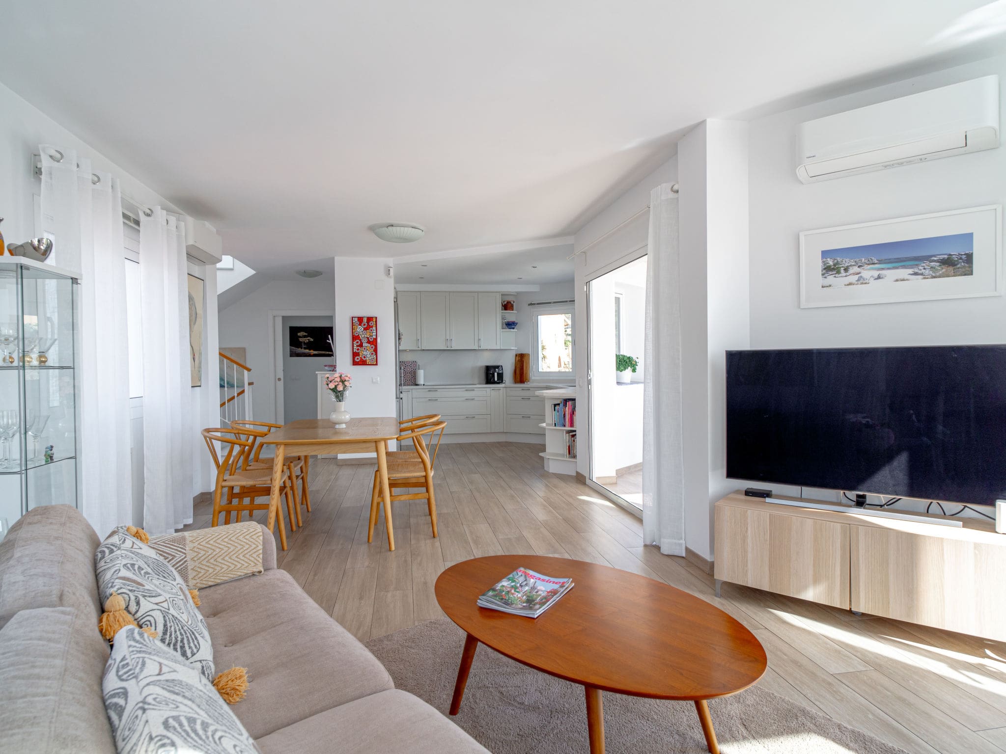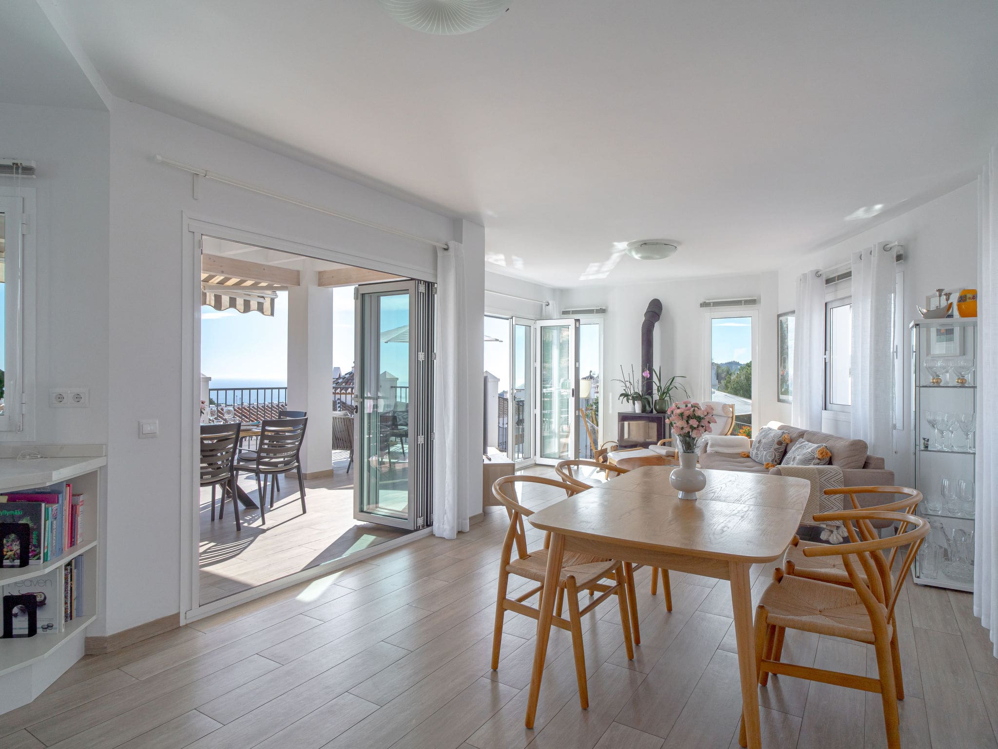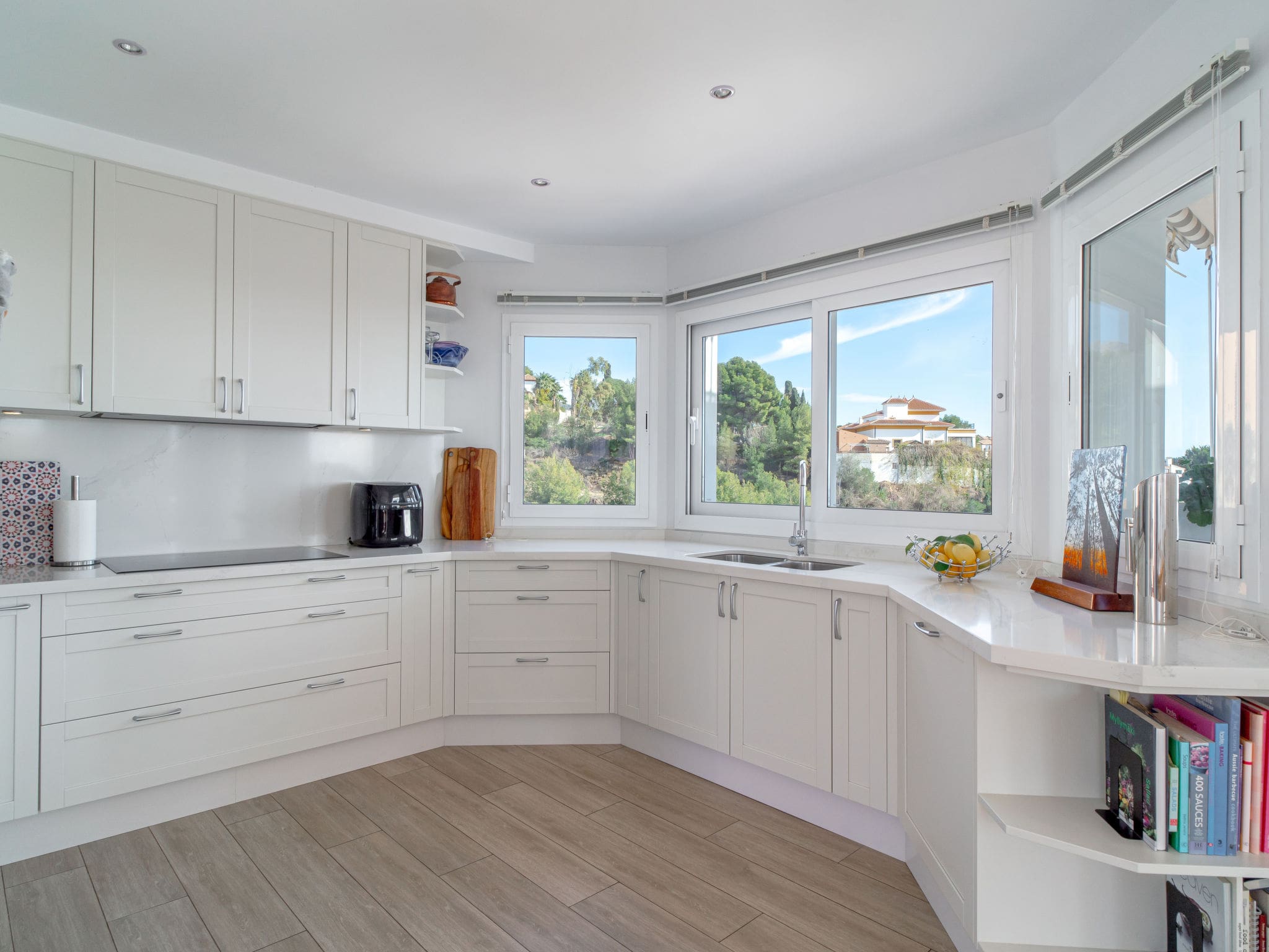 Spanning 240 square metres across three thoughtfully designed levels, this modern villa showcases Scandinavian-inspired interiors with elegant wood-effect tiled flooring throughout. The open-plan living and dining area serves as the heart of the home, featuring a striking wood-burning stove, air conditioning, and floor-to-ceiling windows that frame spectacular views of the Mediterranean coastline and surrounding mountains. The contemporary kitchen comes fully equipped with premium appliances including a dishwasher, ceramic hob, microwave, and Nespresso coffee machine.