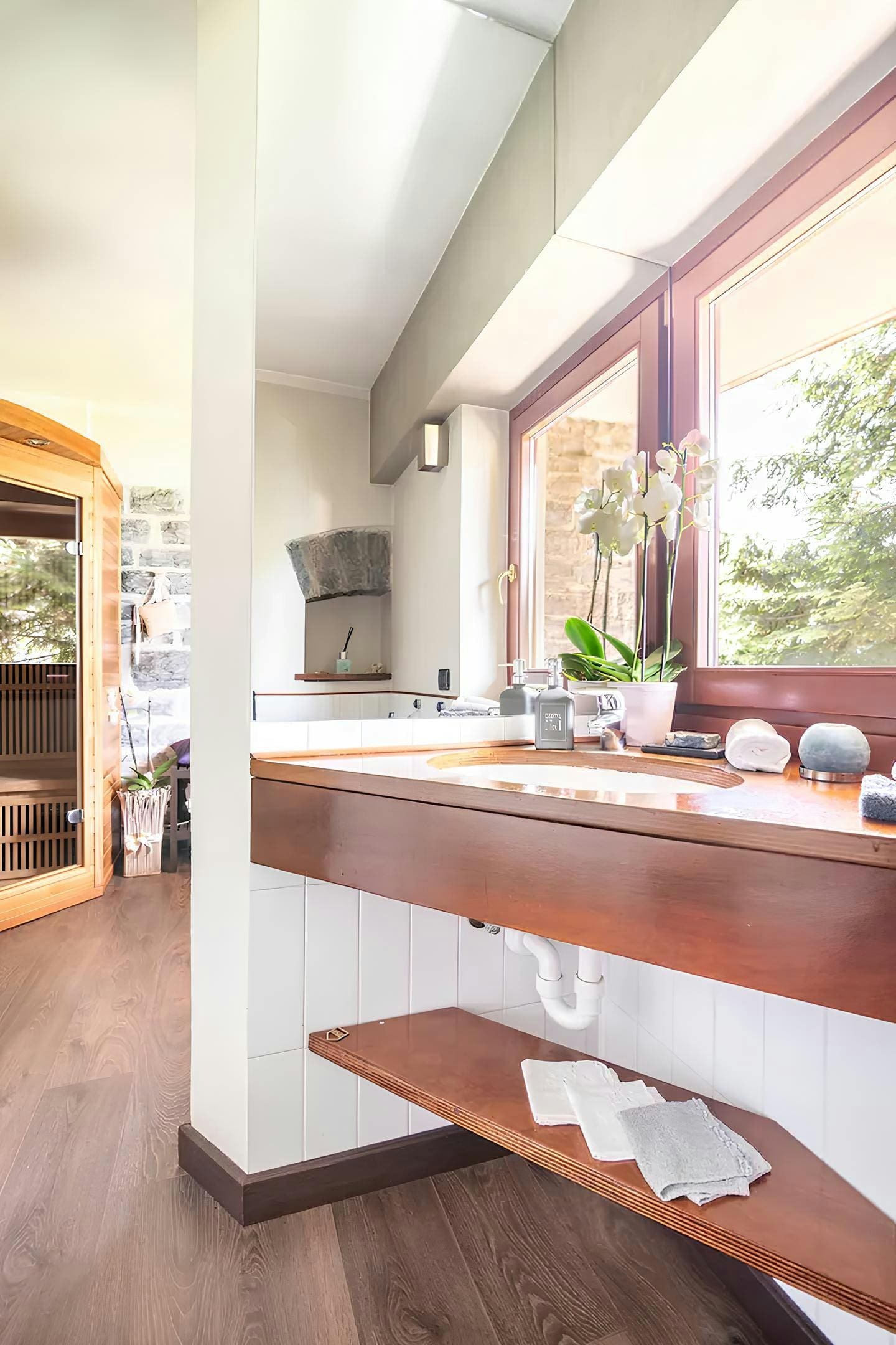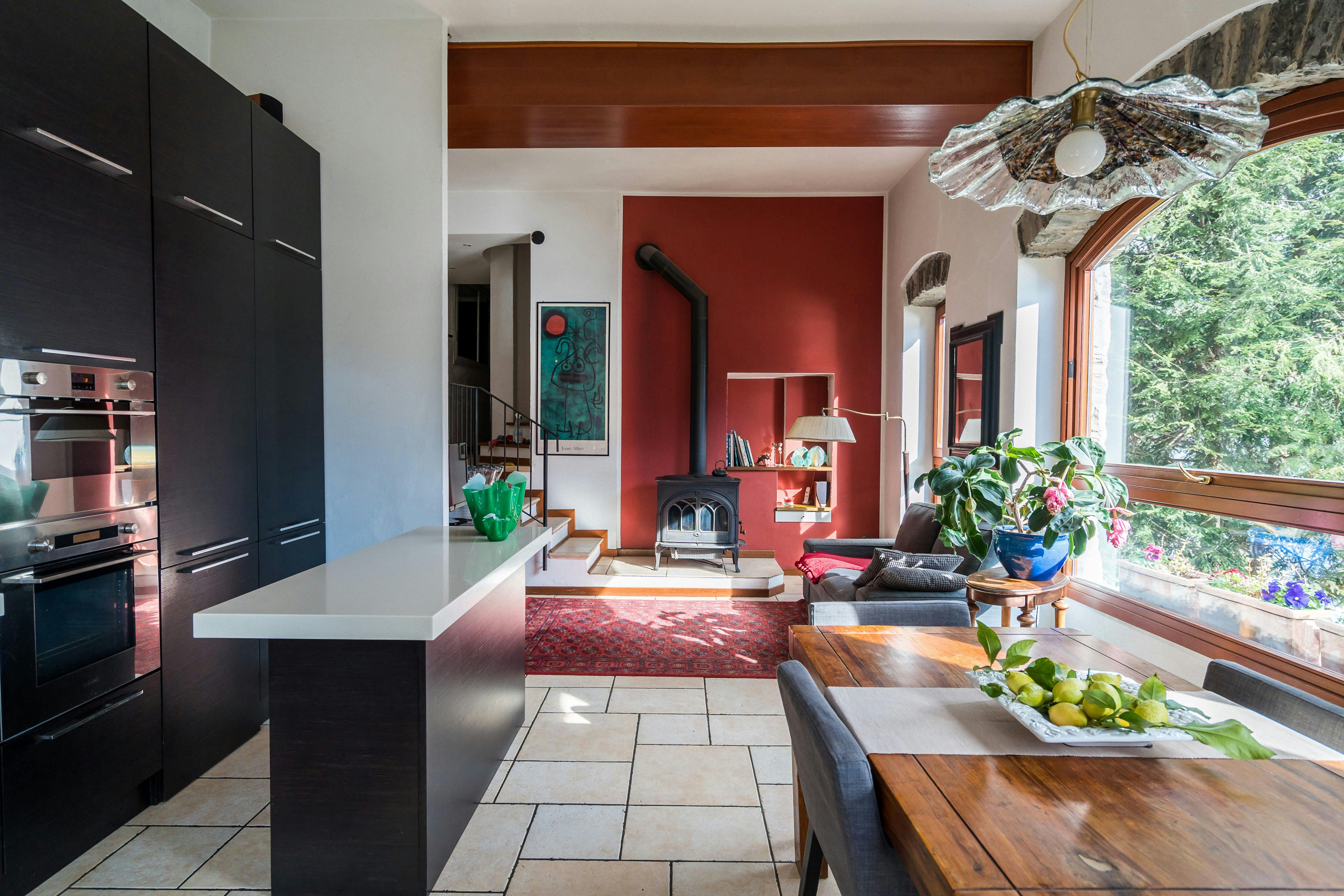 Villa Sasso Nesso presents a beautifully designed interior that perfectly balances modern luxury with traditional Italian charm. The open-plan living area features expansive windows, allowing natural light to flood the space and offering breathtaking views of the lake. The kitchen is fully equipped with top-of-the-line appliances, perfect for preparing meals to enjoy in the dining area or on the outdoor terrace. The villa’s single bedroom is a haven of comfort, while the elegant bathroom includes a luxurious sauna for ultimate relaxation.