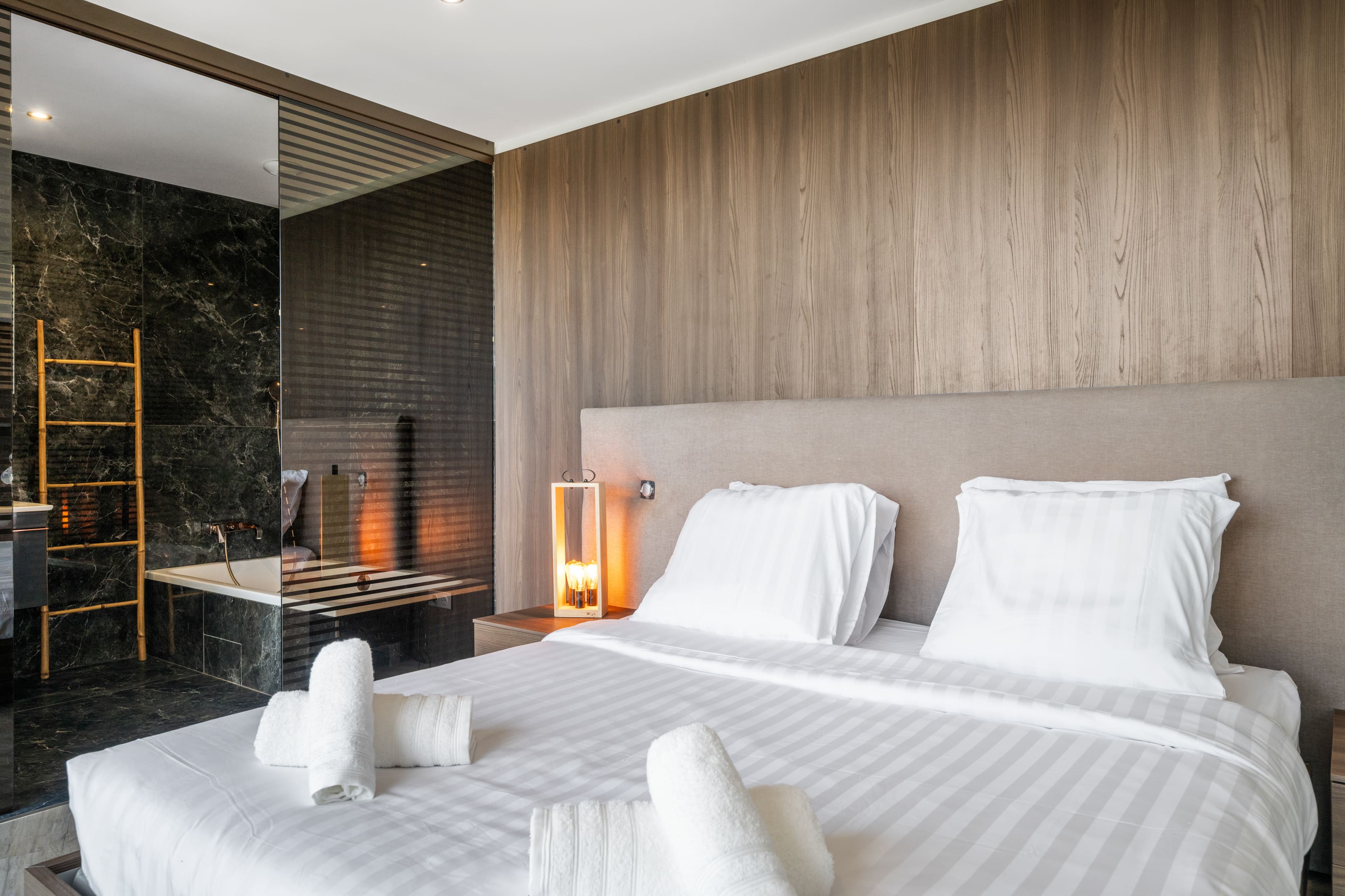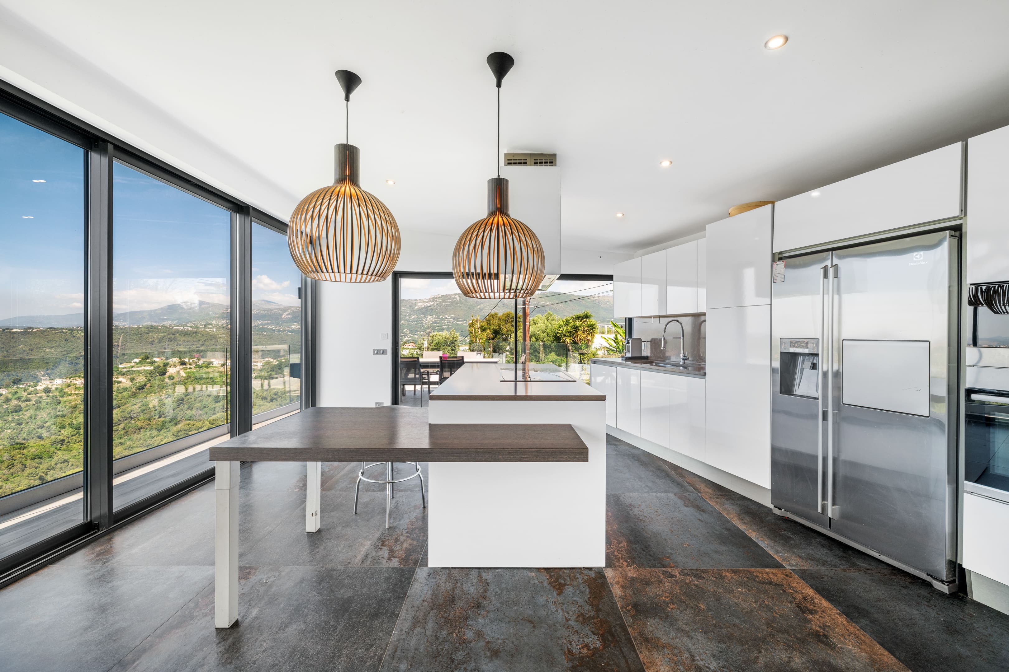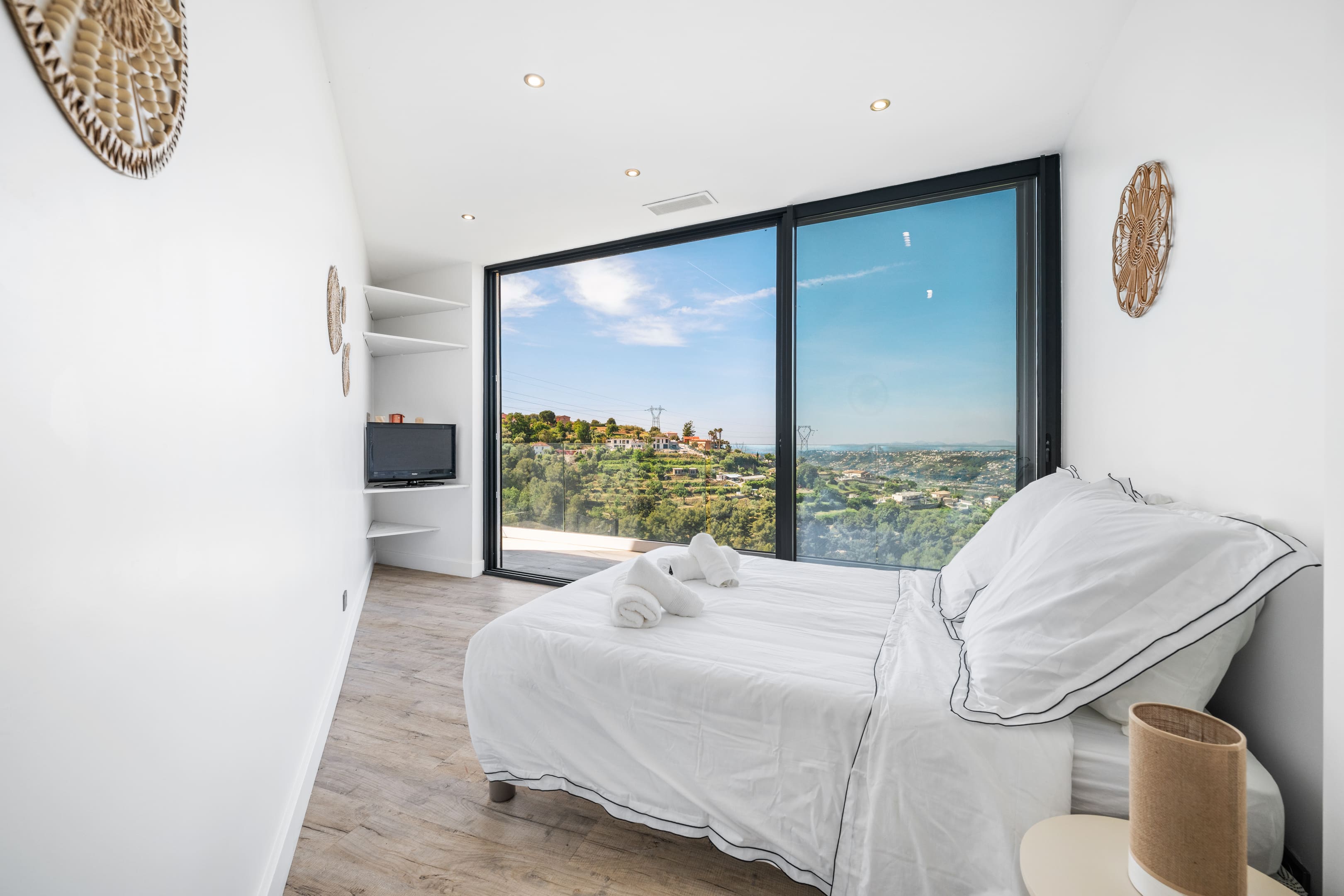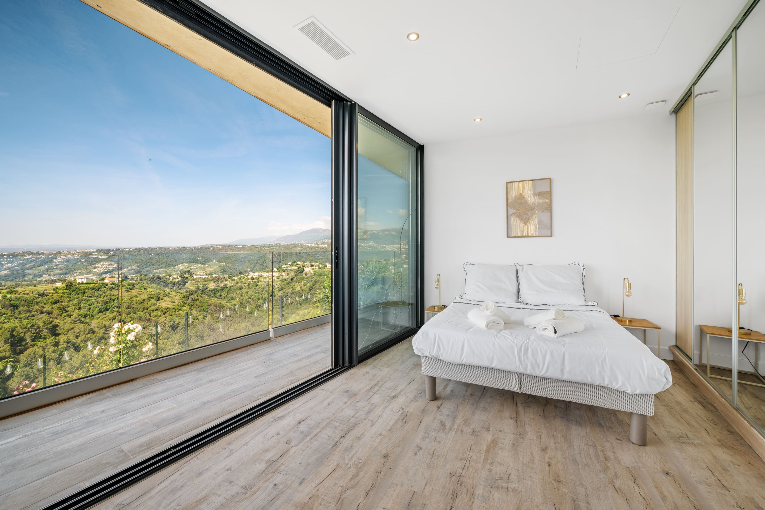 Step inside this magnificent villa to find a blend of modern elegance and classic French charm. The spacious living area is designed for comfort, featuring plush seating and large windows that frame the spectacular hillside vistas. The kitchen is fully equipped with state-of-the-art appliances, perfect for preparing gourmet meals. With four beautifully appointed bedrooms, the villa accommodates up to eight guests. The en-suite bathroom features a partially screened glass wall, adding a touch of contemporary style. Note that, as is typical in France, the toilets are separate from the bathrooms.