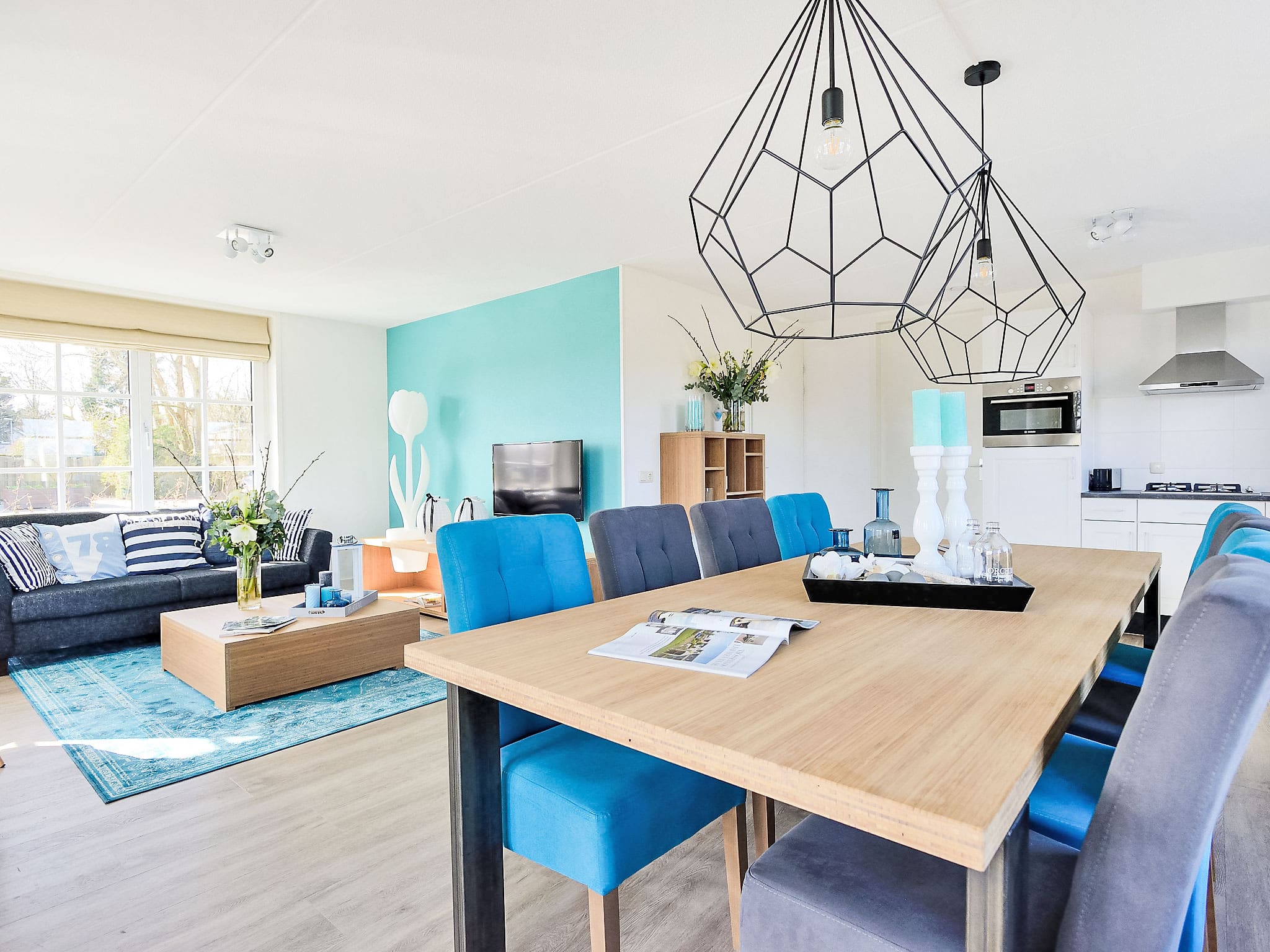 Spread across 160 square metres, this thoughtfully designed villa welcomes up to eight guests in four comfortable bedrooms. The ground floor features an open-plan living and dining area flooded with natural light, where floor-to-ceiling windows frame views of the surrounding countryside. The space flows seamlessly from the welcoming entrance hall through to the contemporary living room, complete with international satellite television and comfortable seating for the entire family.