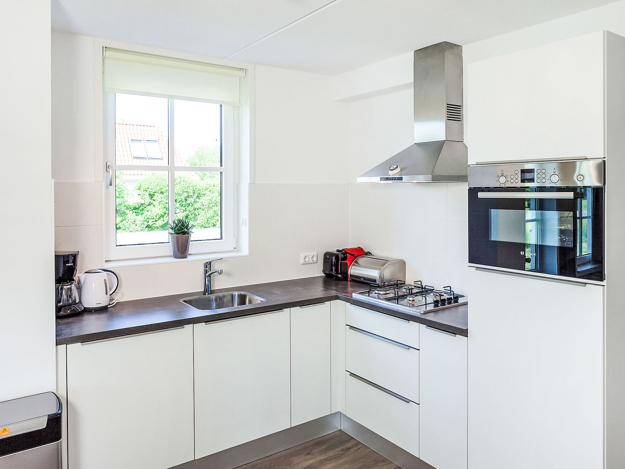 The villa’s intelligent layout maximizes space and natural light across its thoughtfully designed interior. The ground floor welcomes guests through an elegant entrance hall leading to a generous living and dining area, where floor-to-ceiling windows frame views of the surrounding Dutch countryside. The open-plan kitchen features premium appliances including a dishwasher, combination microwave, and electric coffee machine, creating an inviting space for culinary adventures. A ground-floor double bedroom with ensuite shower provides convenient accommodation, while the upper level houses two additional double bedrooms beneath charming sloped ceilings, served by a contemporary bathroom with double basin.