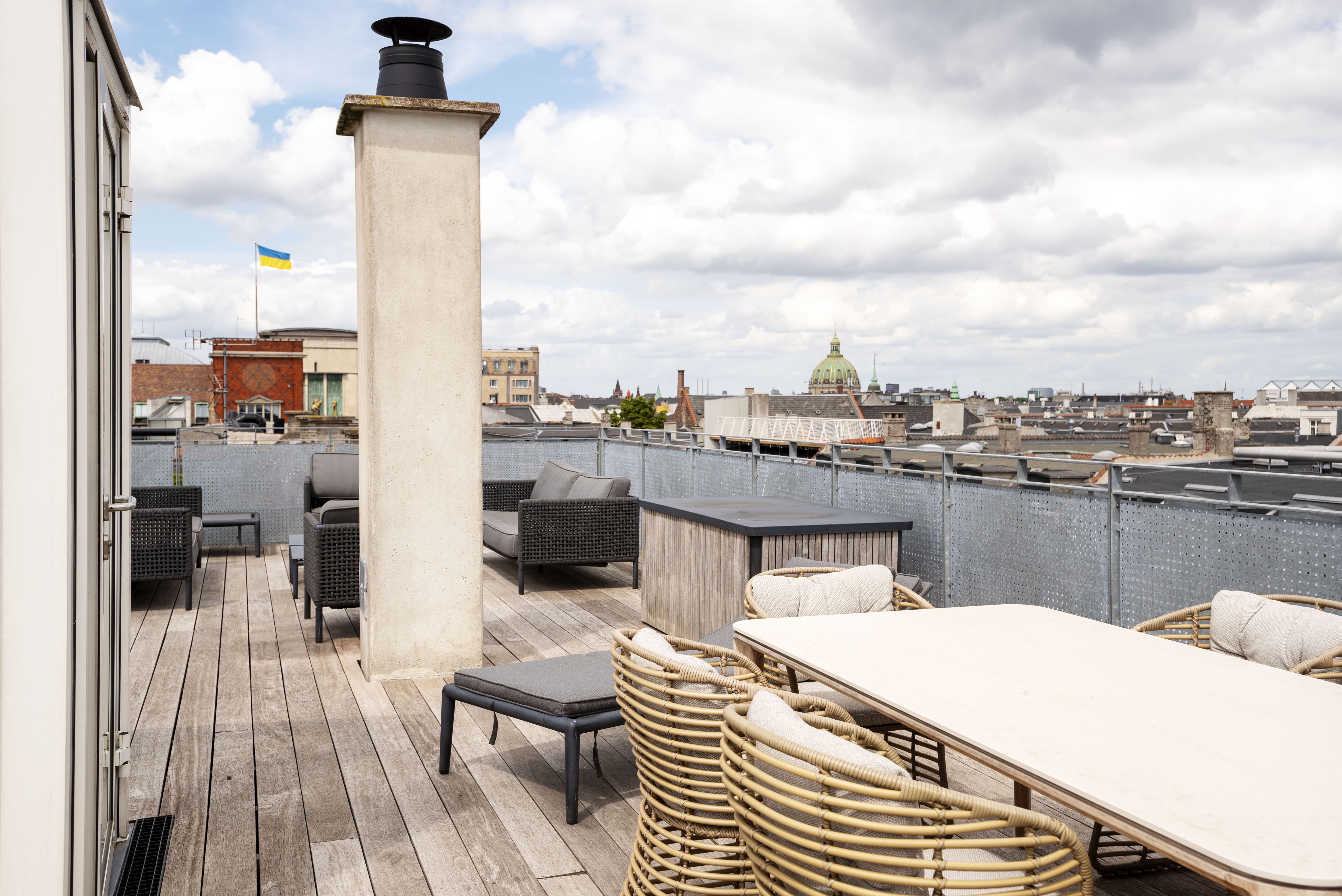 The penthouse boasts a magnificent rooftop terrace, accessible via stairs, where you can enjoy panoramic views of Copenhagen’s iconic skyline. Relax in the nine-person hot tub, or lounge on the sunbeds while soaking up the sun. The terrace also features a cozy lounge area, ideal for al fresco dining or evening cocktails under the stars.