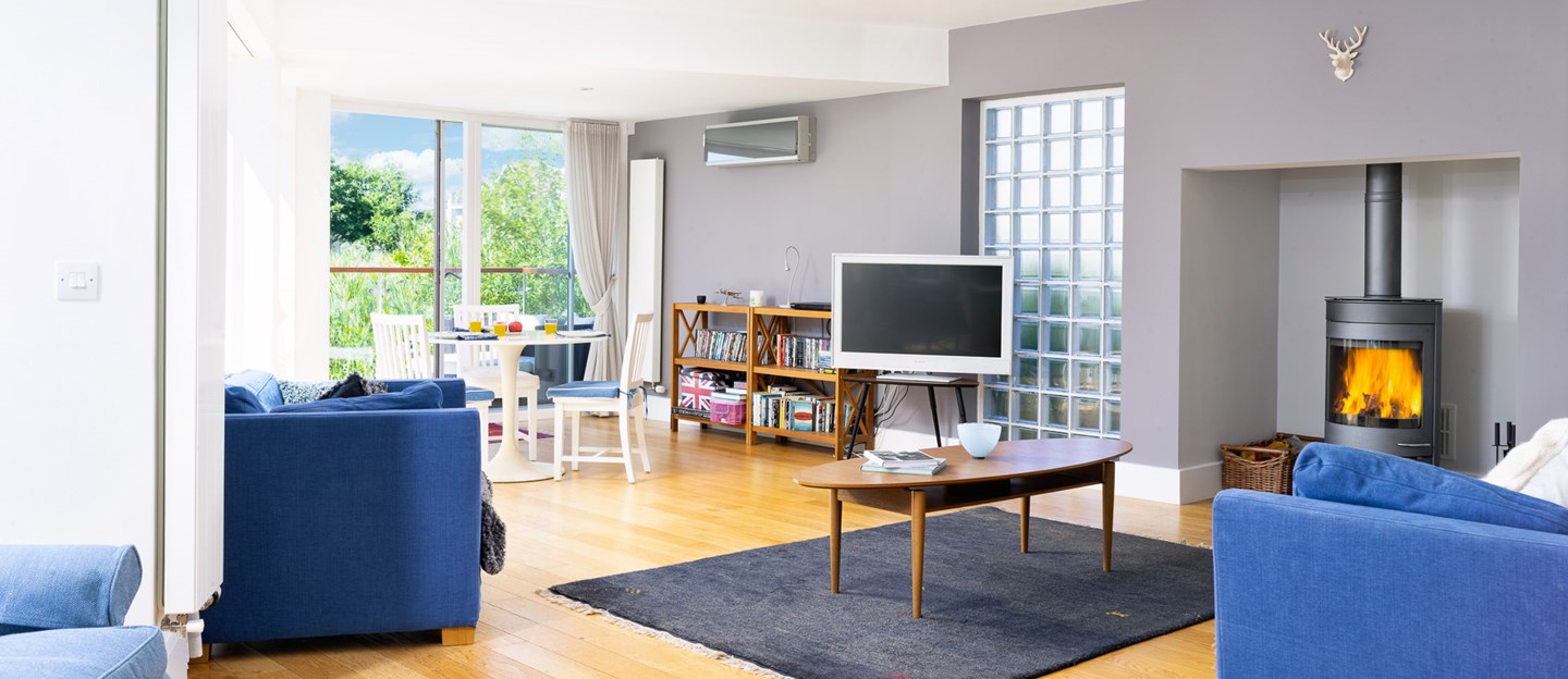 Poplar House is accessed via a small footbridge which leads you to the front door. The house benefits from a lovely westerly facing aspect over the tranquil Howells Mere Lake. Poplar House is built over two floors with open plan living spaces on the ground floor. The house benefits from almost fully glazed side and rear elevations taking full advantage of the sensational lake views. With so much glass, the living spaces are illuminated beautifully and feel light and airy. There are gorgeous, warm wooden floors throughout. The interior is incredibly stylish with wonderful, comfortable furnishings. The decor is mainly white, grey and blue with lovely added colour accents. A variety of sofas, love seats and chairs surround the modern log burner and enjoy the spectacular views. A television and a selection of DVD’s are provided for your entertainment. There is also a small round table, perfect for playing cards or family board games. Close to the kitchen area and with doors to the decked terrace, the dining area also benefits from floor-to-ceiling glass doors and windows. This house dazzles in sunlight! The kitchen is fantastic with masses of glossy white cupboards, wonderful appliances and a central island with stools. The whole living space is incredibly social, perfect for large groups. There is also a handy cloakroom which is also home to the washing machine and dryer. The ground floor deck offers alfresco dining with a view and a top-notch gas barbecue.