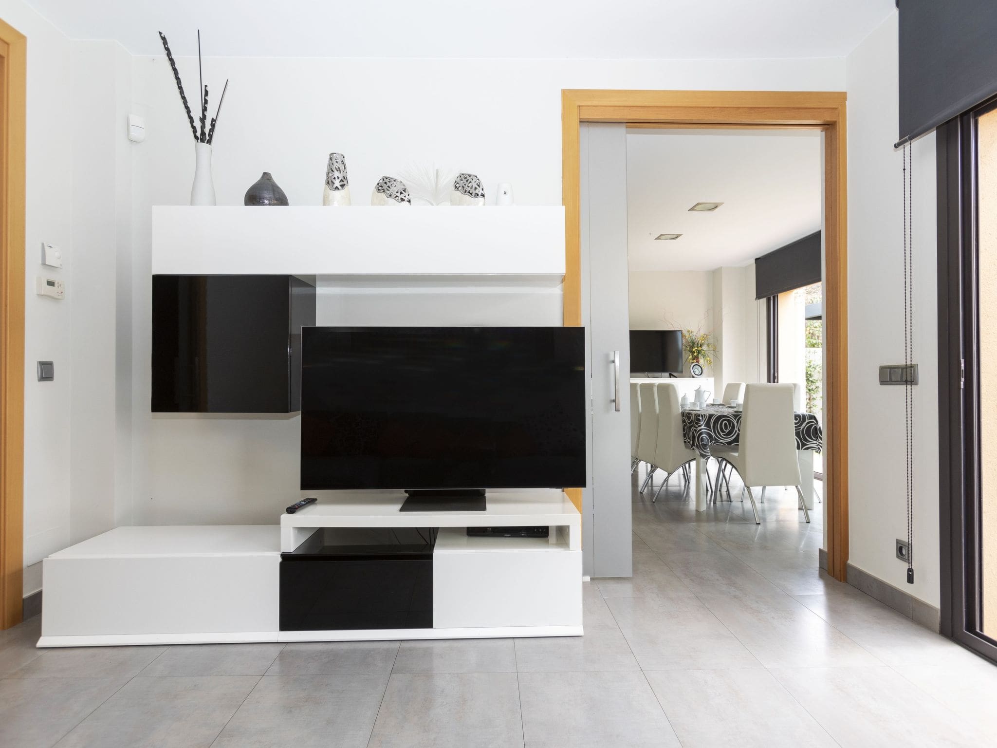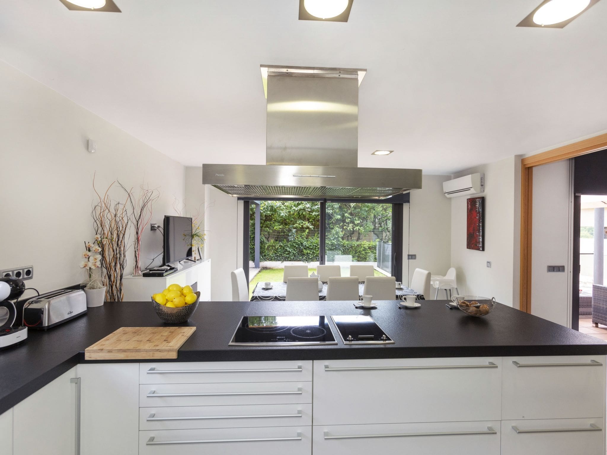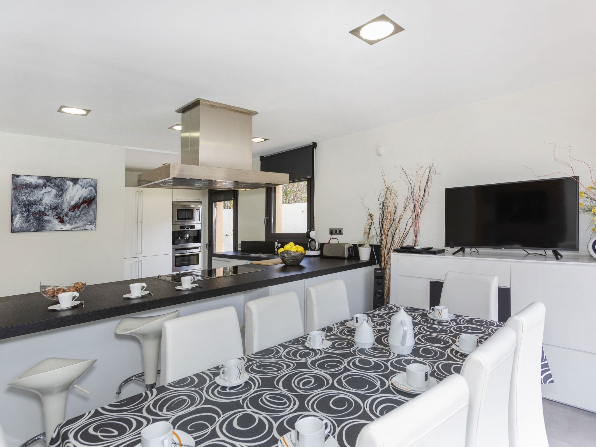 The property unfolds across multiple thoughtfully designed levels, beginning with an open-plan living and dining area that features digital television, gas heating and air conditioning throughout. Floor-to-ceiling windows frame the stunning mountain vistas while flooding the space with natural light. The modern kitchen, equipped with premium appliances including a dishwasher, ceramic hob, microwave and coffee machine, opens directly onto the patio, creating an effortless indoor-outdoor living experience.