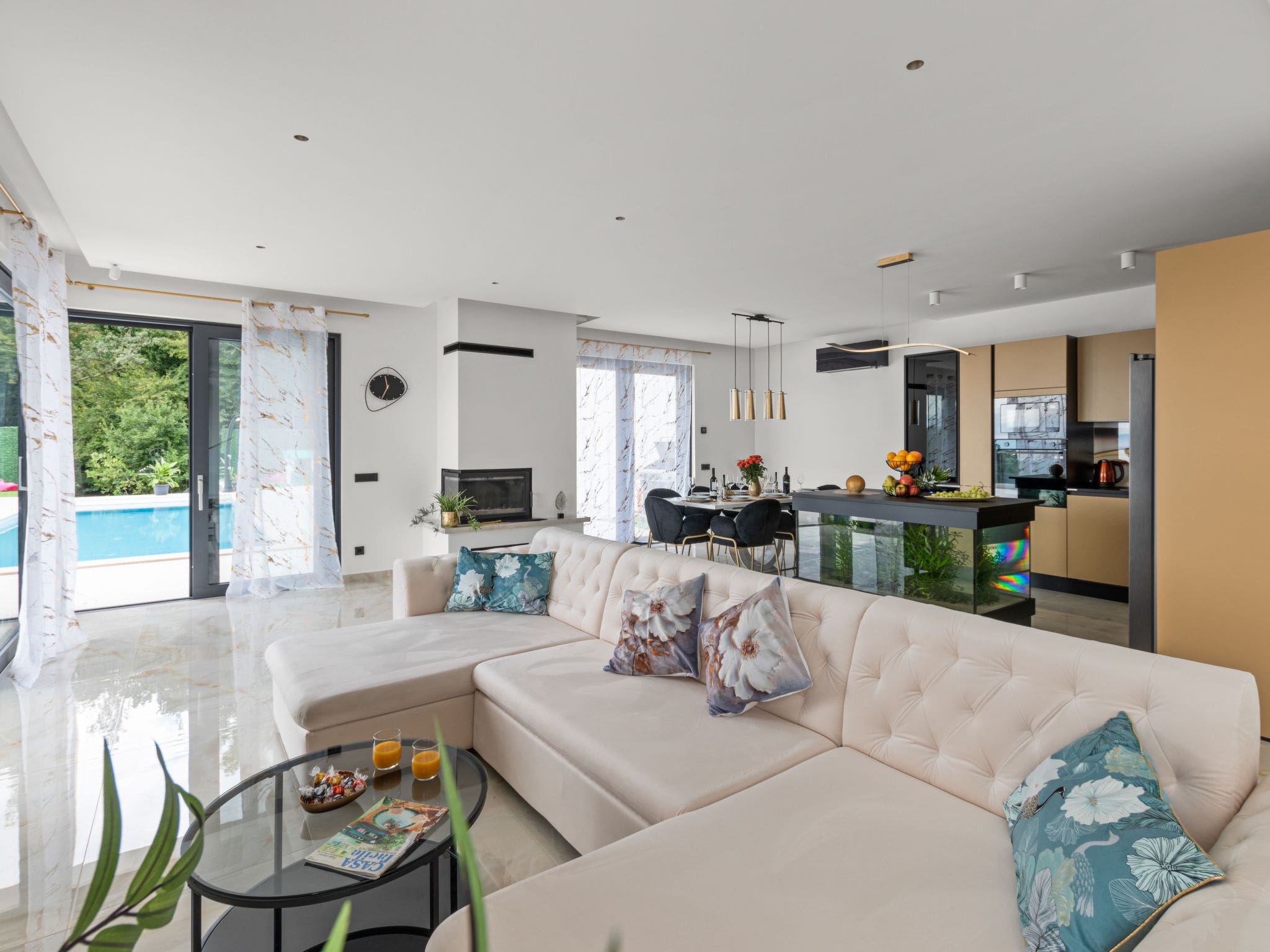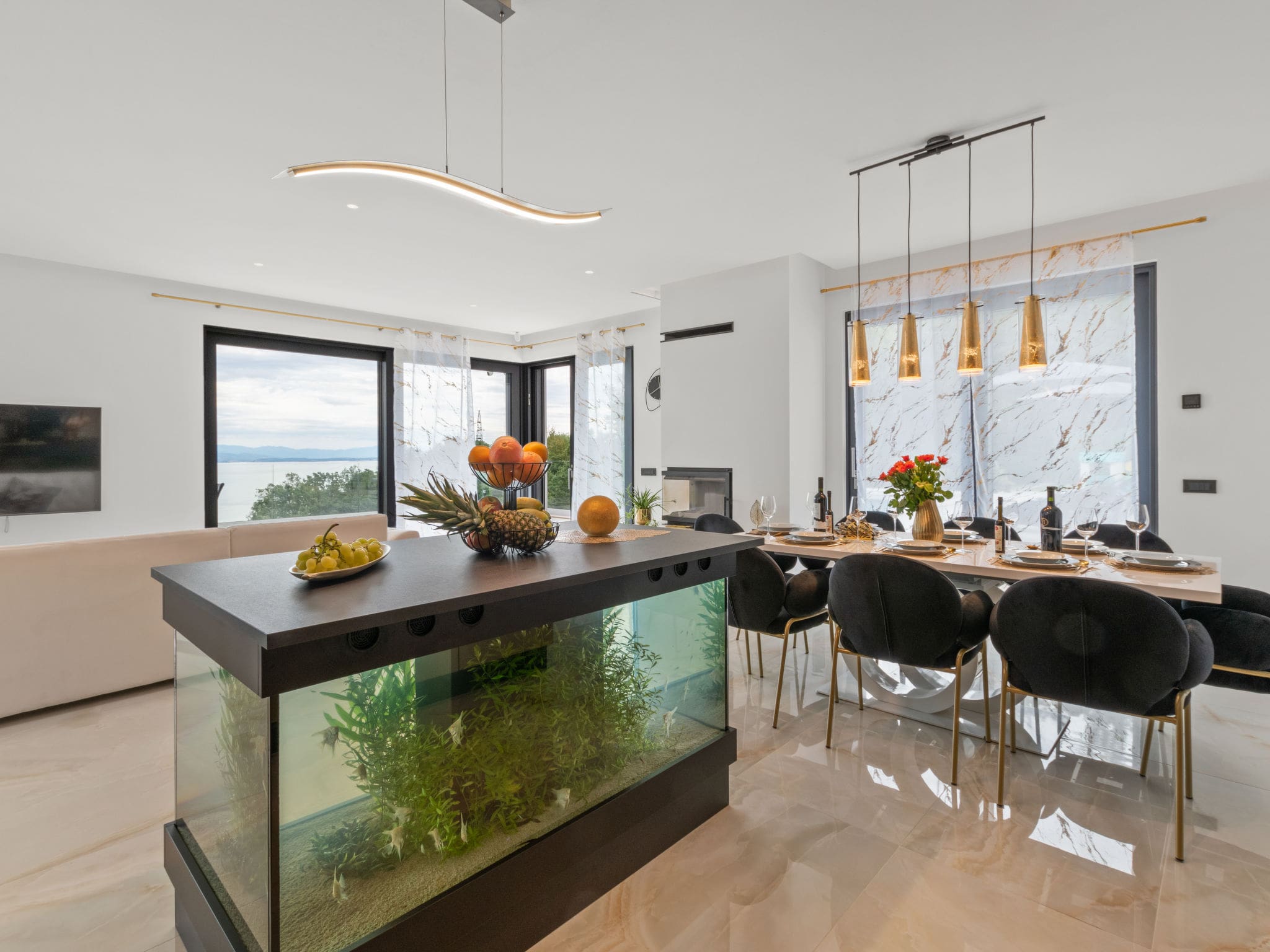 The property’s interior design showcases clean lines and premium finishes throughout both levels. The ground floor features an impressive open-plan living and dining area spanning 70 square metres, dominated by panoramic windows that frame spectacular Adriatic views. The space flows seamlessly from the comfortable seating area, complete with decorative fireplace and satellite television, to the fully equipped modern kitchen featuring induction cooking, dishwasher, and premium appliances including an electric coffee machine for morning rituals.