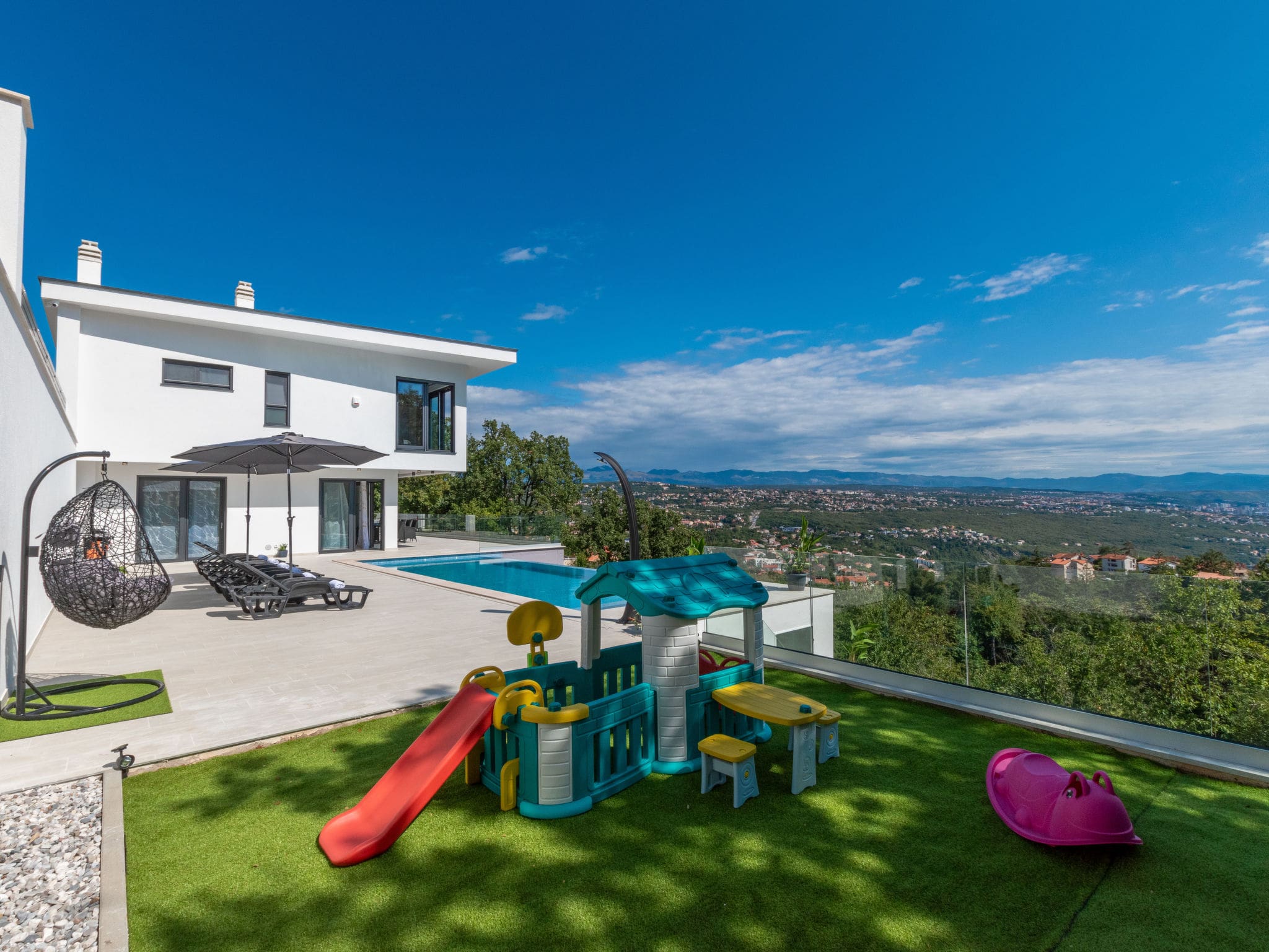 The 1,720-square-metre private grounds include carefully maintained gardens, a children’s playground for younger guests, and a barbecue area for al fresco dining. Six deck chairs invite lazy afternoons by the pool, while the elevated position ensures privacy and uninterrupted views across the coastline.