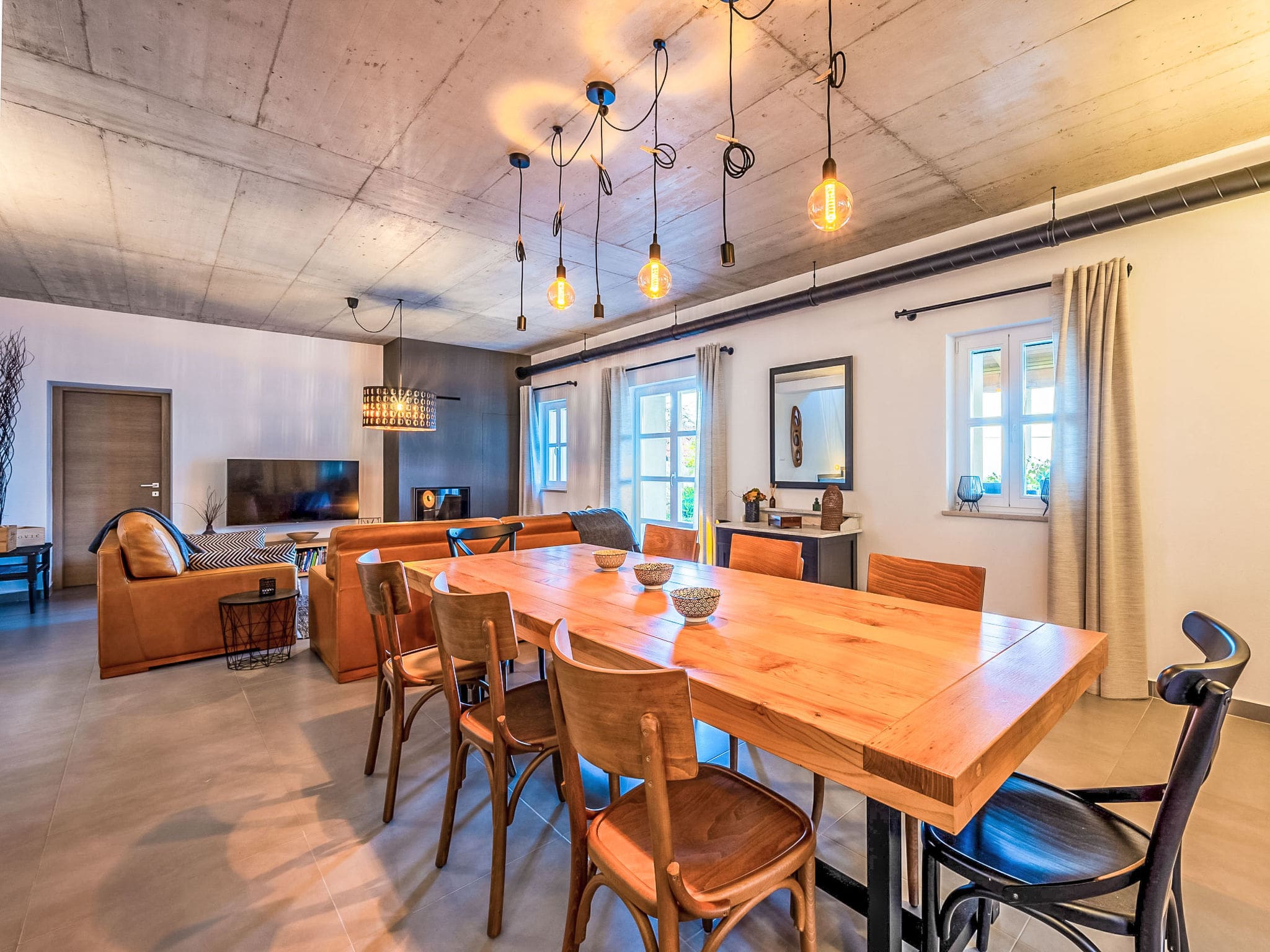 Spread across two thoughtfully designed levels, this exceptional villa accommodates up to eight guests in supreme comfort. The ground floor welcomes you with an expansive living and dining area anchored by an elegant open-hearth fireplace, where floor-to-ceiling windows frame stunning vistas of the Adriatic Sea. Air conditioning ensures year-round comfort throughout the main living spaces.
