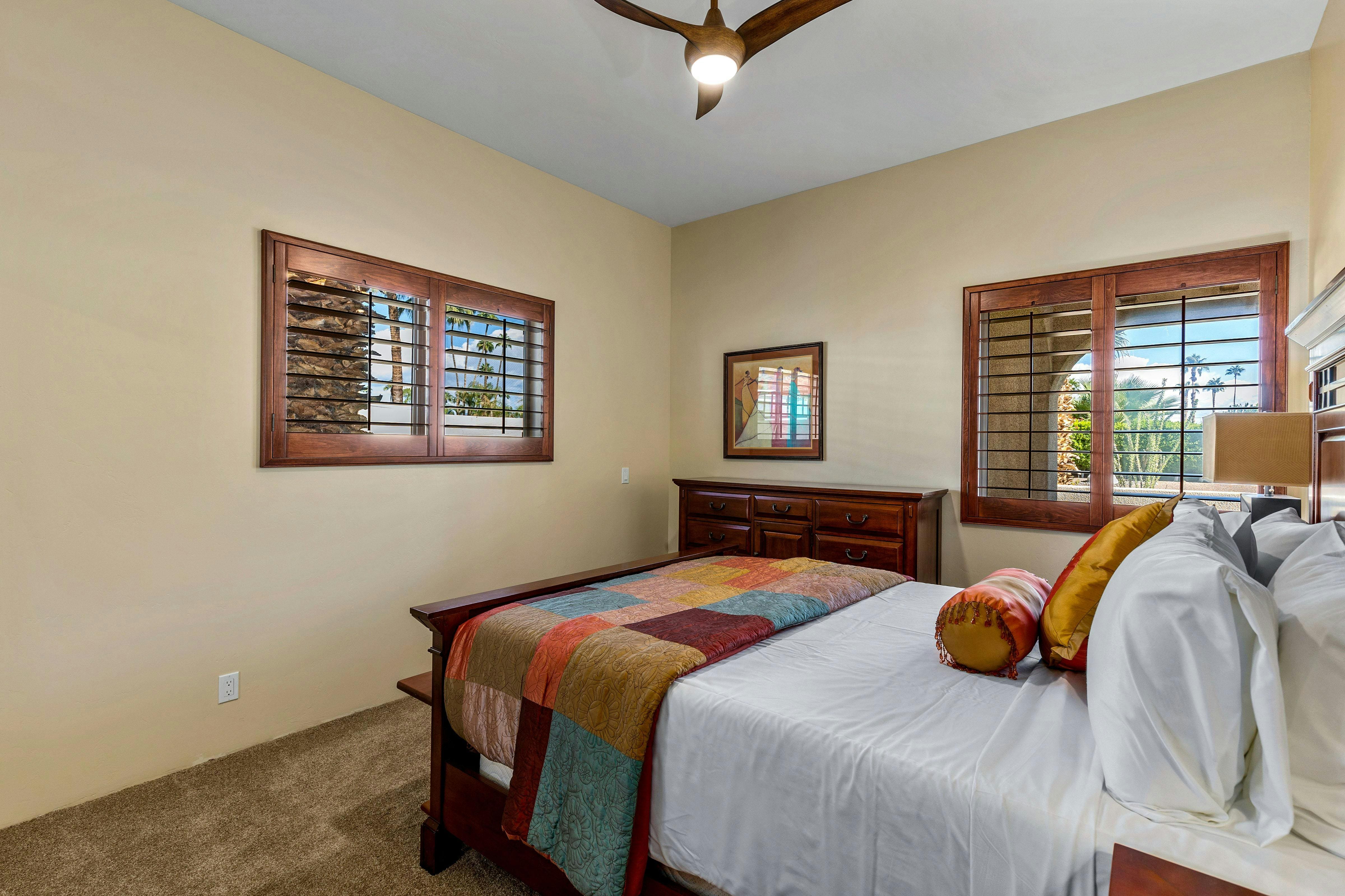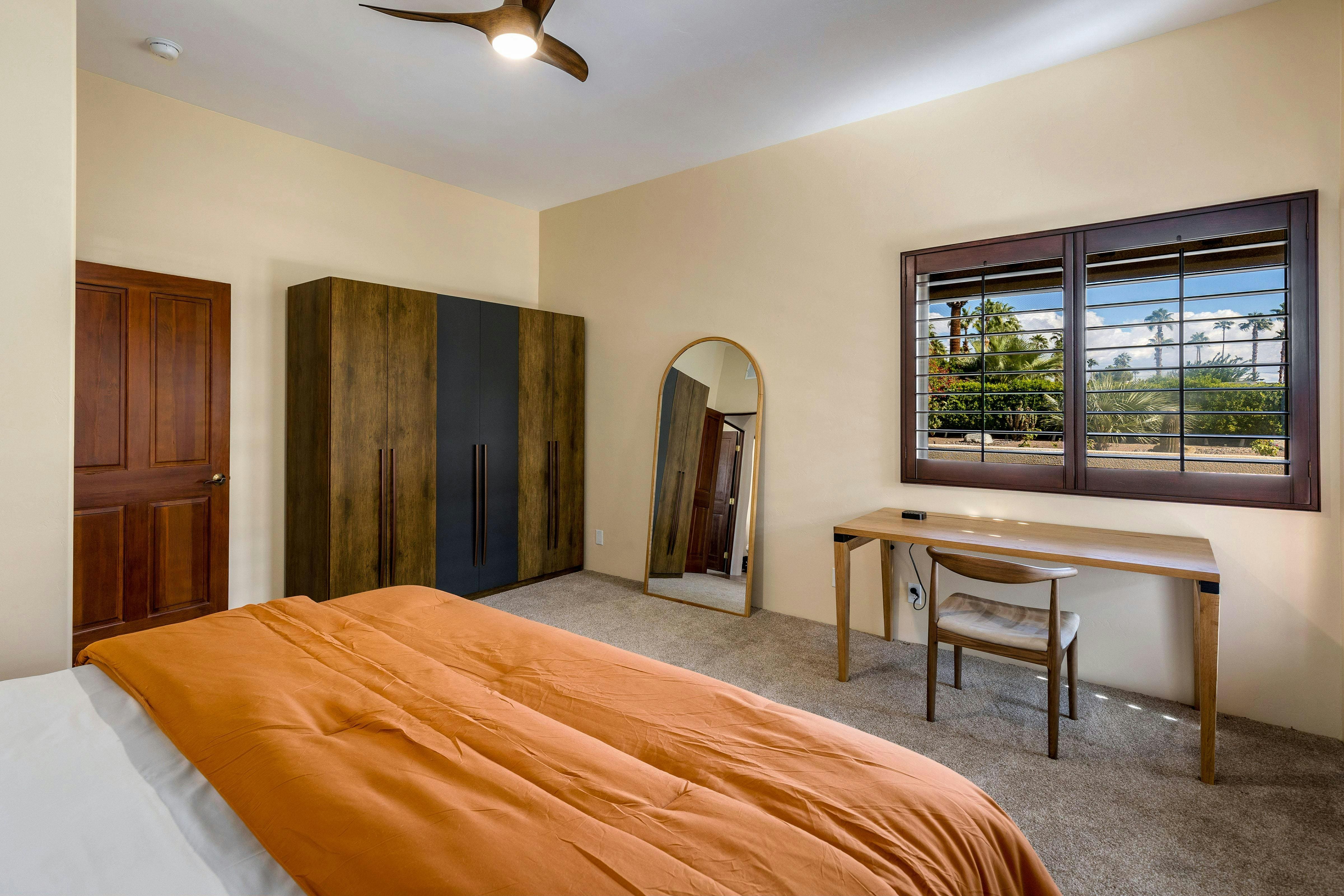 The villa’s outdoor spaces are a true highlight, offering a walled garden and a heated pool complete with a waterfall spa. Enjoy al fresco dining under the stars or relax by the fire pit with a drink from the outdoor bar. The putting green adds a touch of fun, while the hot tub promises relaxation at no extra cost. Surrounded by lush greenery, the villa provides a private oasis, perfect for soaking in the breathtaking mountain views unique to Palm Springs.