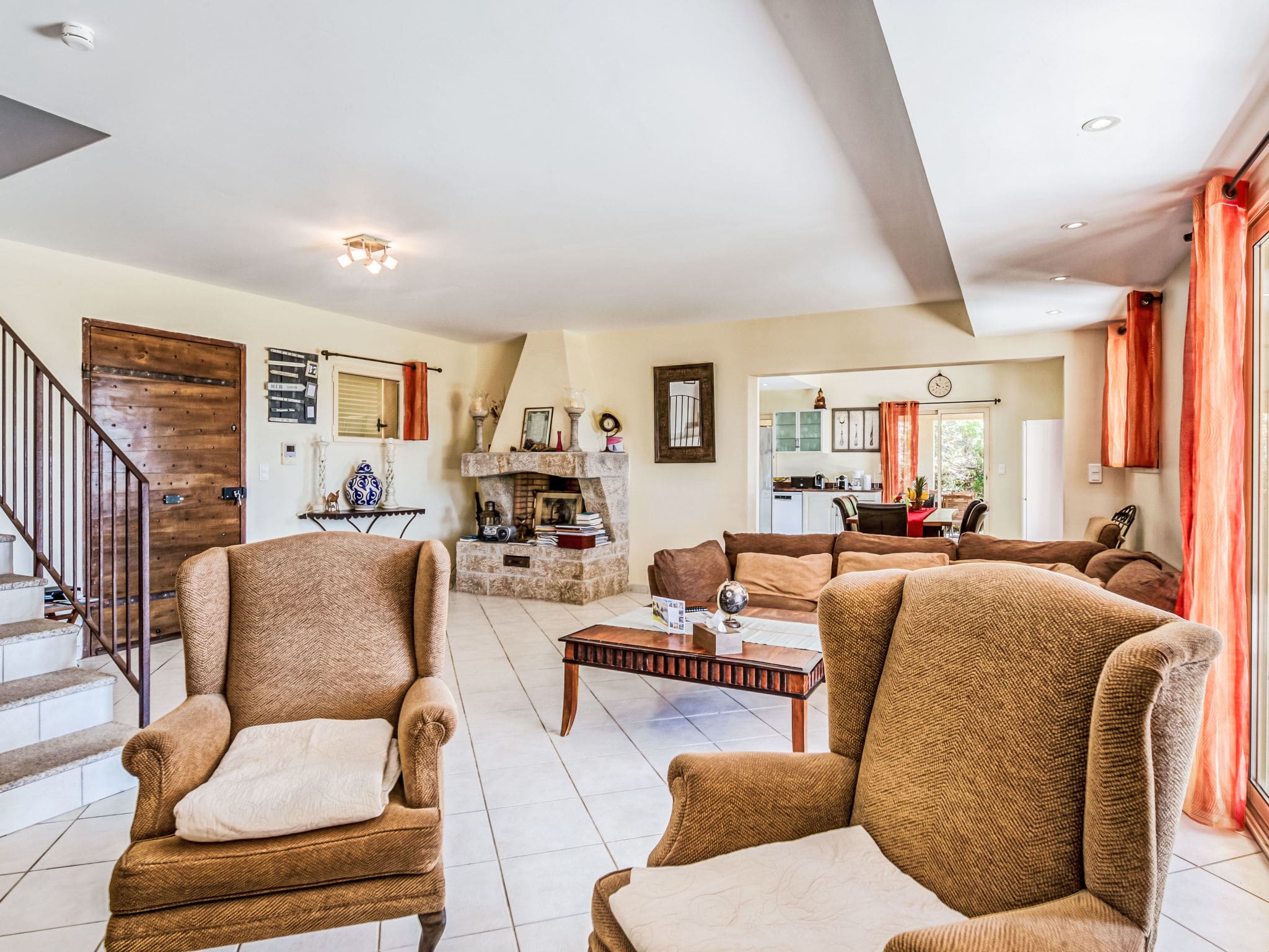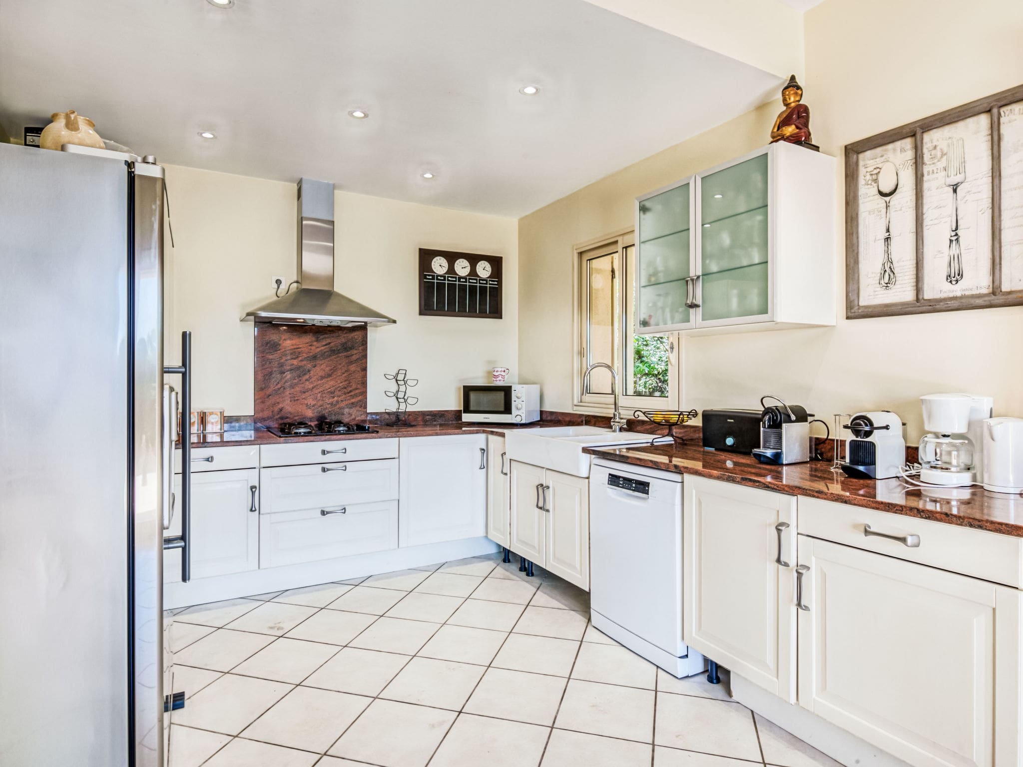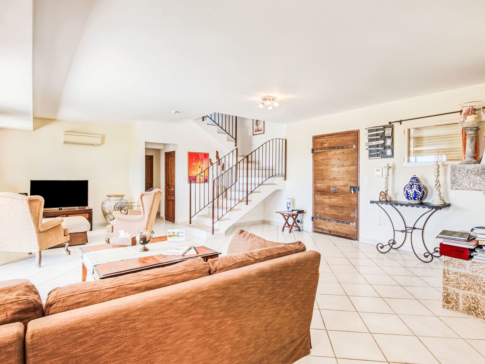 Spanning 250 square metres across two thoughtfully designed levels, the villa accommodates up to nine guests in five beautifully appointed bedrooms, each with its own private bathroom. The ground floor features a generous living and dining area with flat-screen television, flowing seamlessly to outdoor terraces through floor-to-ceiling windows. Three ground-floor bedrooms include two master suites with luxurious French beds and direct terrace access, plus a twin bedroom perfect for children or additional guests. The open-plan kitchen is superbly equipped with professional-grade appliances including dishwasher, microwave, oven and electric coffee machine. Upstairs, the master bedroom opens to a private balcony overlooking the gardens, served by a full bathroom and separate WC. Air conditioning throughout ensures perfect comfort during warm summer months.