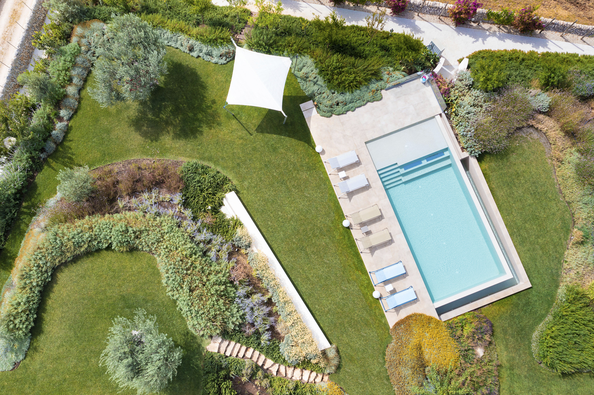 Outside is just as appealing, with landscaped gardens dotted with aromatic trees, plants and flowers. A private pool and poolside terrace with sun loungers is situated in the middle of a grassy lawn and is a beautiful spot to admire the views of the sea in the distance. A patio with comfy seating area and dining table is a lovely place to spend the evening eating, drinking and enjoying each other’s company.