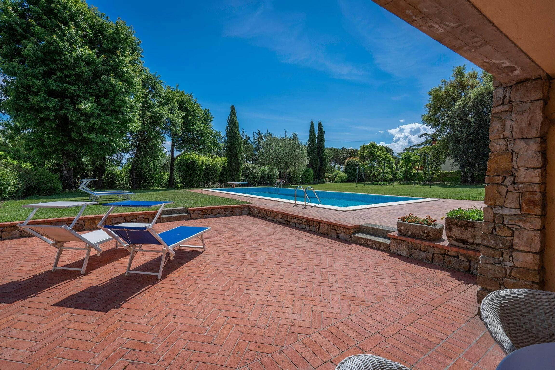 The villa’s outdoor areas are a haven of tranquility, with a pristine swimming pool as its centerpiece. Surrounded by lush gardens, there’s ample space to sunbathe or enjoy alfresco dining on the veranda. The Tuscan countryside provides a picturesque backdrop, enhancing the villa’s serene ambiance.
