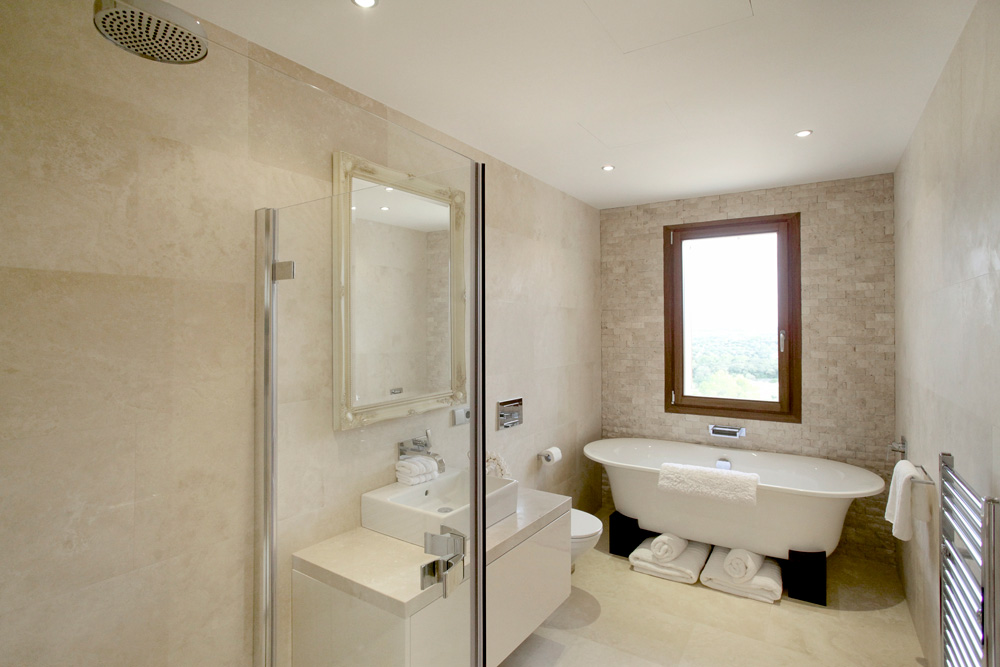 As you enter Villa Aloise it is hard not to be impressed, there is a stunning living/dining room as well as a family TV room. There is also a fully equipped kitchen for your use. There is an en-suite double bedroom on the ground floor as well as a further five bedrooms on the first floor all featuring views over the external grounds and surrounding area. The master bedroom suite, is a spectacular, luxury room, with an open-plan bathroom featuring twin stone bathtubs and a steam room, perfect for a romantic break away to remember.