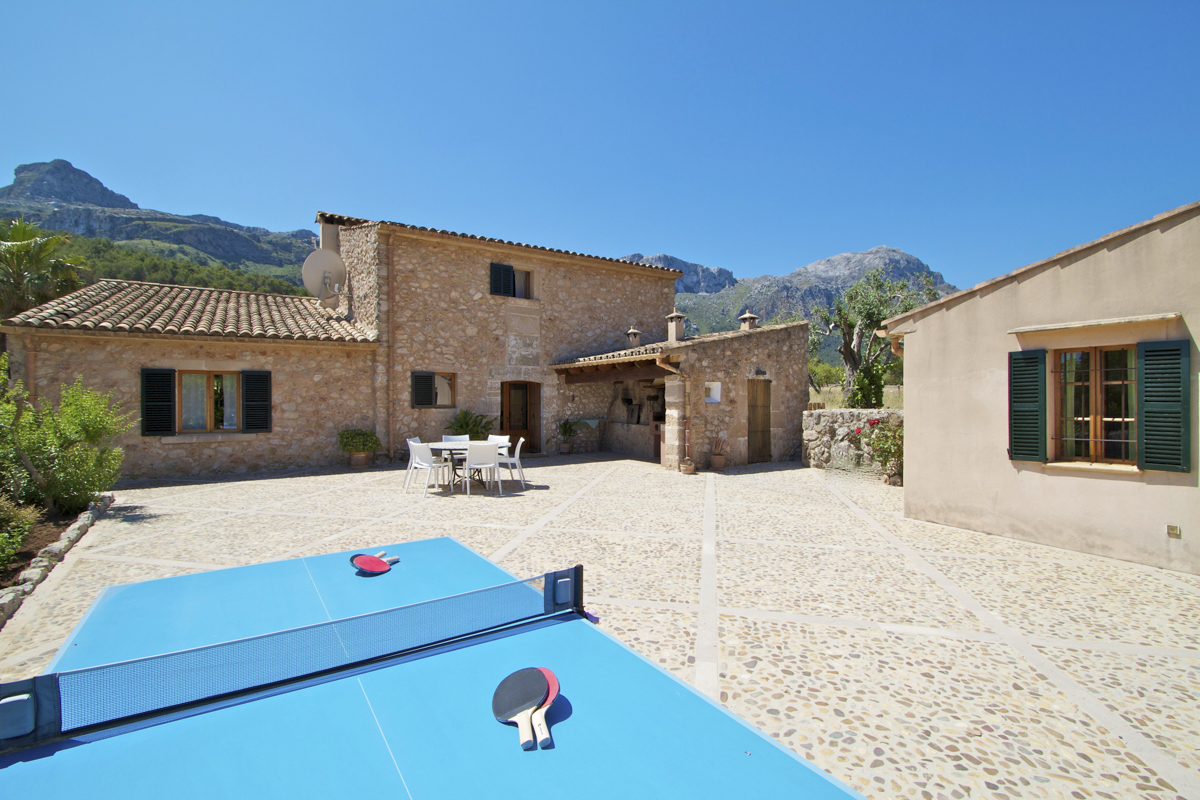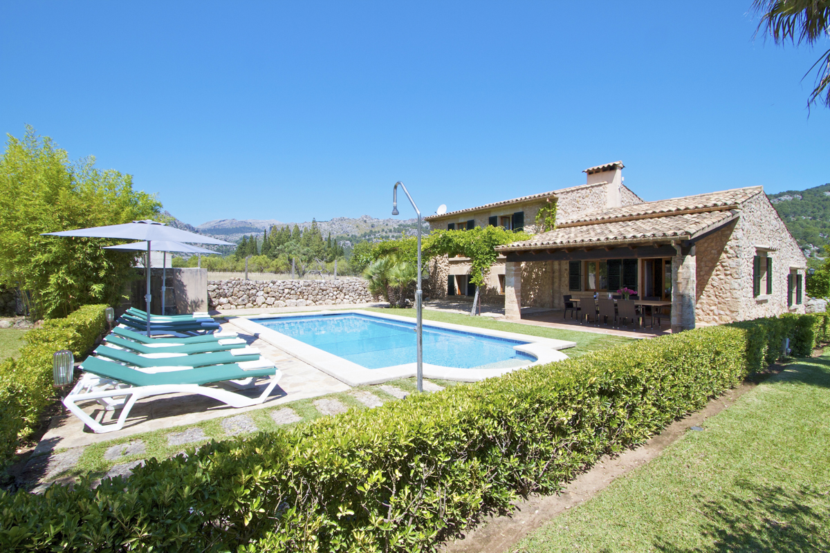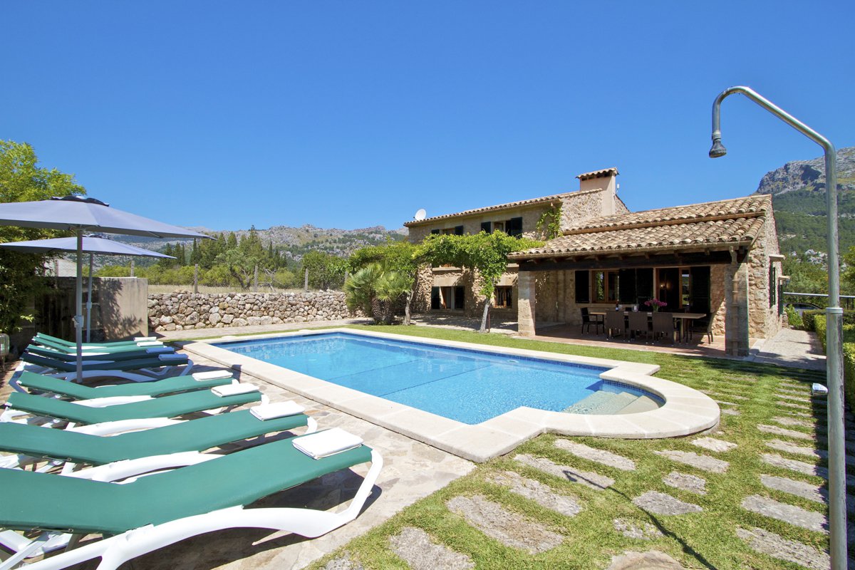 Outside, in the large front garden lined with flowers there’s a great barbeque area for the long summer evenings, and of course, a table tennis table, catering for the competitive ones in the group! On the other side of the house is a vast lawn area, plus a large pool surrounded by loungers allowing you to kick back and indulge in the fiery Mallorcan sun, cooling off intermittently with a dip in the pool, or simply a moment under the handily placed outdoor shower.