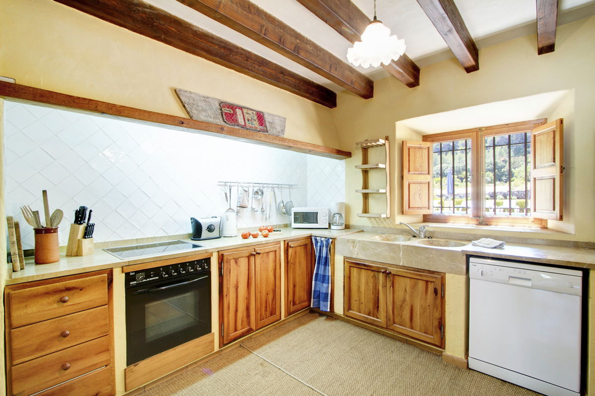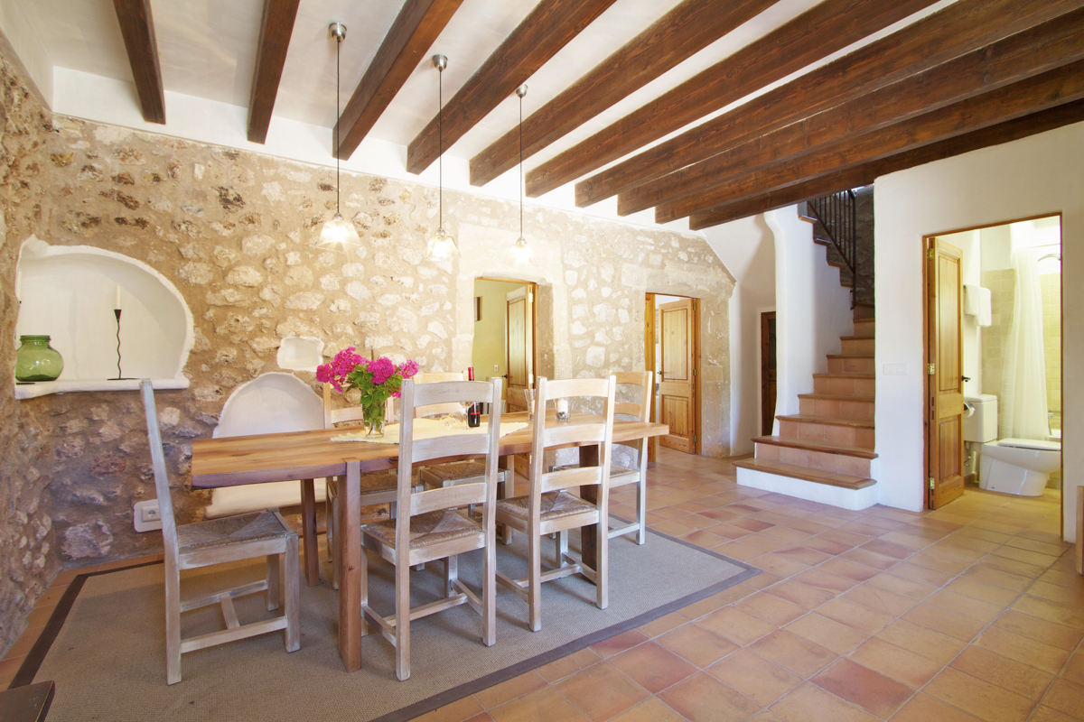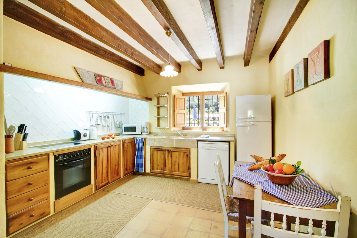 As you step through the threshold, notice that the lovely exterior walls stretch throughout the house, creating a traditional feeling to this lovely rural finca. A fabulous wooden dining area greets you upon entering the house, complete with elegant low hanging lights, and original wooden beams overhead. In the kitchen, also adorned with wonderful wooden beams stretching across the ceiling and built-in wooden cupboards, is everything you need to rustle up a Mediterranean delight. The large windows above the sink allow the light and warmth of the Mallorcan afternoon to flood into the kitchen and fill this wonderful villa with life.