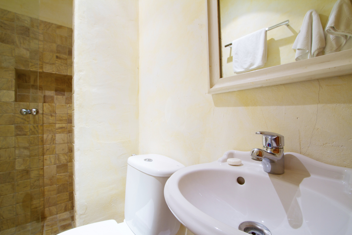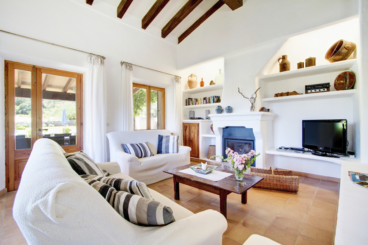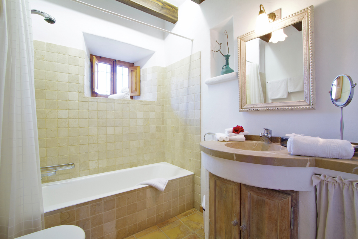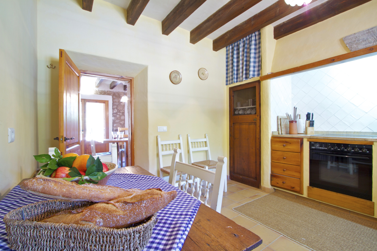 As you step through the threshold, notice that the lovely exterior walls stretch throughout the house, creating a traditional feeling to this lovely rural finca. A fabulous wooden dining area greets you upon entering the house, complete with elegant low hanging lights, and original wooden beams overhead. In the kitchen, also adorned with wonderful wooden beams stretching across the ceiling and built-in wooden cupboards, is everything you need to rustle up a Mediterranean delight. The large windows above the sink allow the light and warmth of the Mallorcan afternoon to flood into the kitchen and fill this wonderful villa with life.