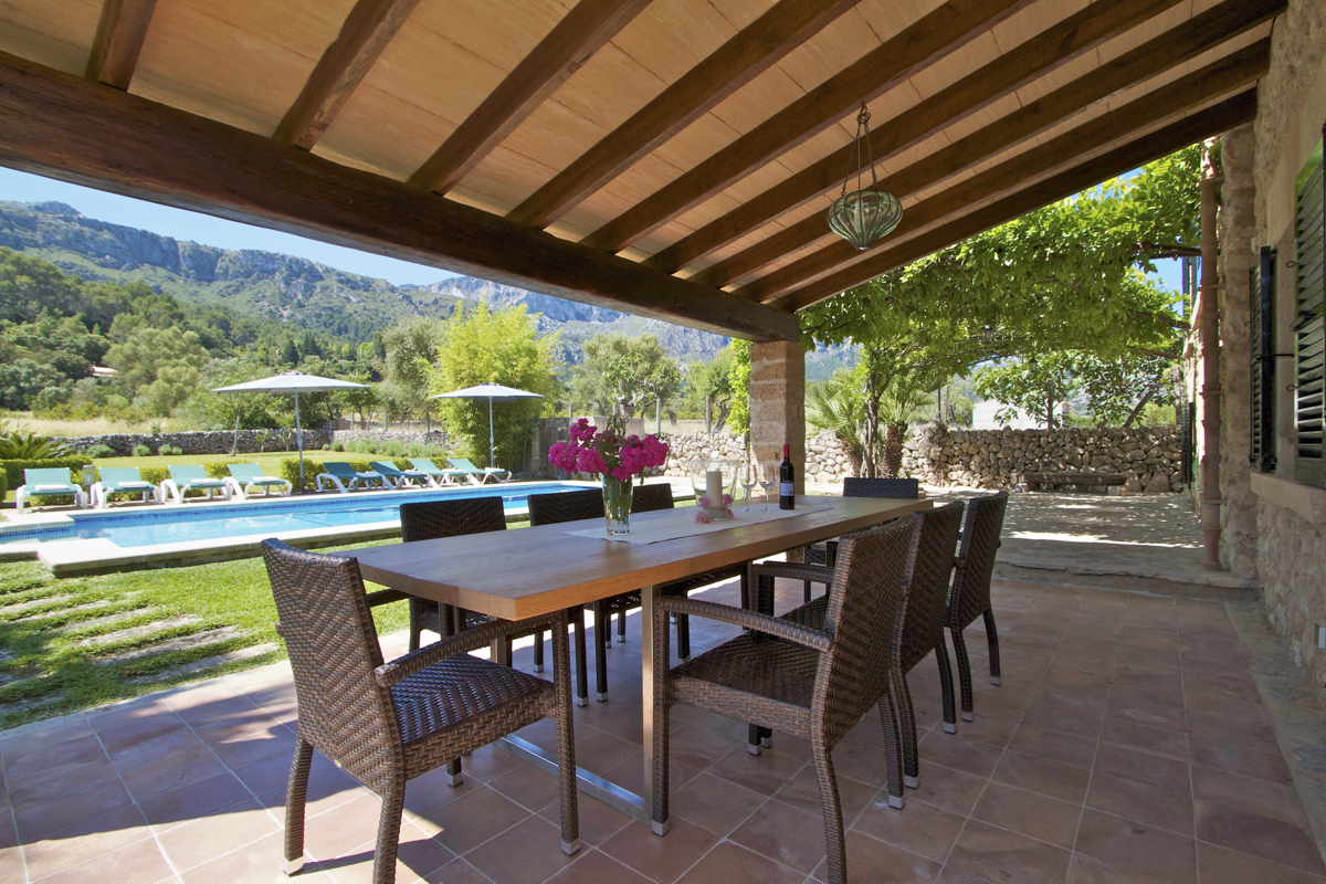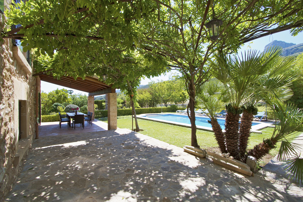 If you’re looking to enjoy the warmth of the weather without the risk of getting burnt, step under the large veranda and into the shade of the tree-lined terrace area, with a large table for dining or simply sipping a drink and admiring the sunset out over the nearby hills. With a garden filled with all kinds of trees and plants, you’ll feel totally grounded and calm settling down in this stunning Mallorcan landscape.